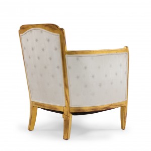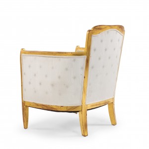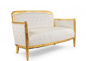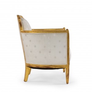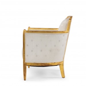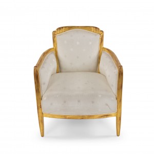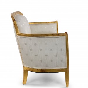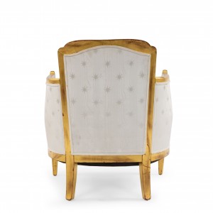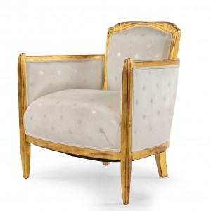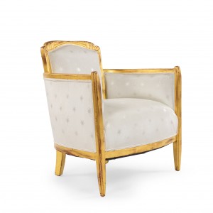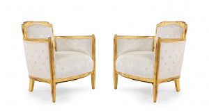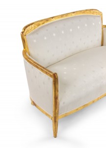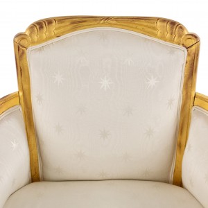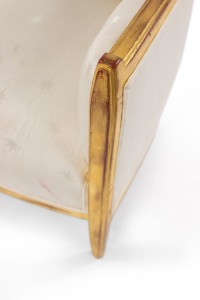 SET of 3 French Art Deco gilt salon set with low back design and carved scalloped & fluted design on back with white star upholstery. (Available individually: Settee: 060119A, 2 armchairs: 060119B)