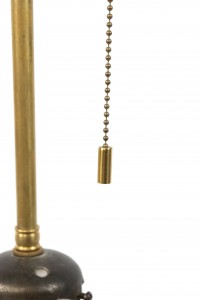 French Art Deco table lamp with frosted glass geometric design resting on a round iron base.
