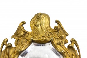 French Art Nouveau bronze dore hand mirror with female head and floral design.