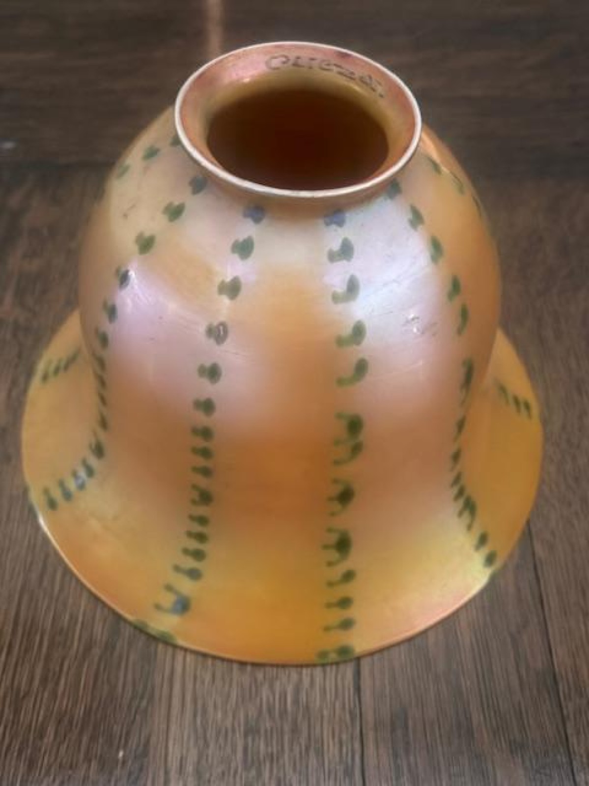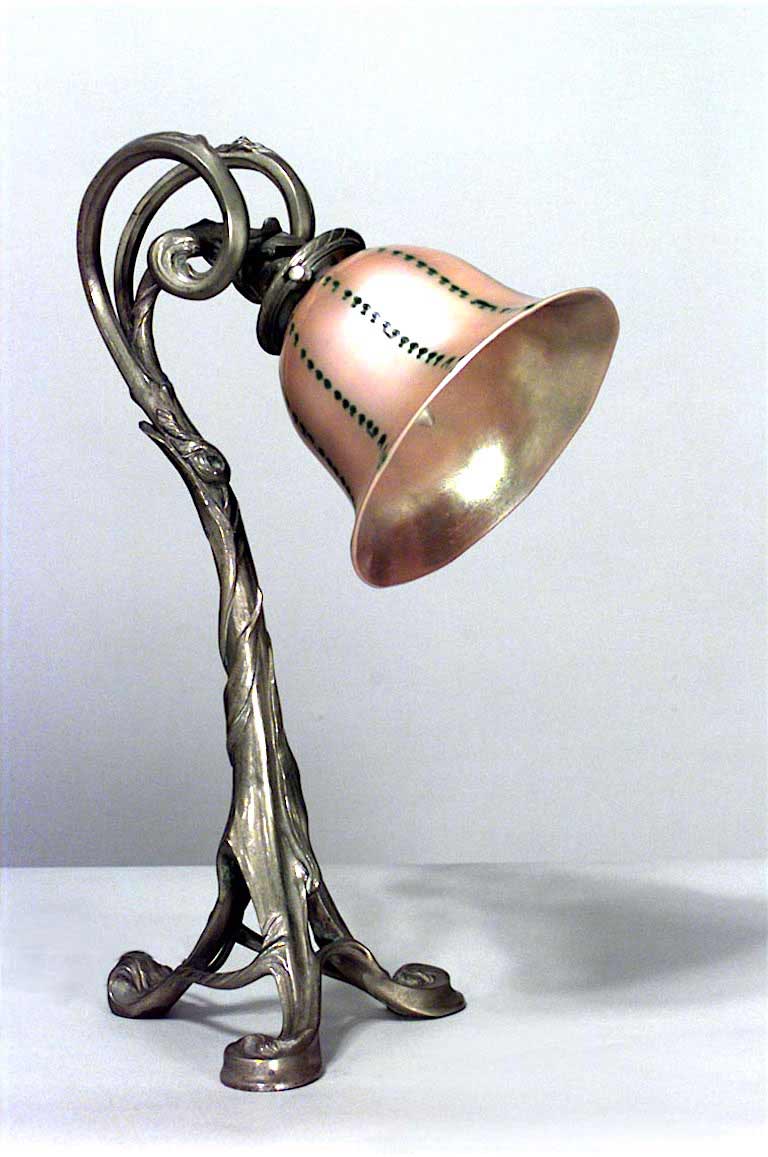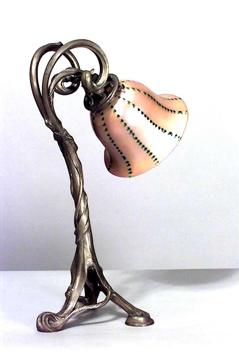 French Art Nouveau bronze table lamp with a double scroll top supporting an amber striped glass shade and resting on base of 3 feet (shade signed: QUEZEL)
