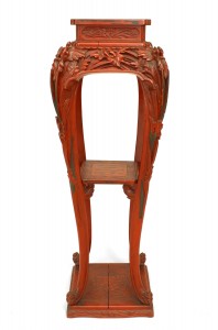 French Art Nouveau style red lacquered Japanese style 2 shelf pedestal with floral carving and square top.