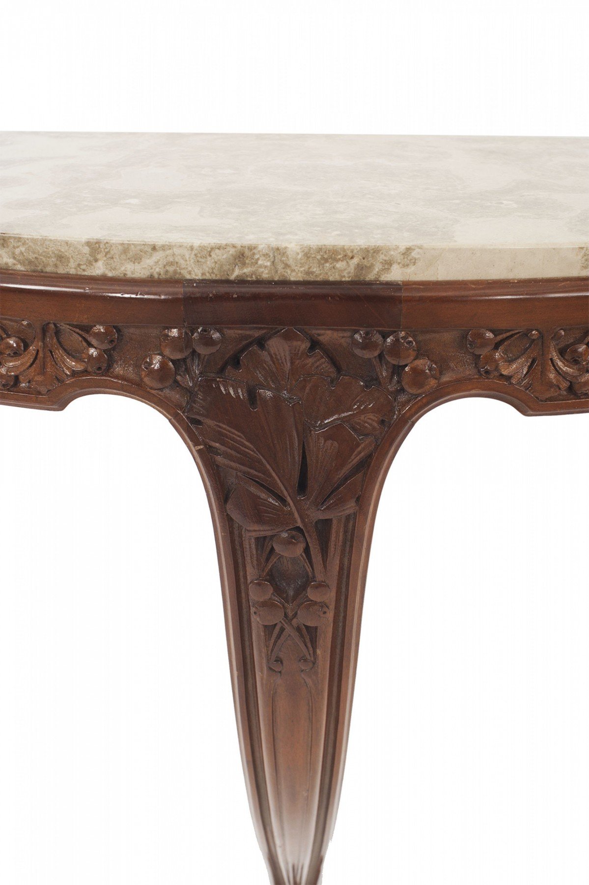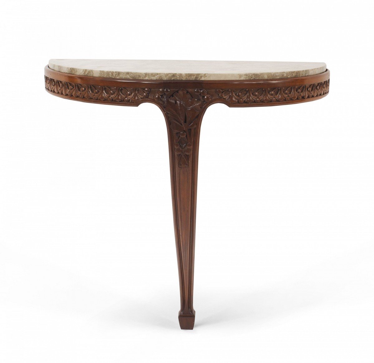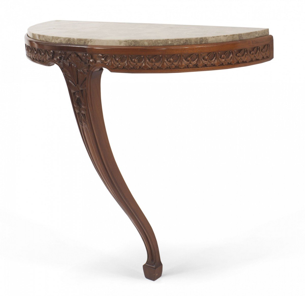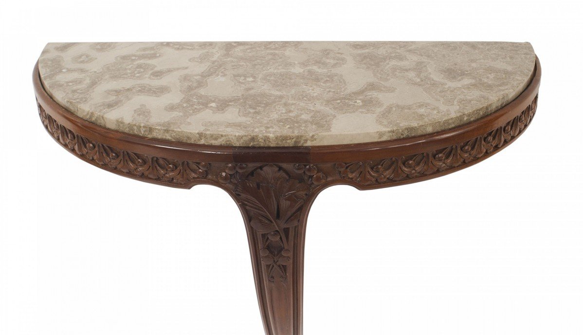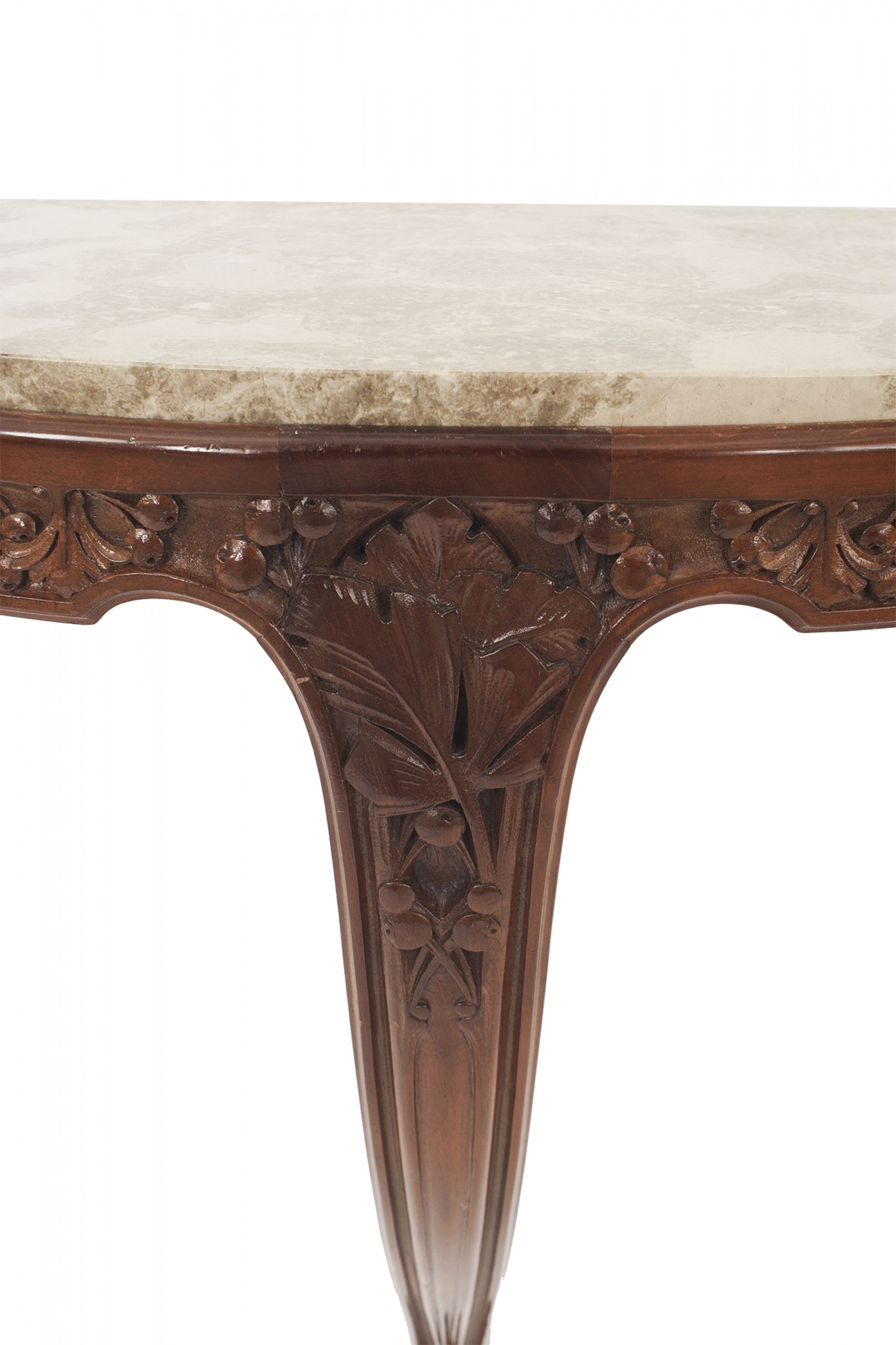 2 French Art Nouveau mahogany bracket console tables with a floral carved apron supported on a single leg with "D" shaped yellow marble top (PRICED EACH)