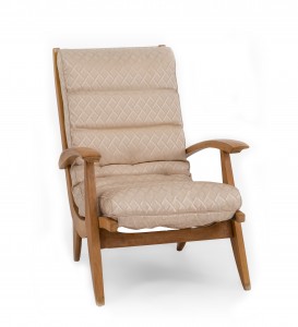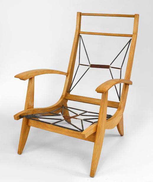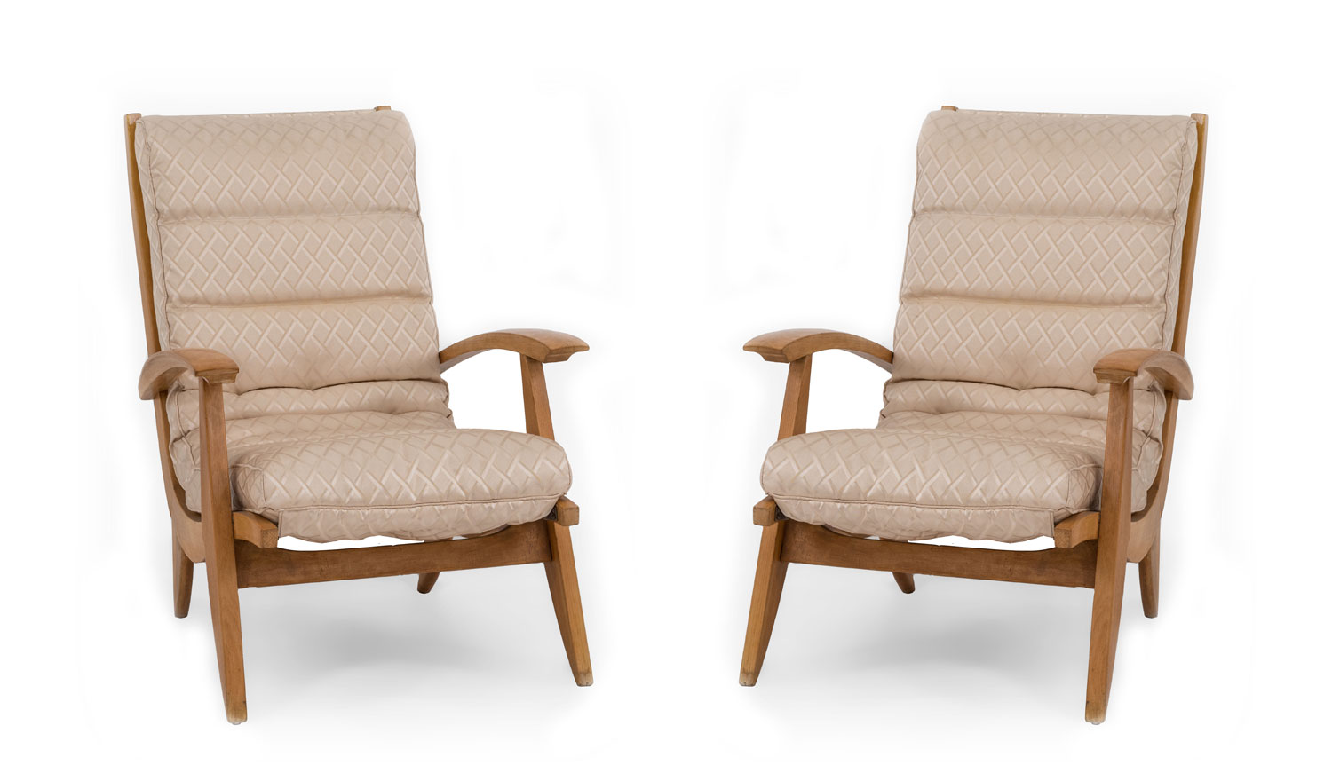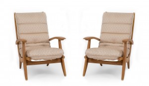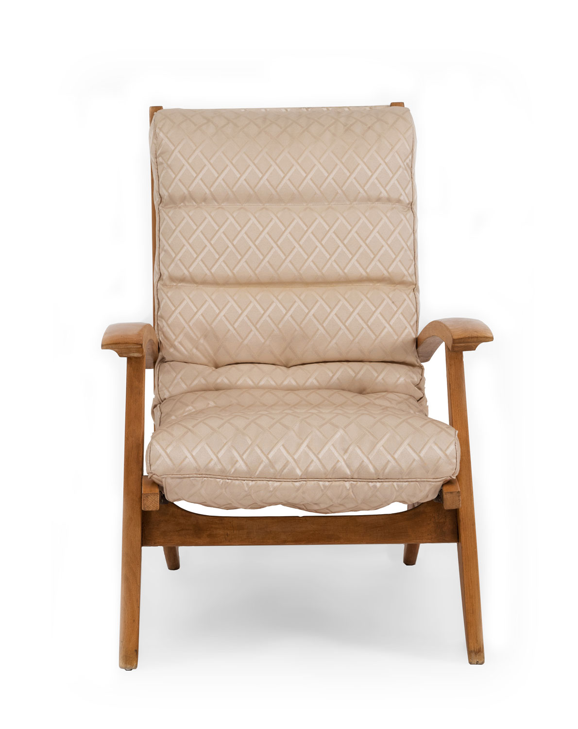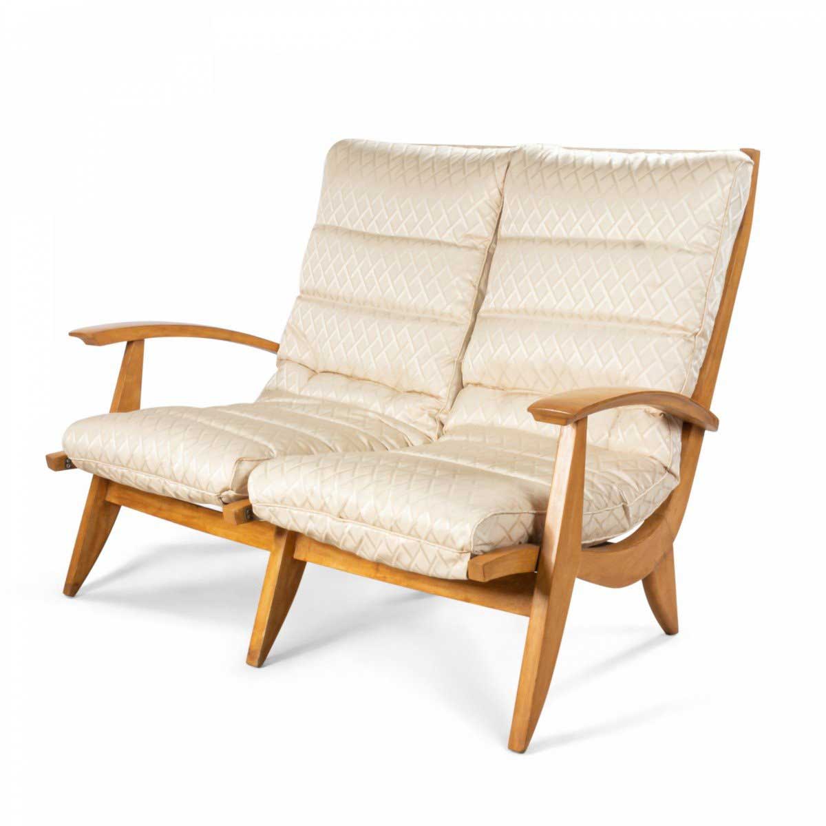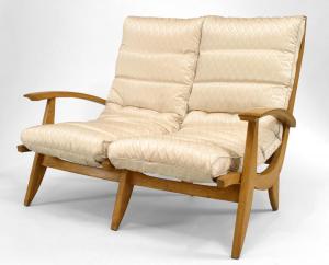 SET of 3 French 1950s beechwood living room / salon set with contoured ribbed upholstery & spring supports (Loveseat: 51"w (PRICED AS SET)