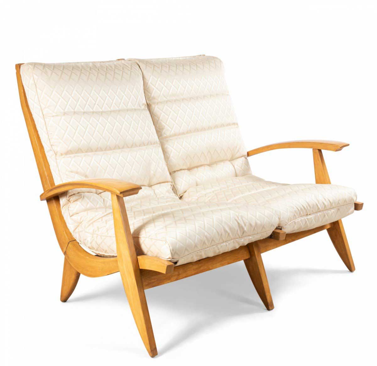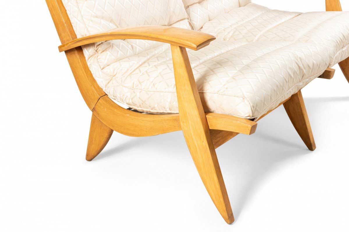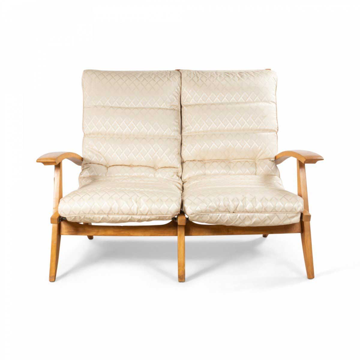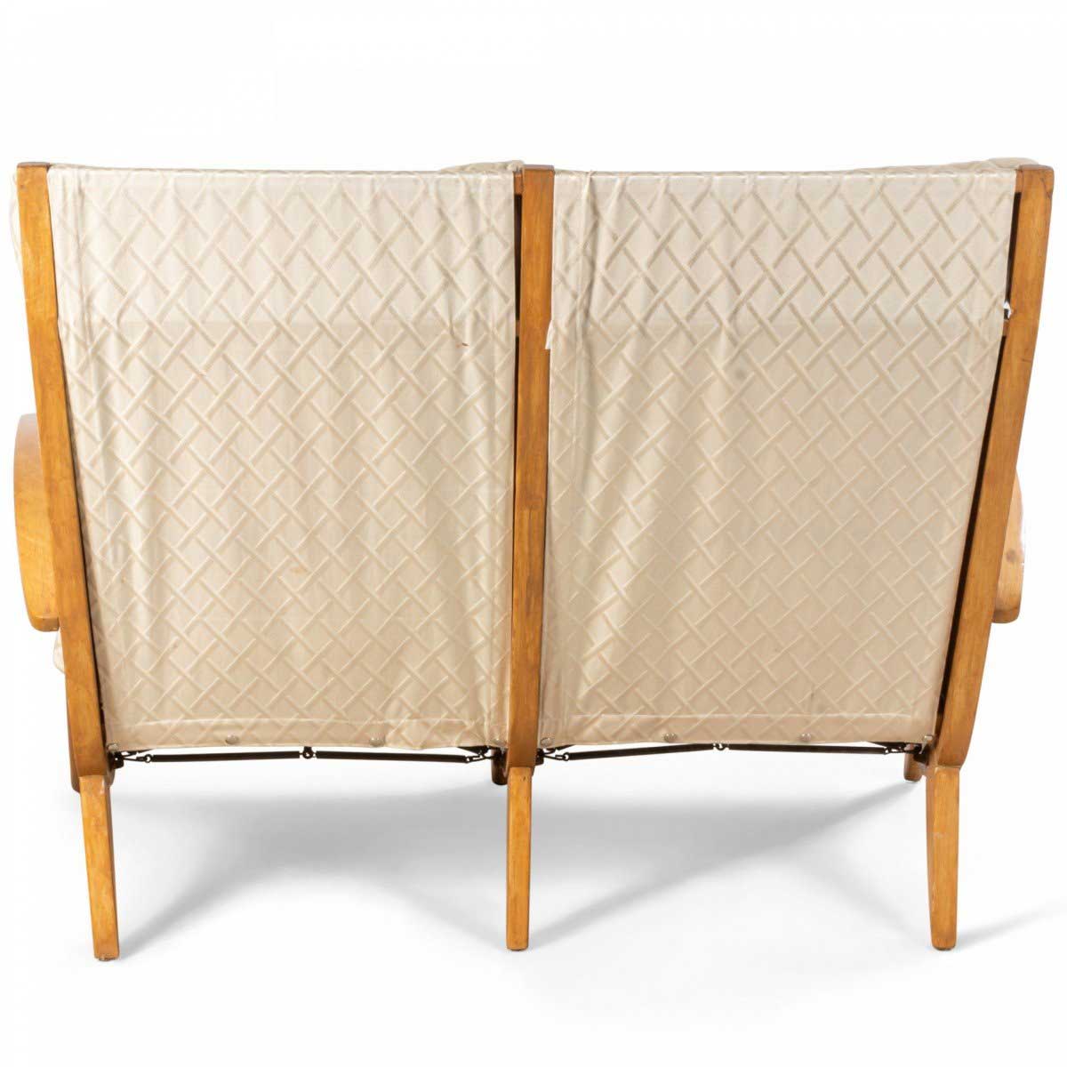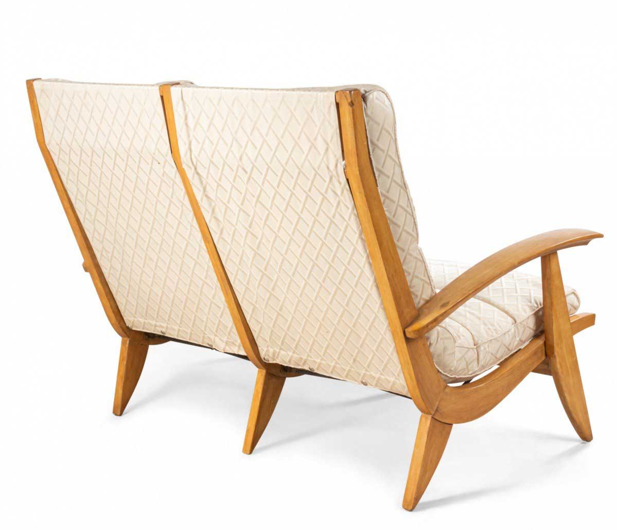 French 1950s beechwood loveseat with contoured ribbed upholstery & spring supports (2 matching armchairs: 059650B)