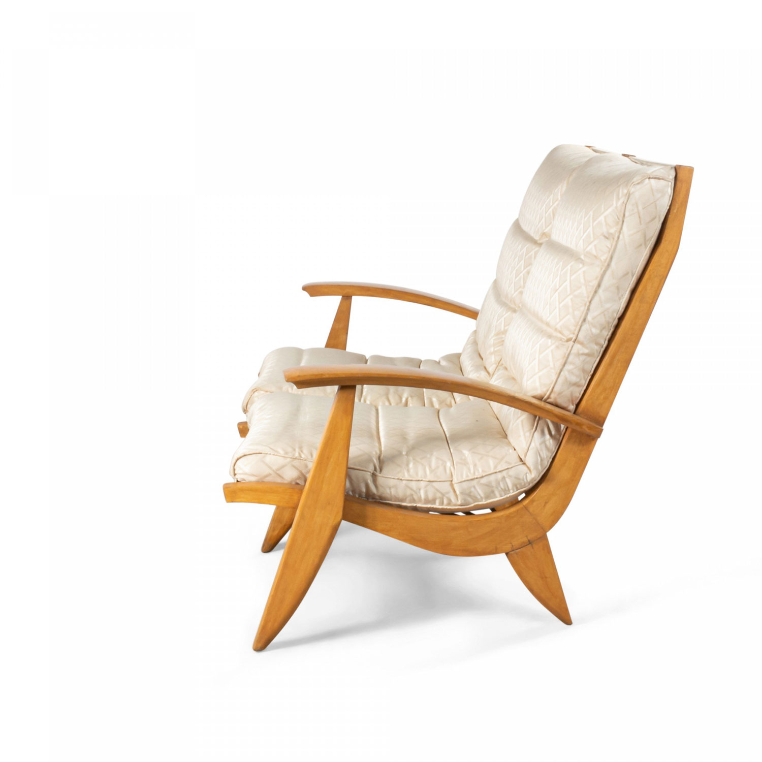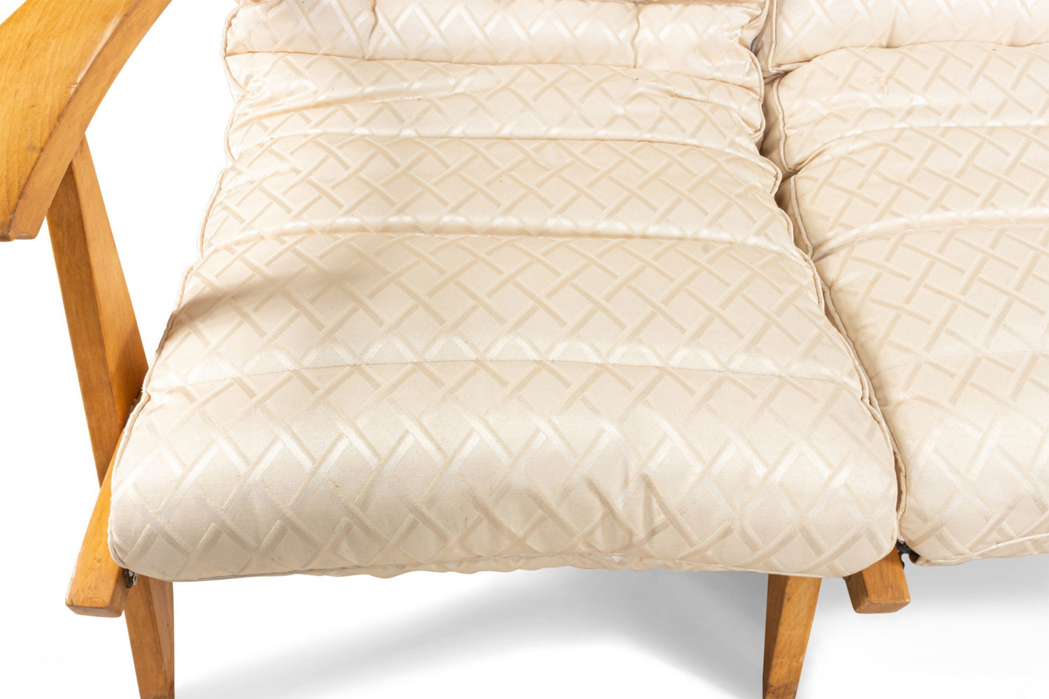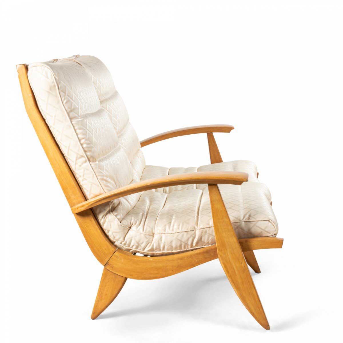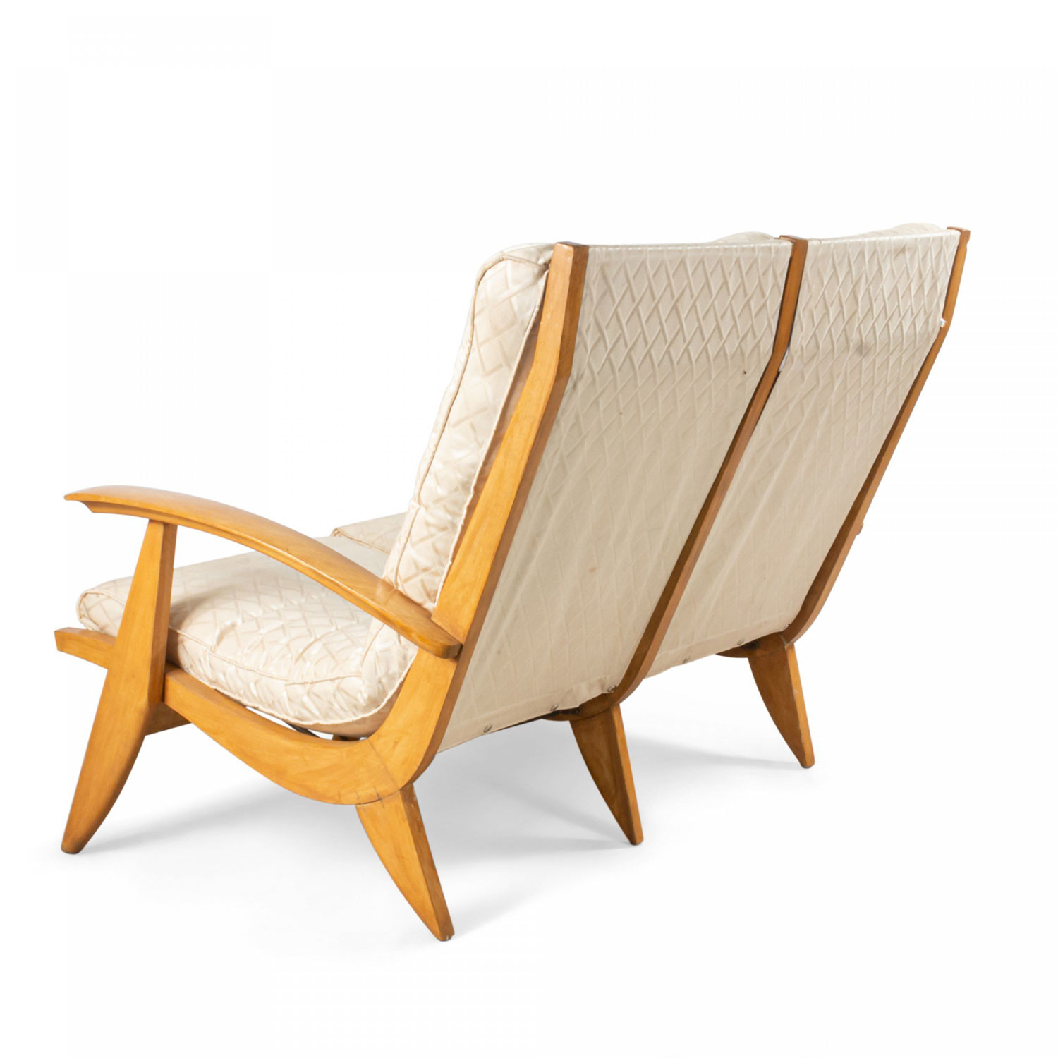 French 1950s beechwood loveseat with contoured ribbed upholstery & spring supports (2 matching armchairs: 059650B)