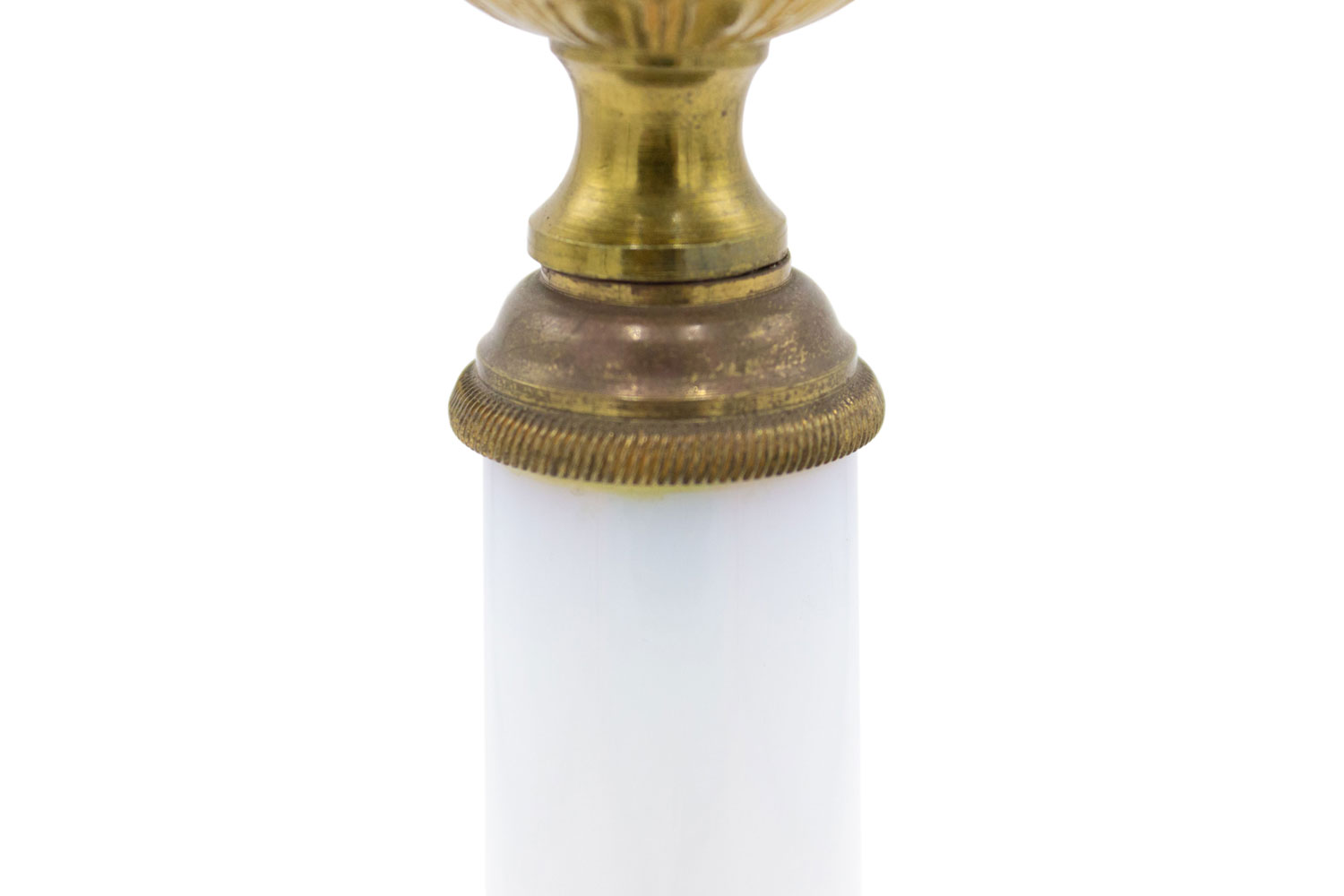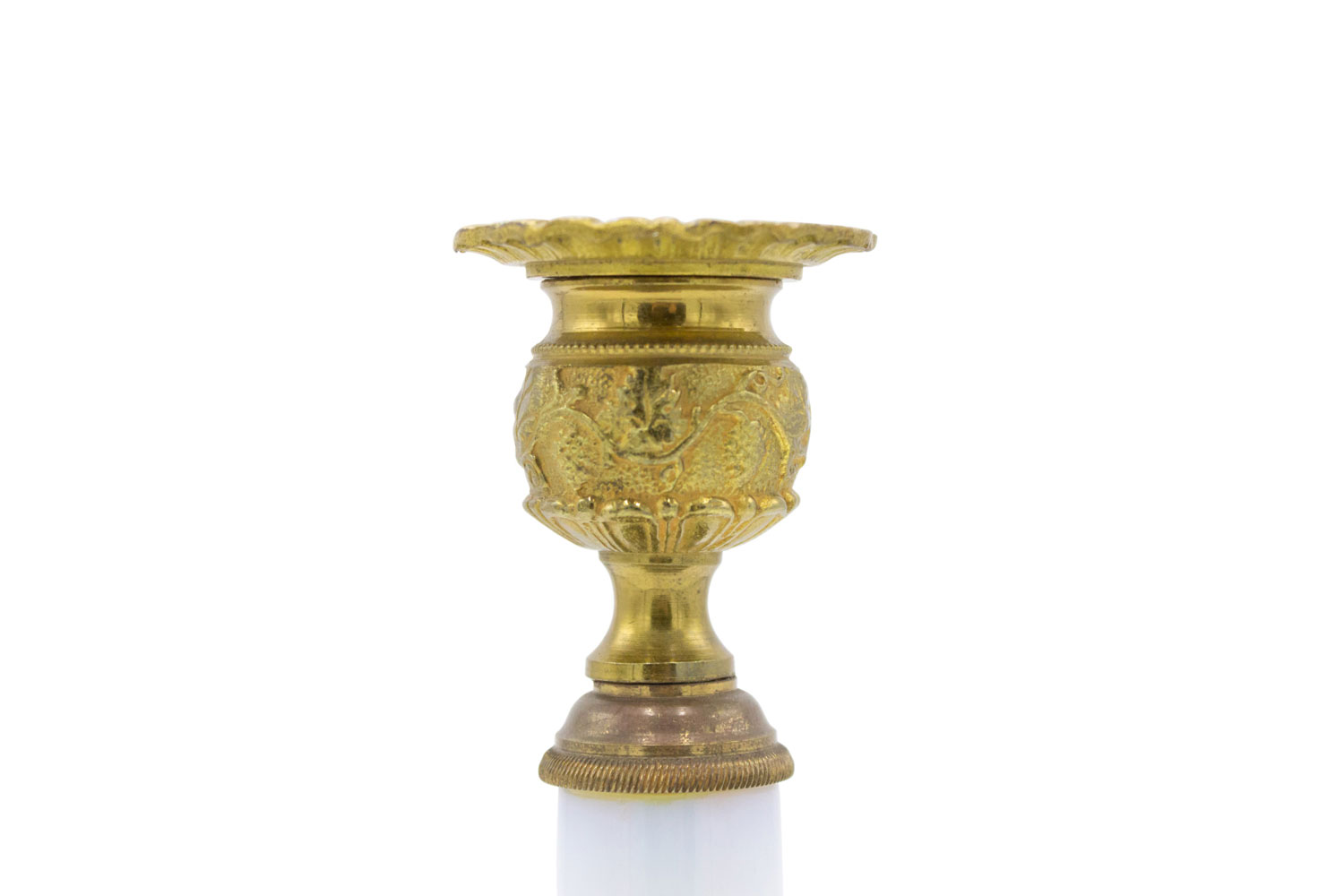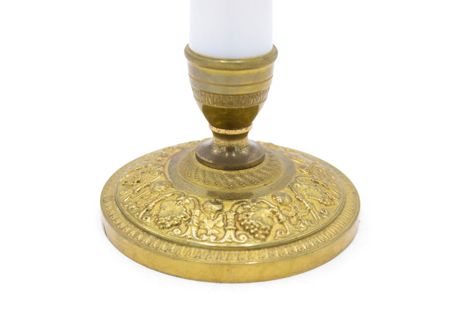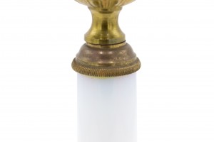 PAIR of French Charles X-style (19/20th Century) white opaline column candlesticks with a gilt bronze base and top. (PRICED AS PAIR)