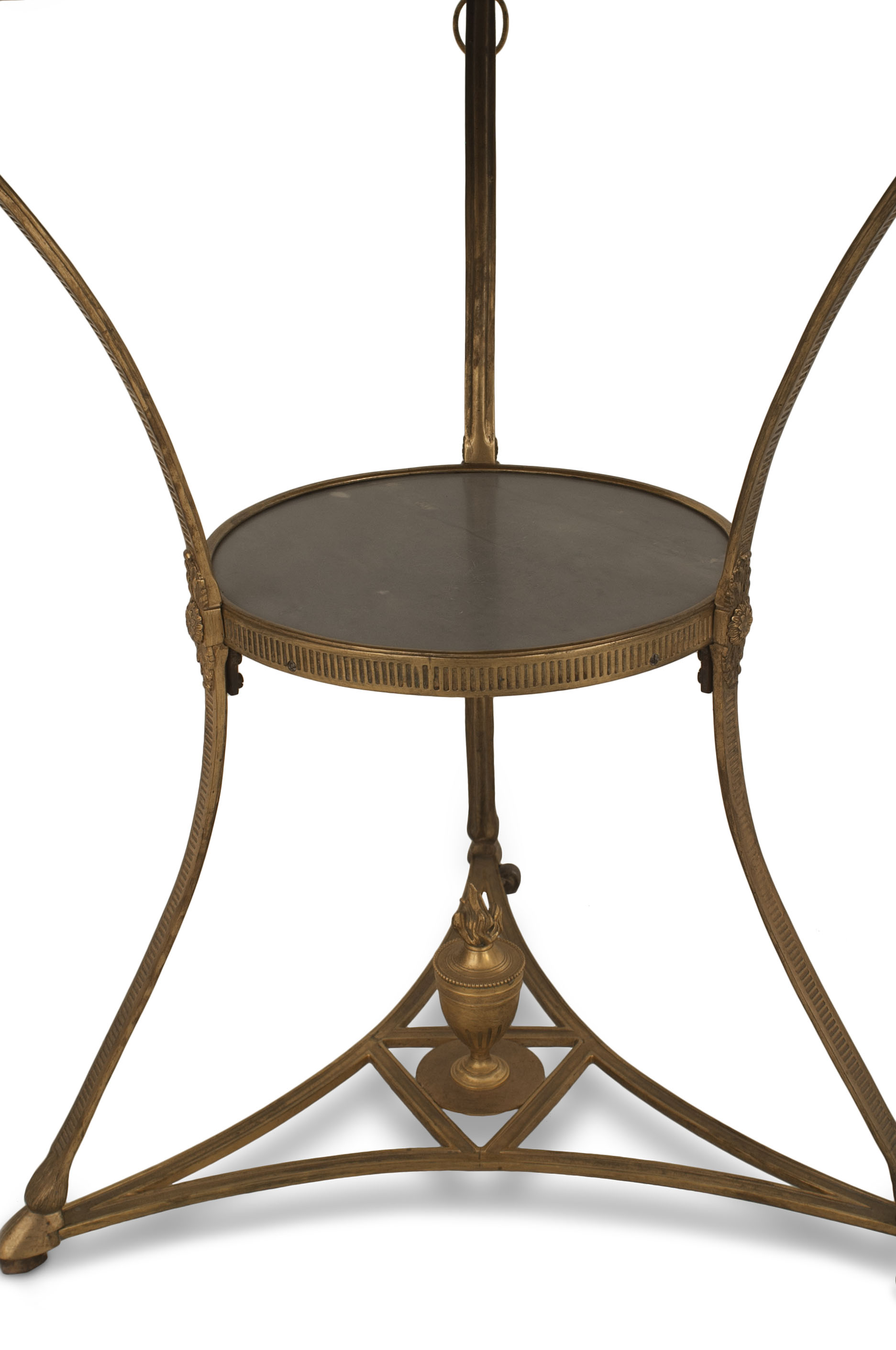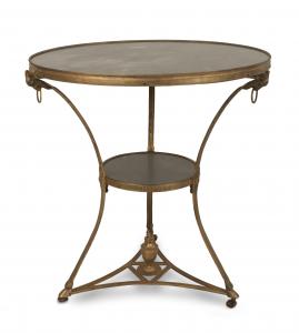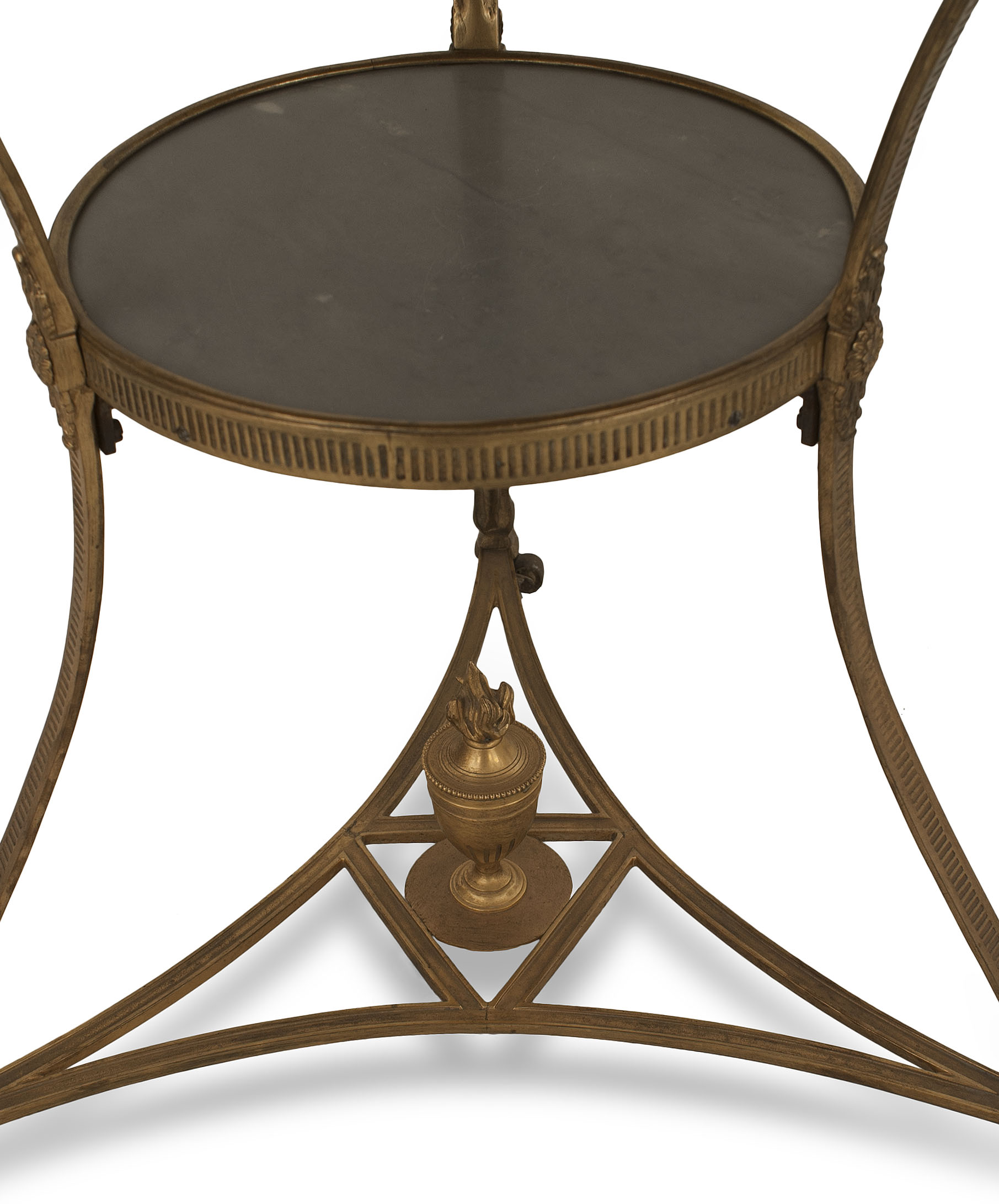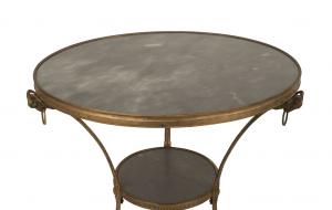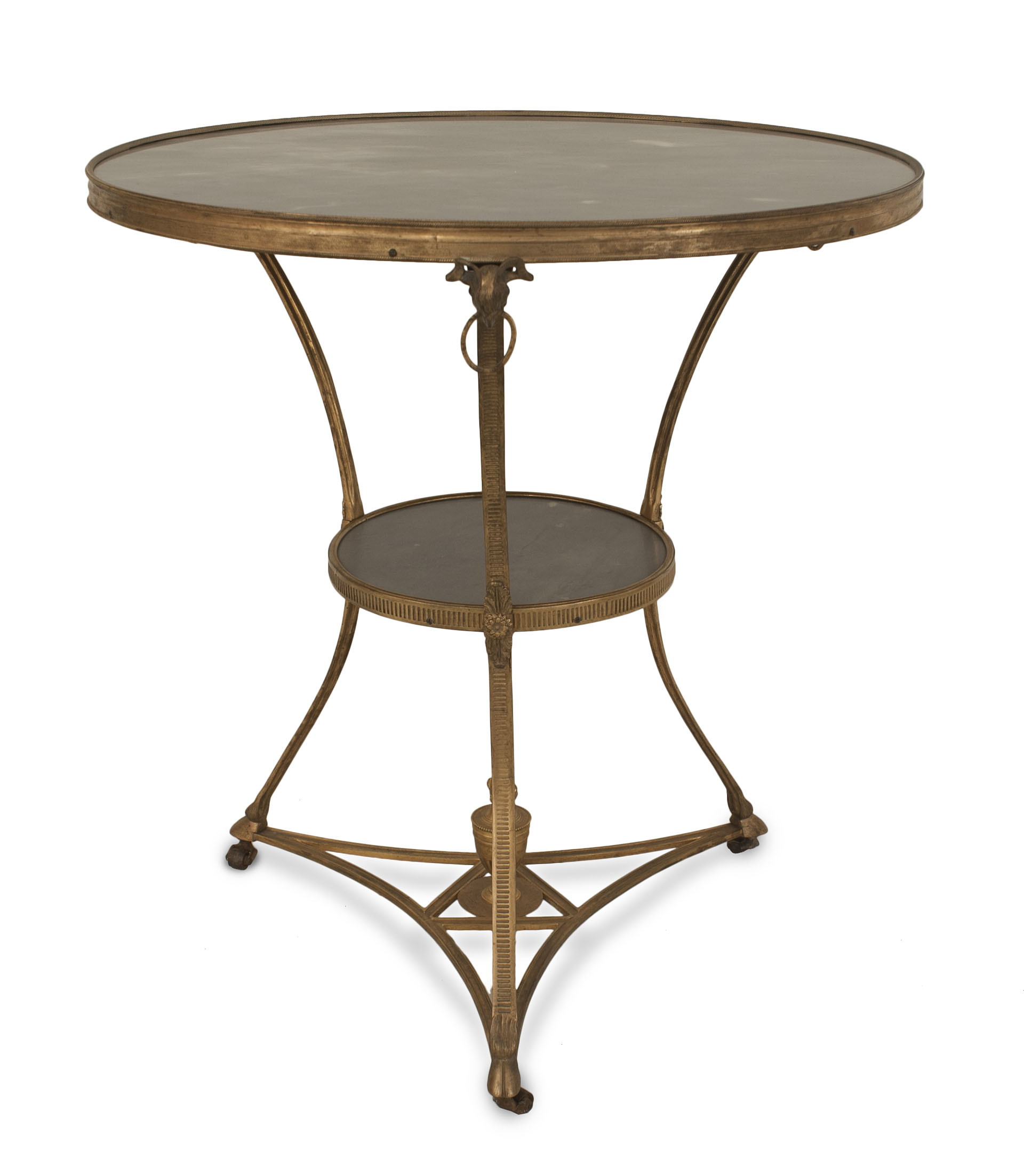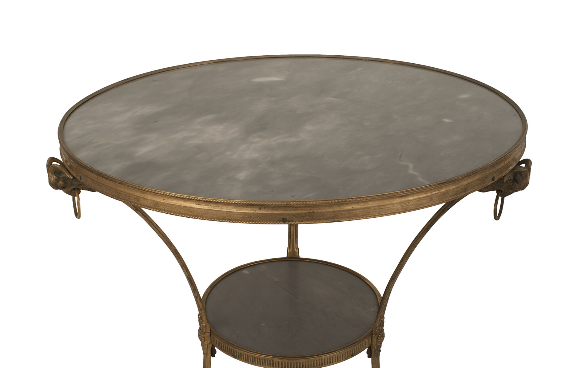 2 French Charles X-style (20th Century) gilt bronze round end tables with ram head design and inset grey marble top and shelf with a bottom stretcher with an urn finial. (PRICED EACH)