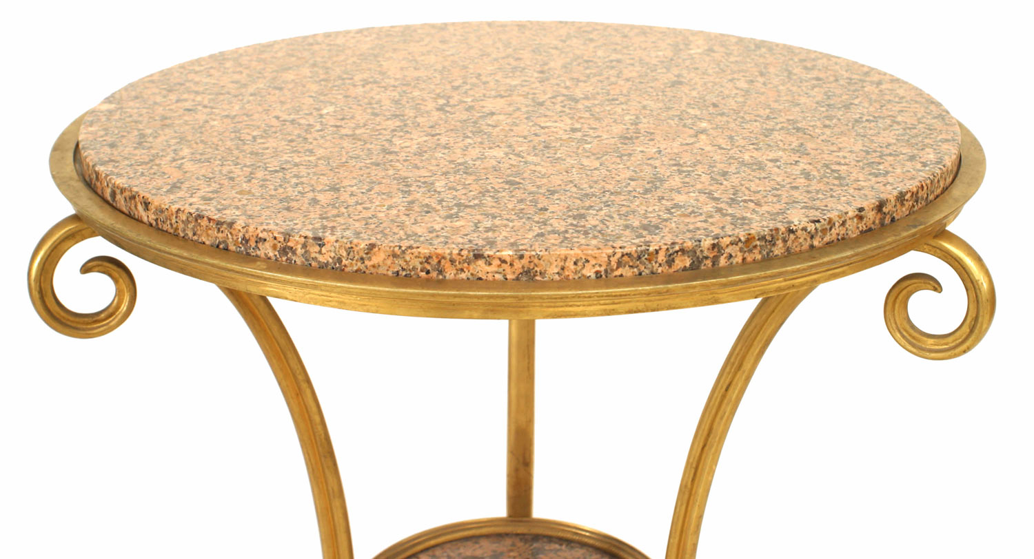 French Directoire-style (20th Century) gilt bronze end table with 3 scroll legs and inset round pink and black speckled marble top and shelf.