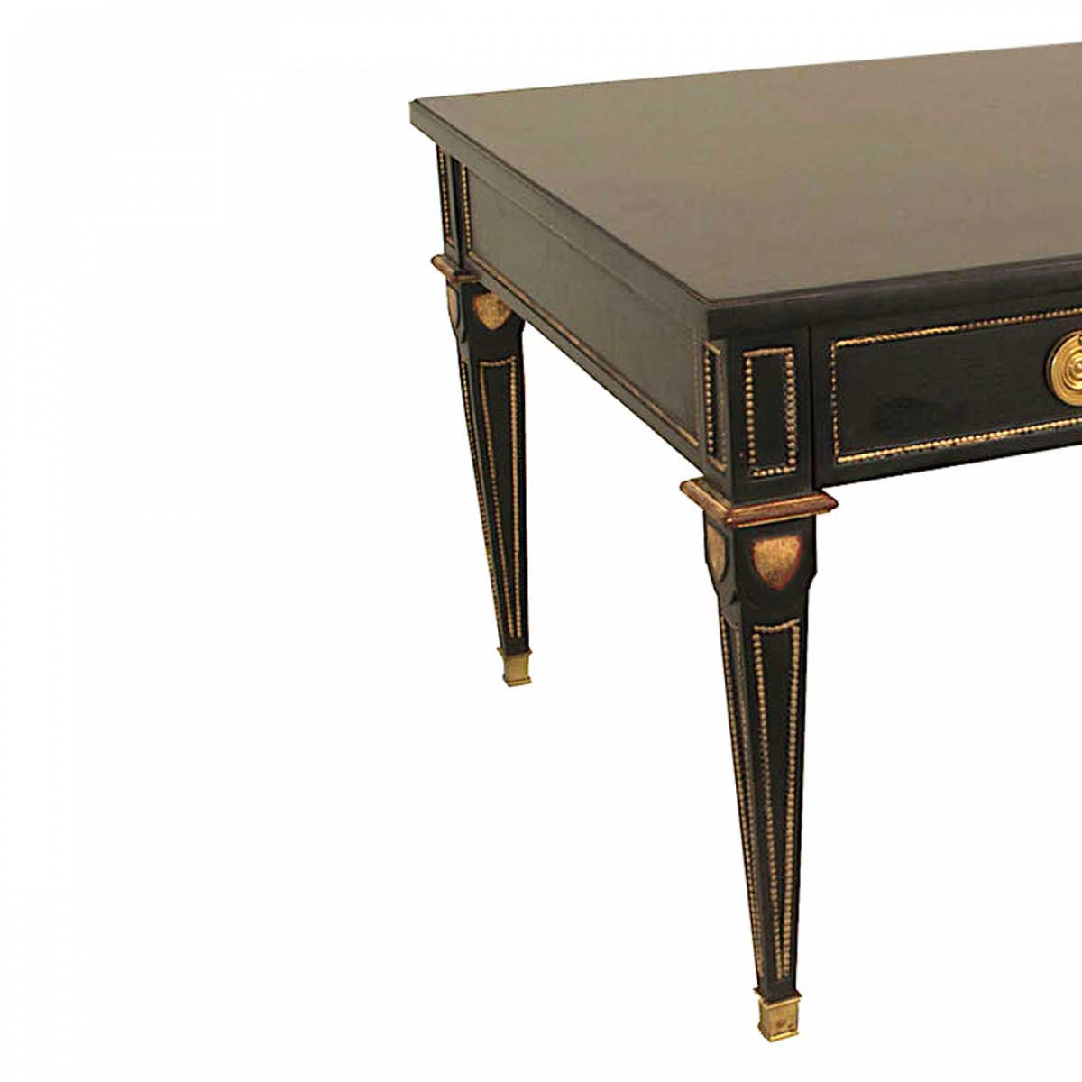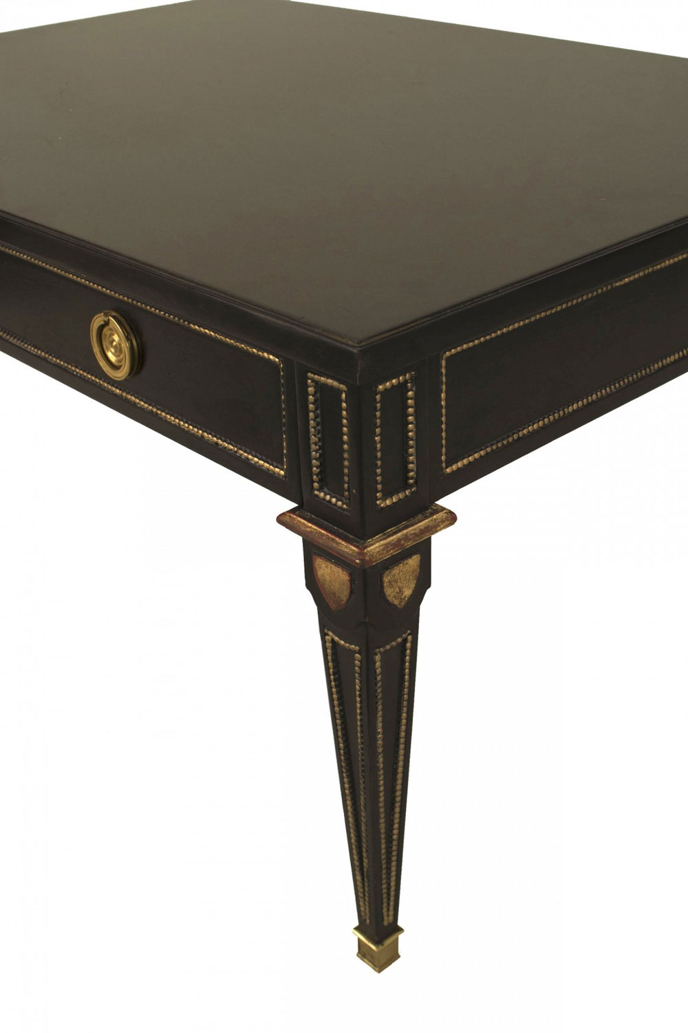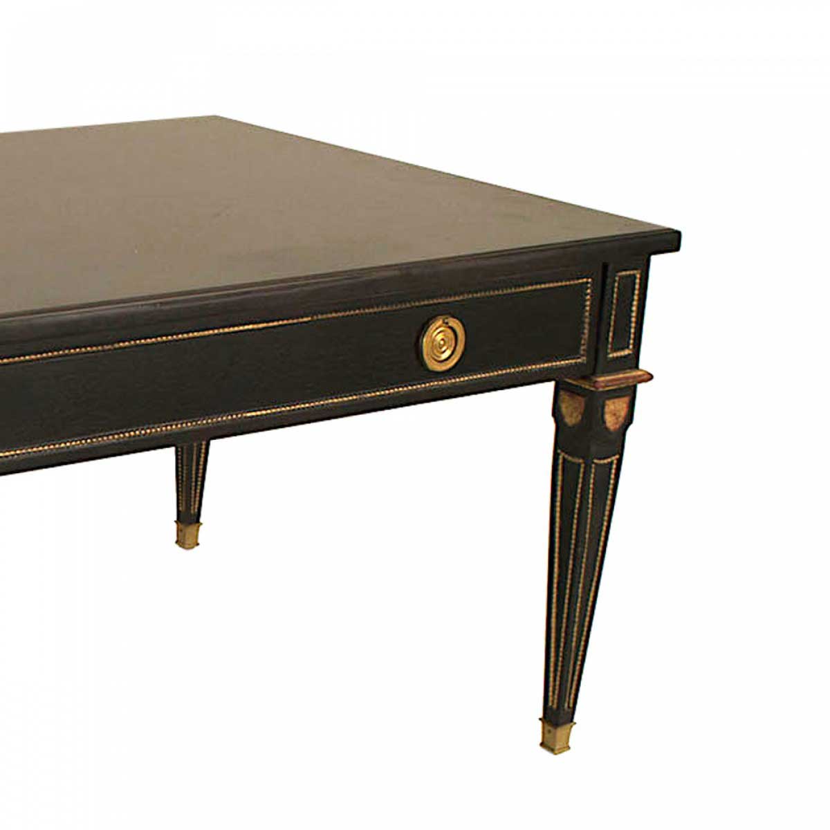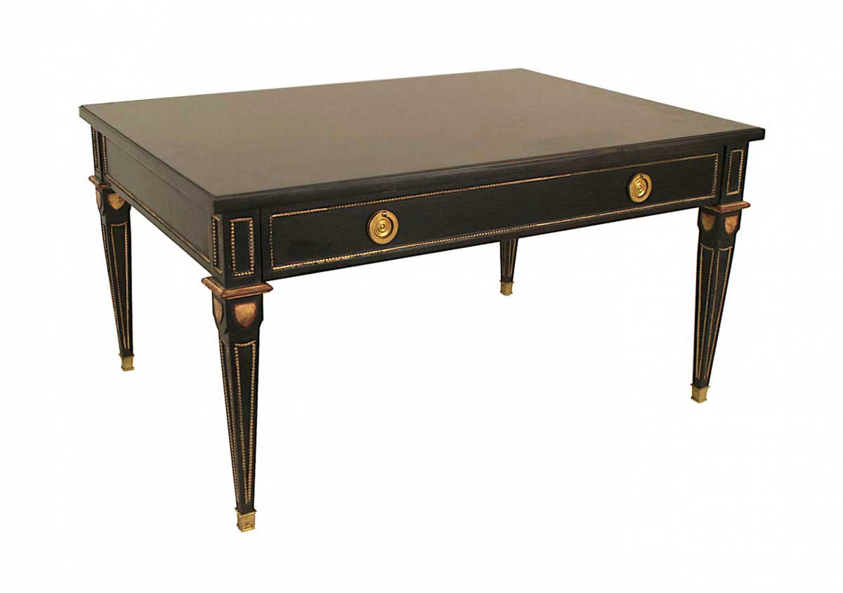 2 French Louis XVI-style (1940s) rectangular ebonized and gilt coffee tables with one drawer, bronze trim, and square tapered legs. (PRICED EACH)