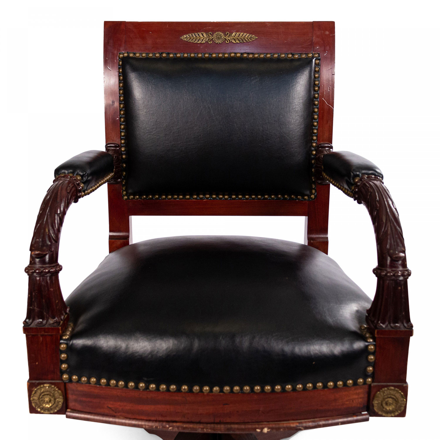 French Empire style (19th Century) ormolu mounted mahogany open swivel base arm chair with black leather seat and back.