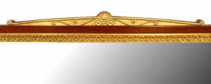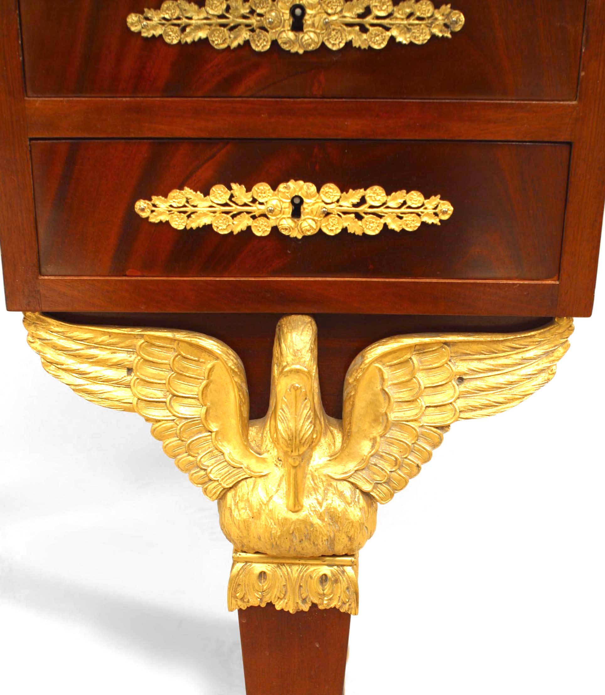French Empire (19th Century) mahogany vanity / dressing table with gilt bronze trim and swan supports on legs with a rectangular form mirror attached by a pair of 3 arm candelabra.