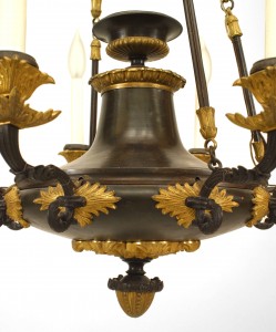 French Empire (circa 1820) bronze & gilt trimmed chandelier with 8 scroll arms emanating from a circular corona with an acorn drop finial and suspended by 4 foliate chains.