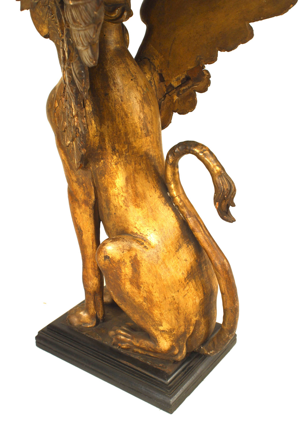 French Empire gilt sphinx carved triangular console table with black painted top.