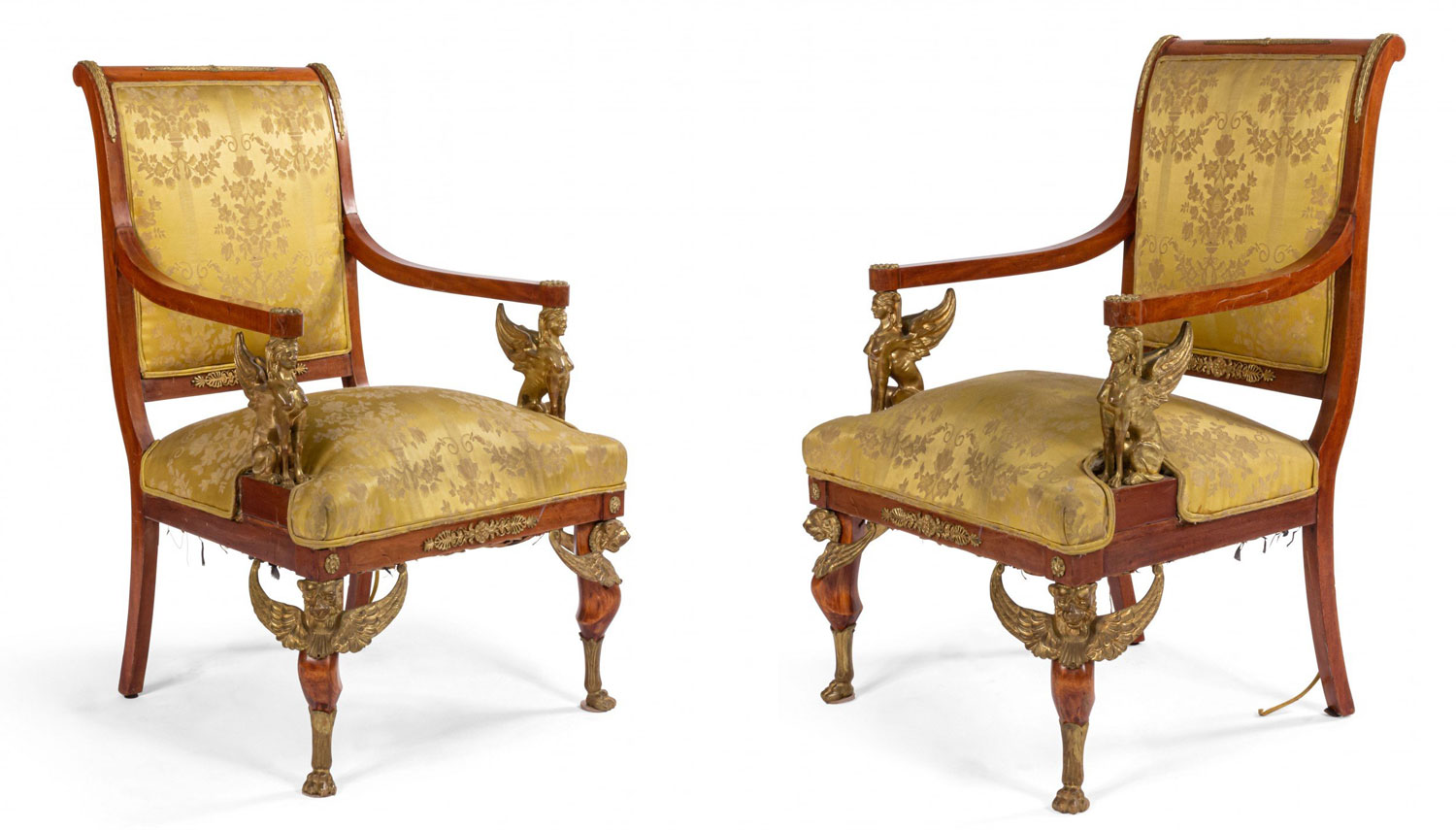 Choose one of the options below.2 French Empire Mahogany and Gold Damask Armchairs