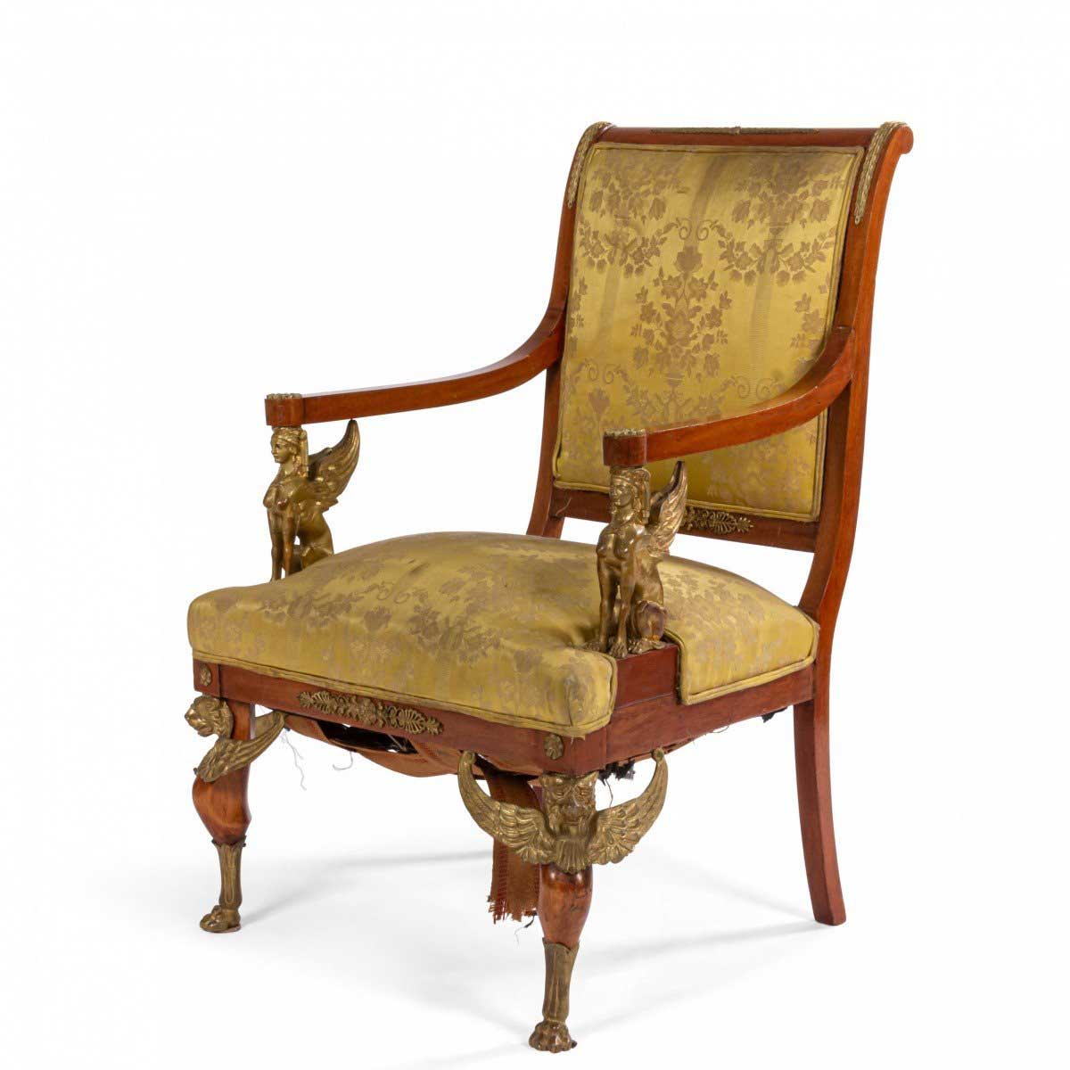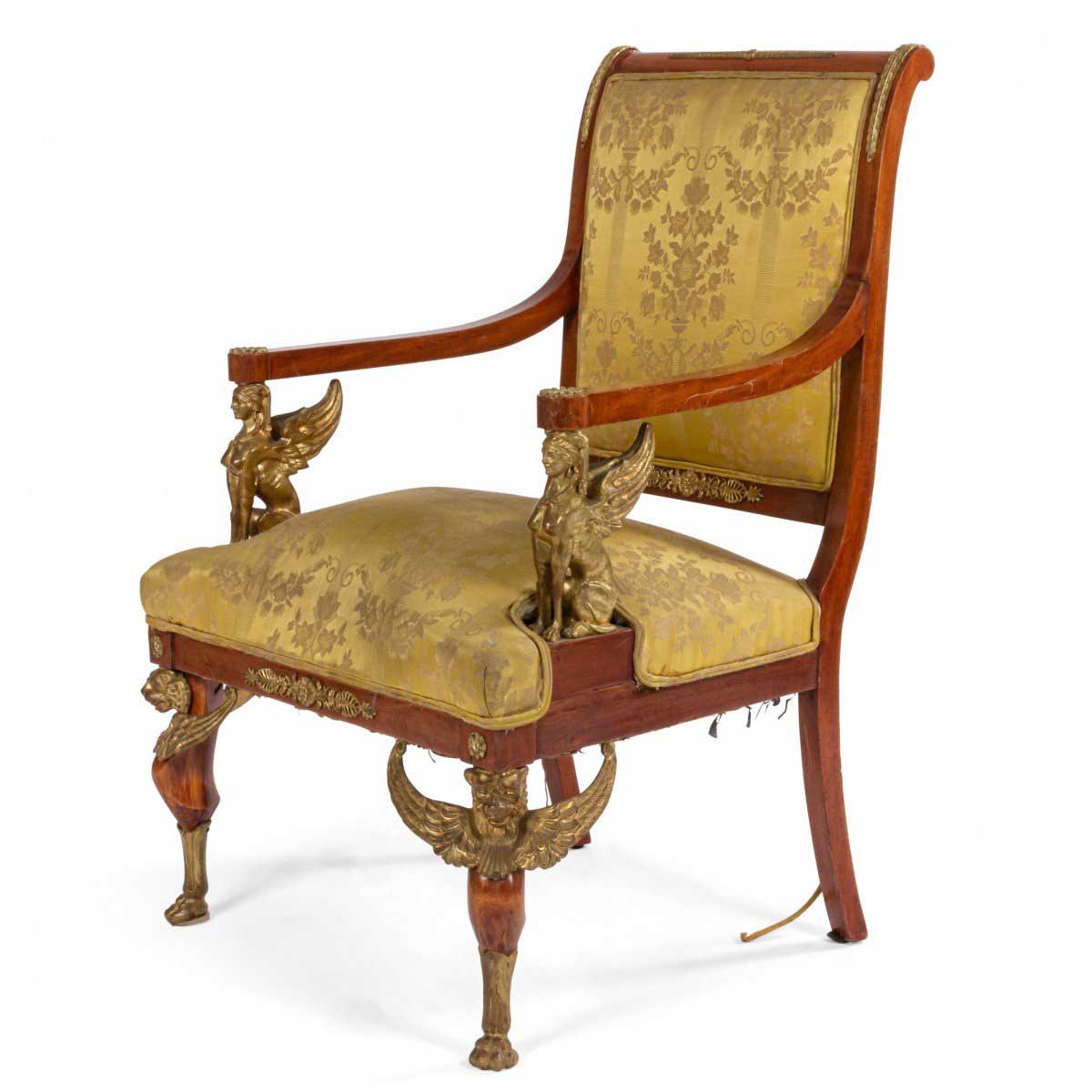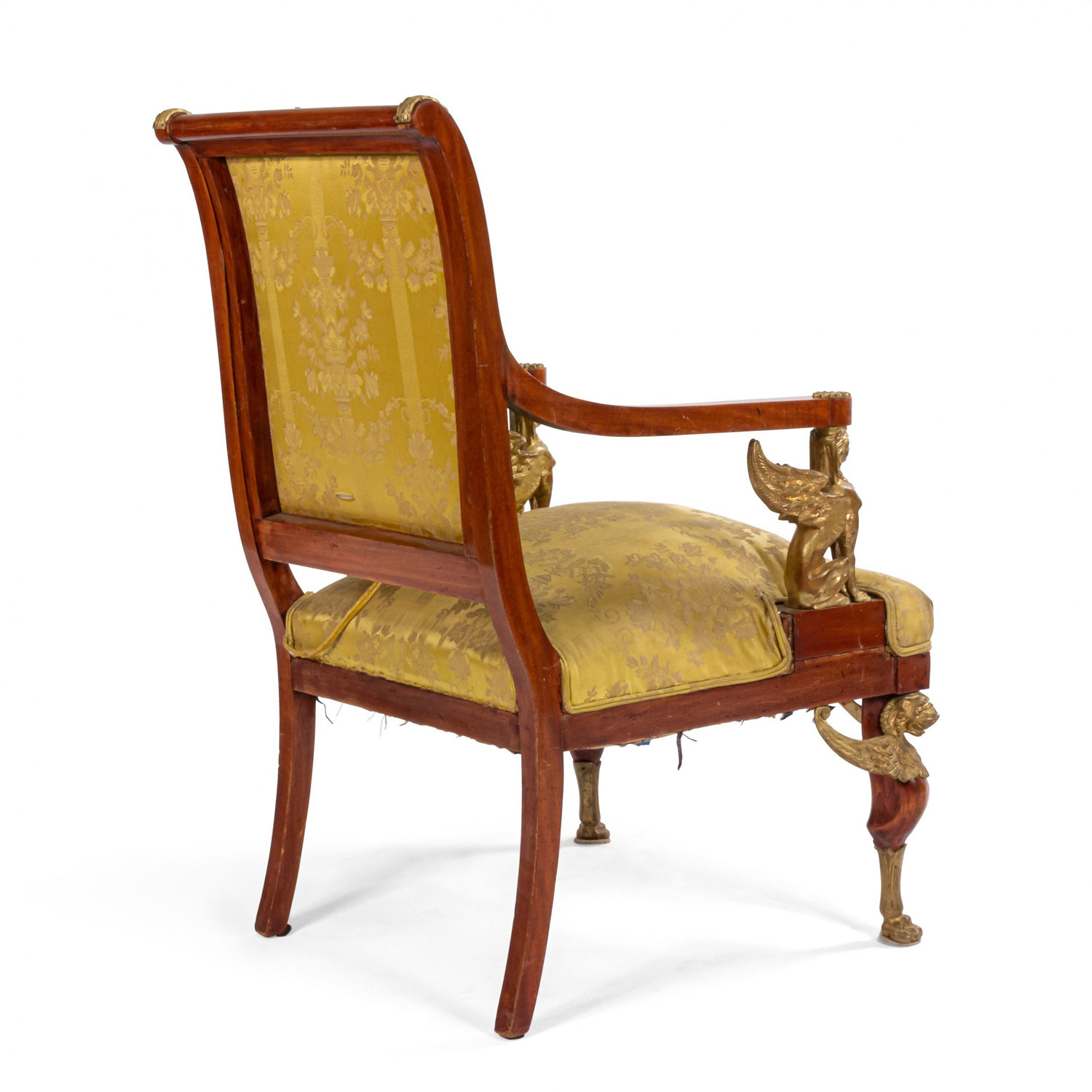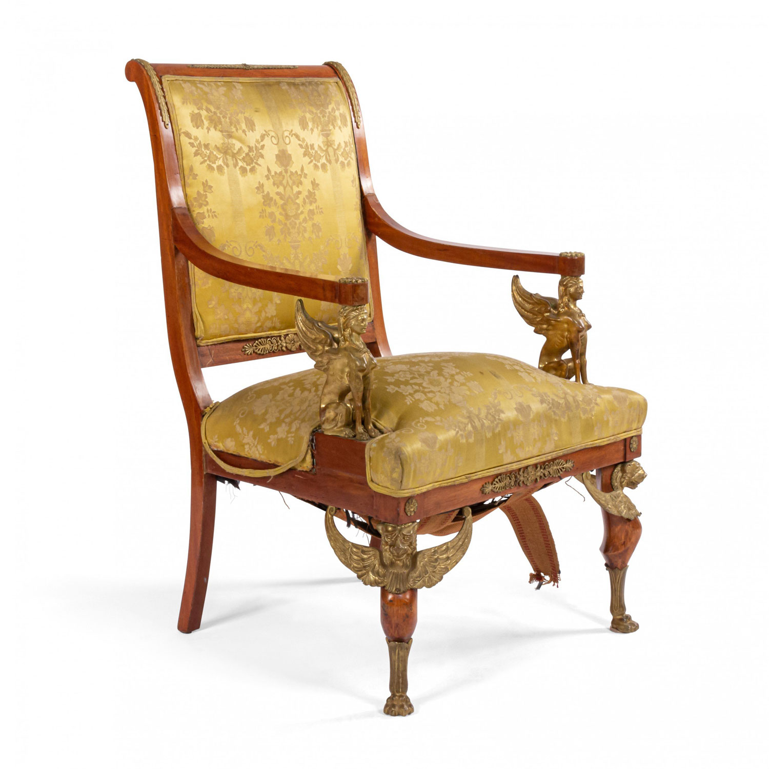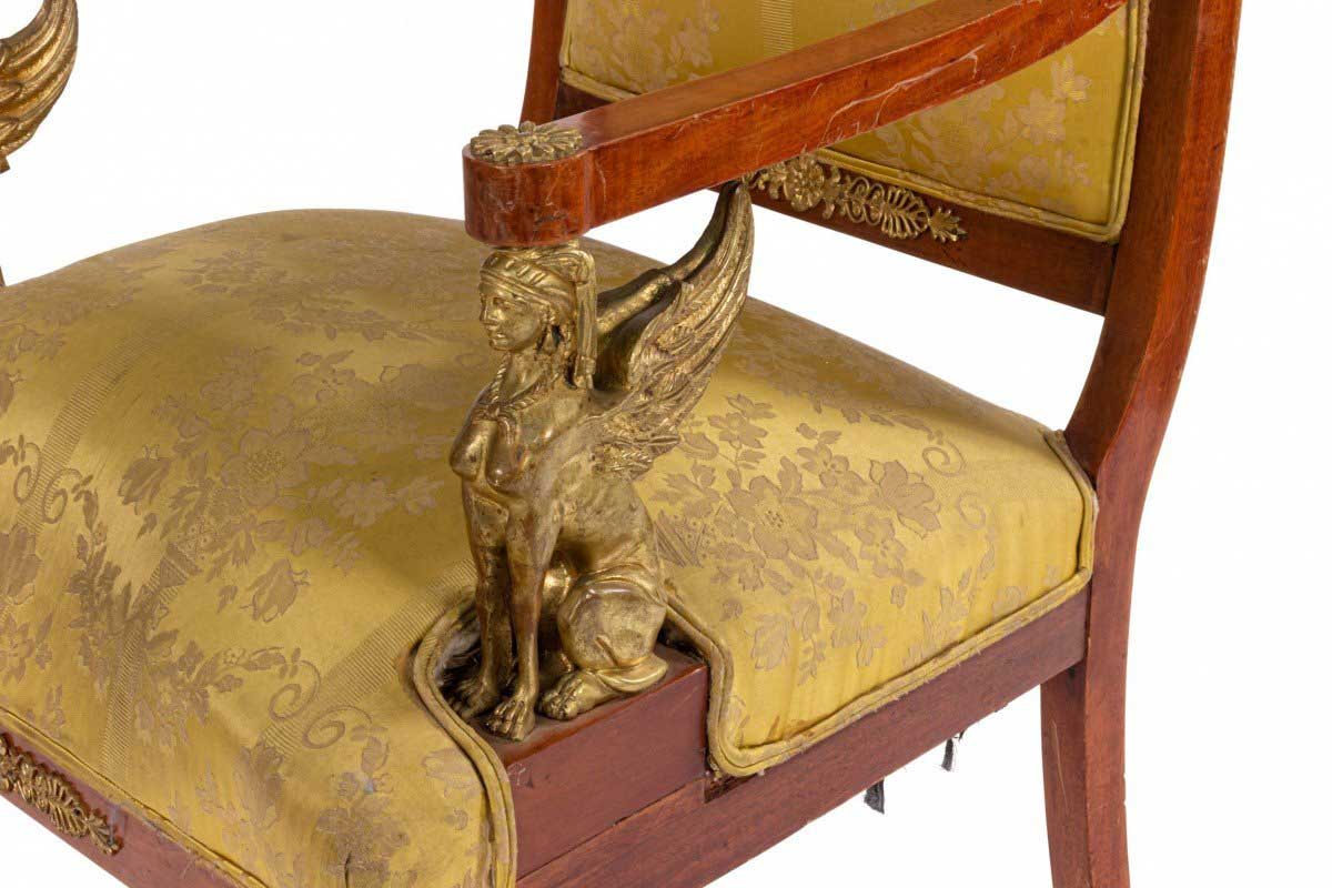 2 French Empire-style (19th Century) mahogany armchairs with bronze trim and gold damask upholstery. (PRICED EACH) (Part of living room set: 031828)