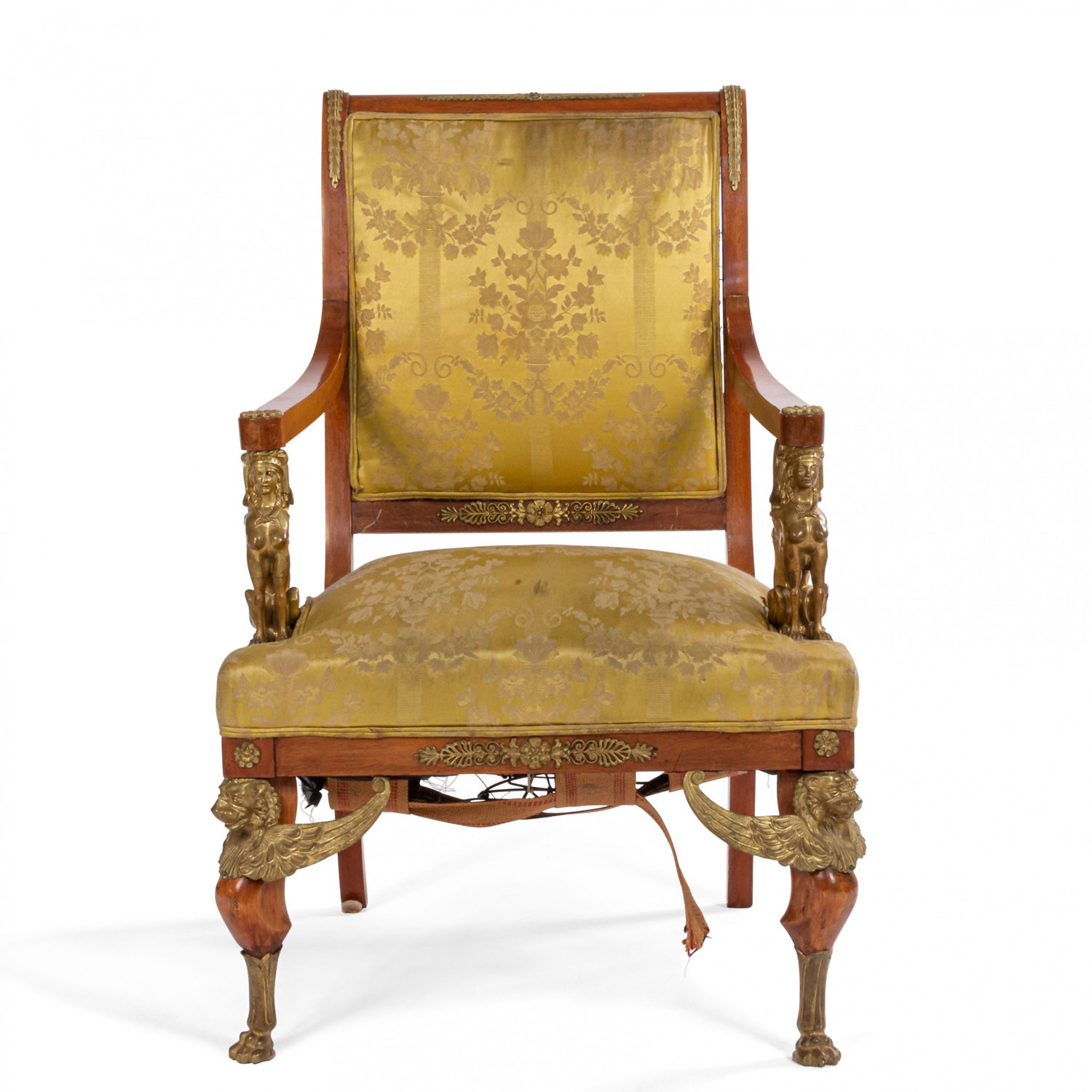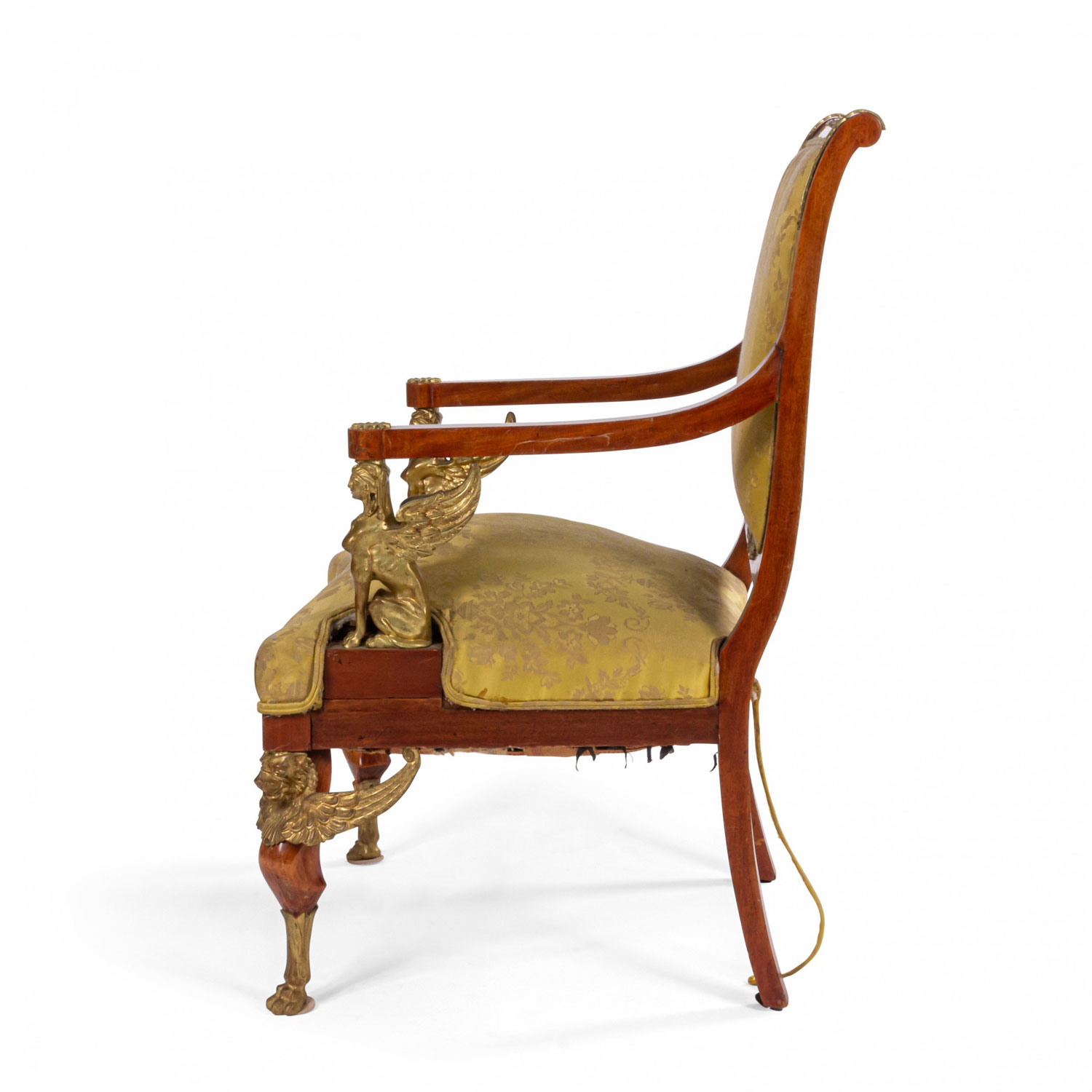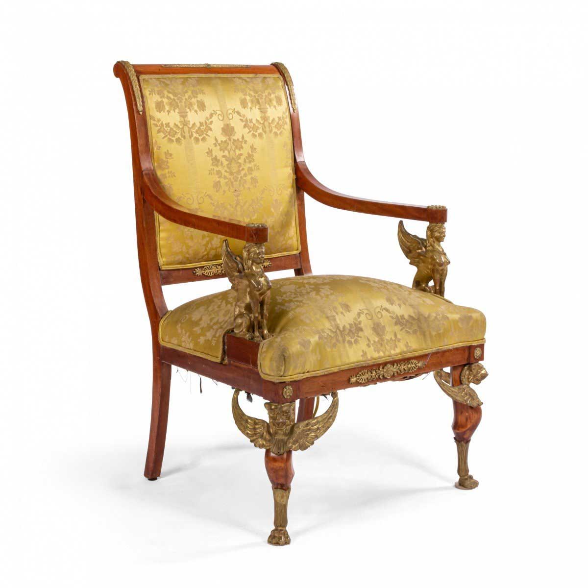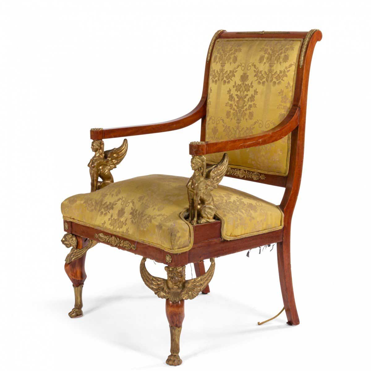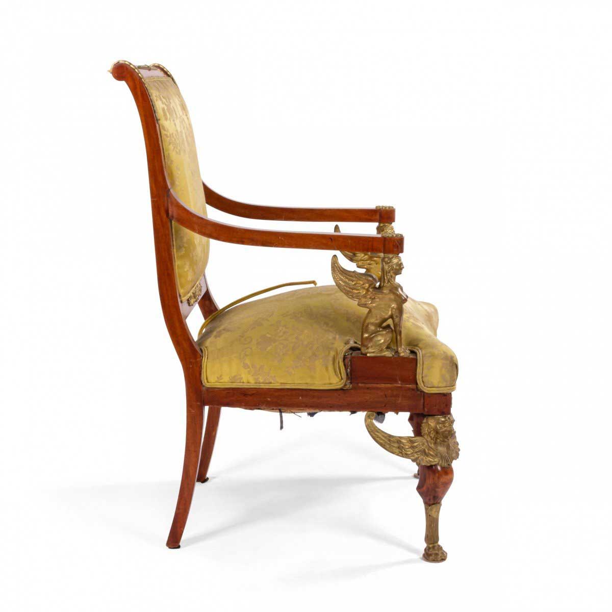 2 French Empire-style (19th Century) mahogany armchairs with bronze trim and gold damask upholstery. (PRICED EACH) (Part of living room set: 031828)