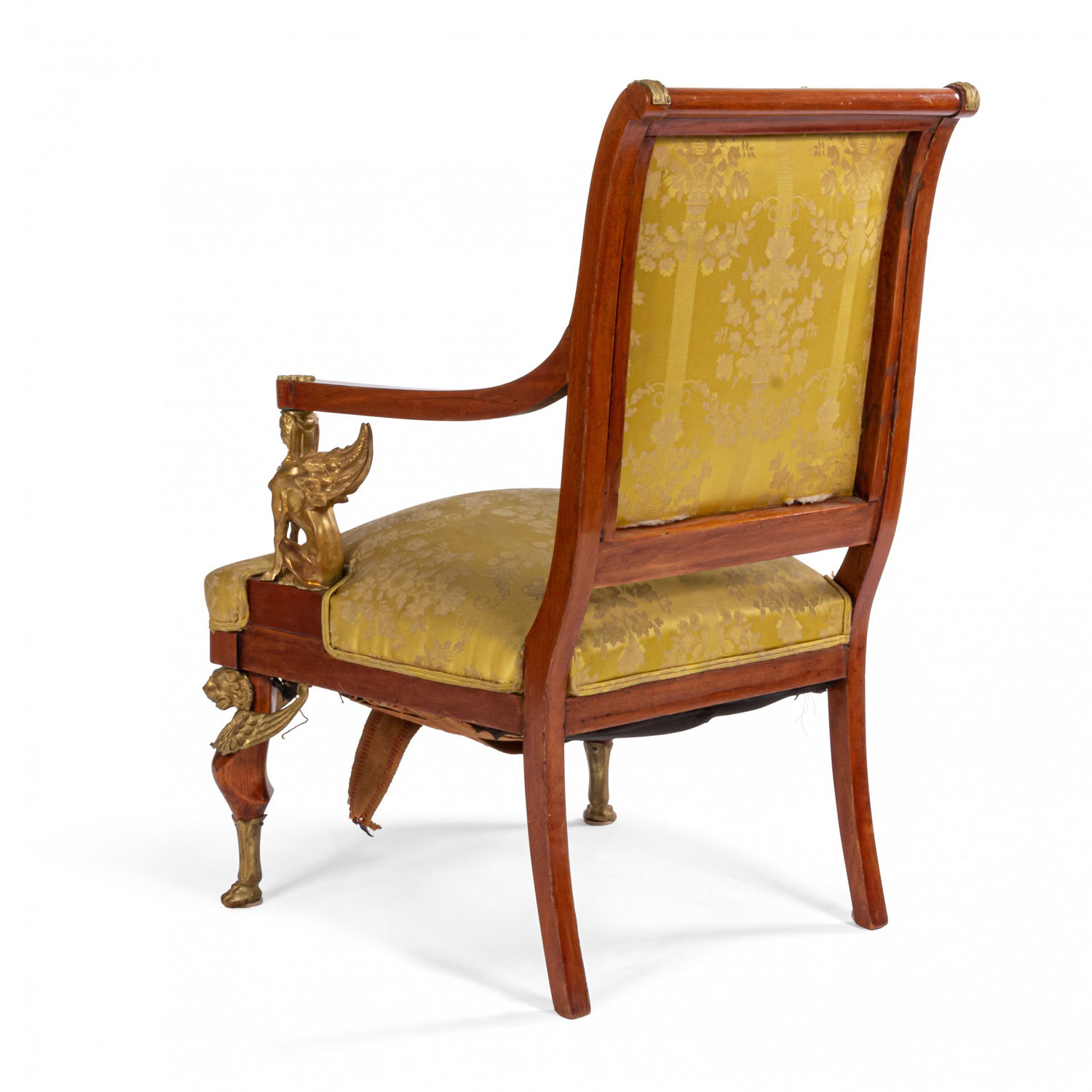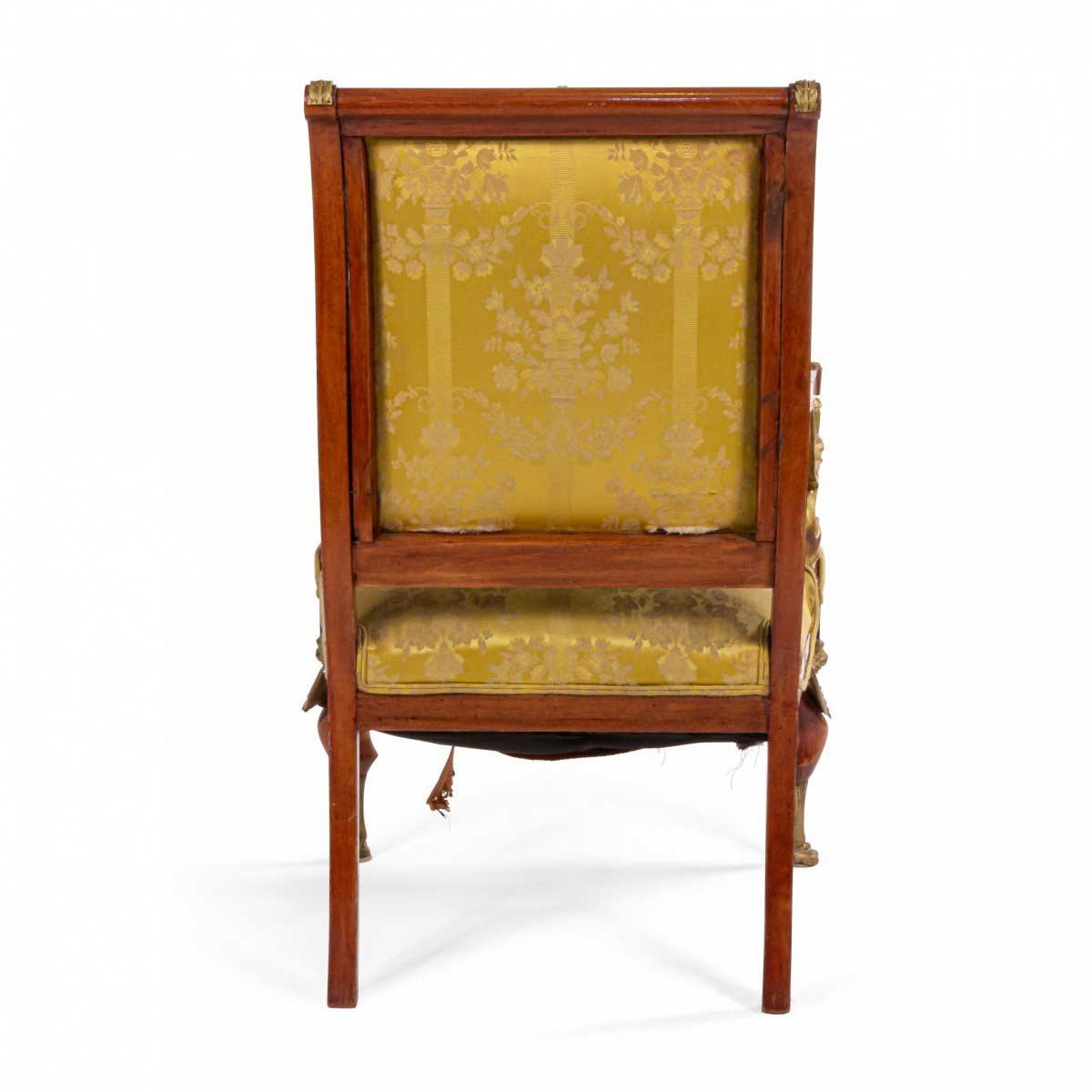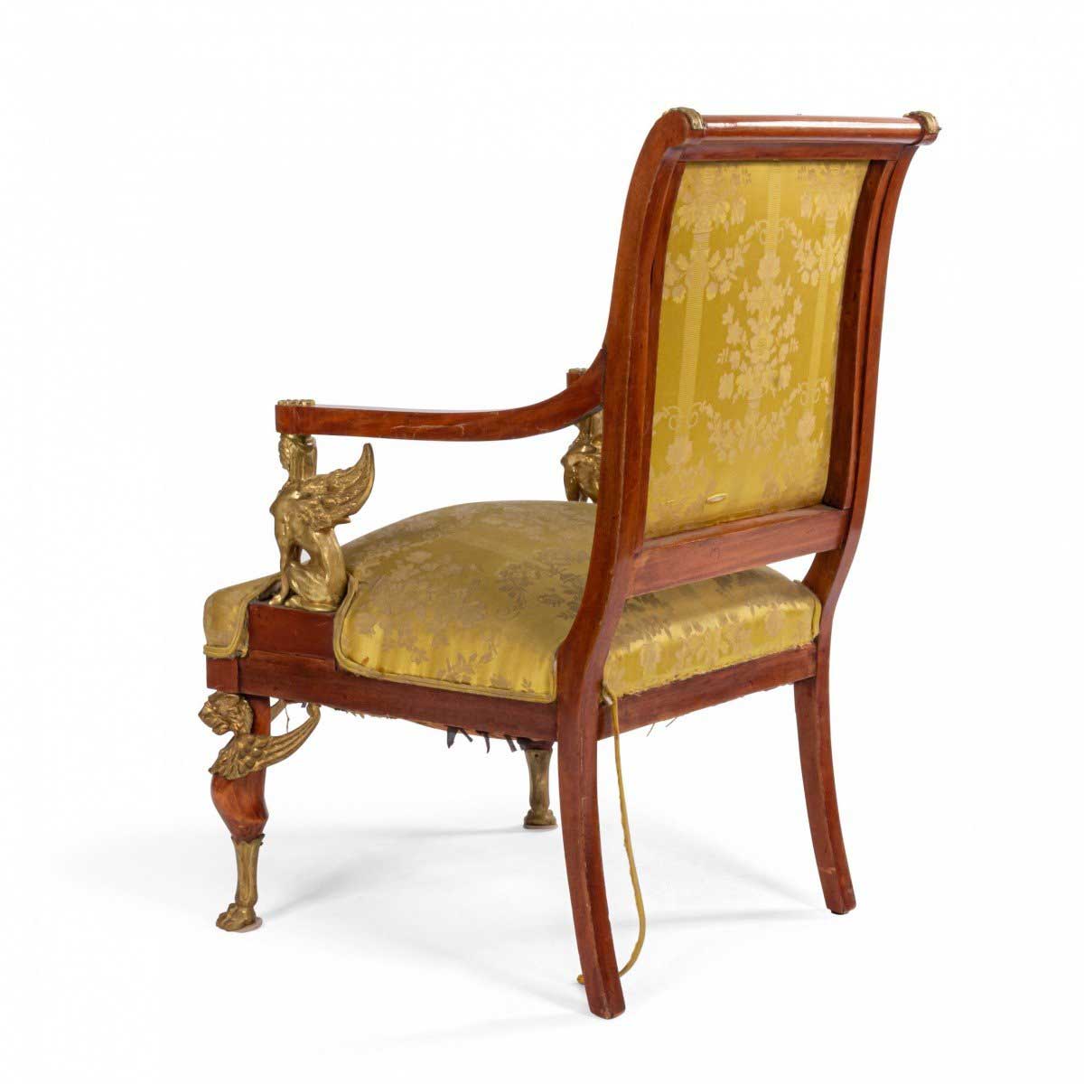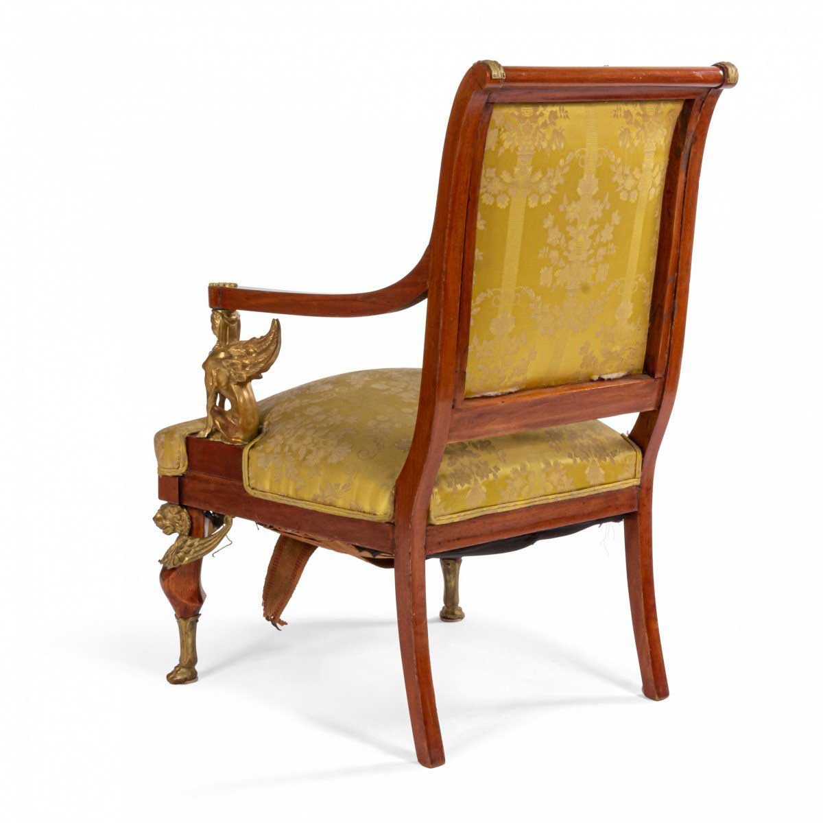 2 French Empire-style (19th Century) mahogany armchairs with bronze trim and gold damask upholstery. (PRICED EACH) (Part of living room set: 031828)