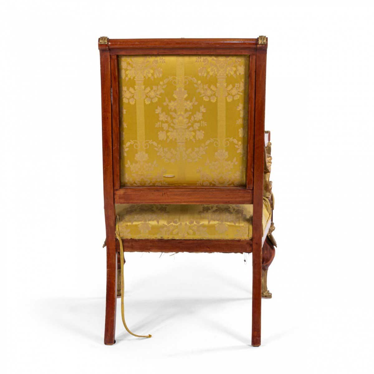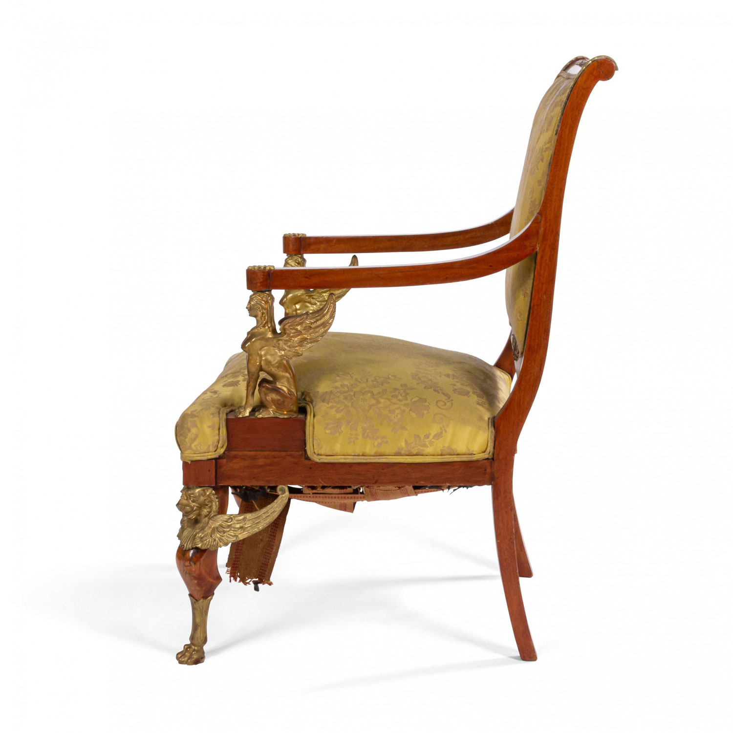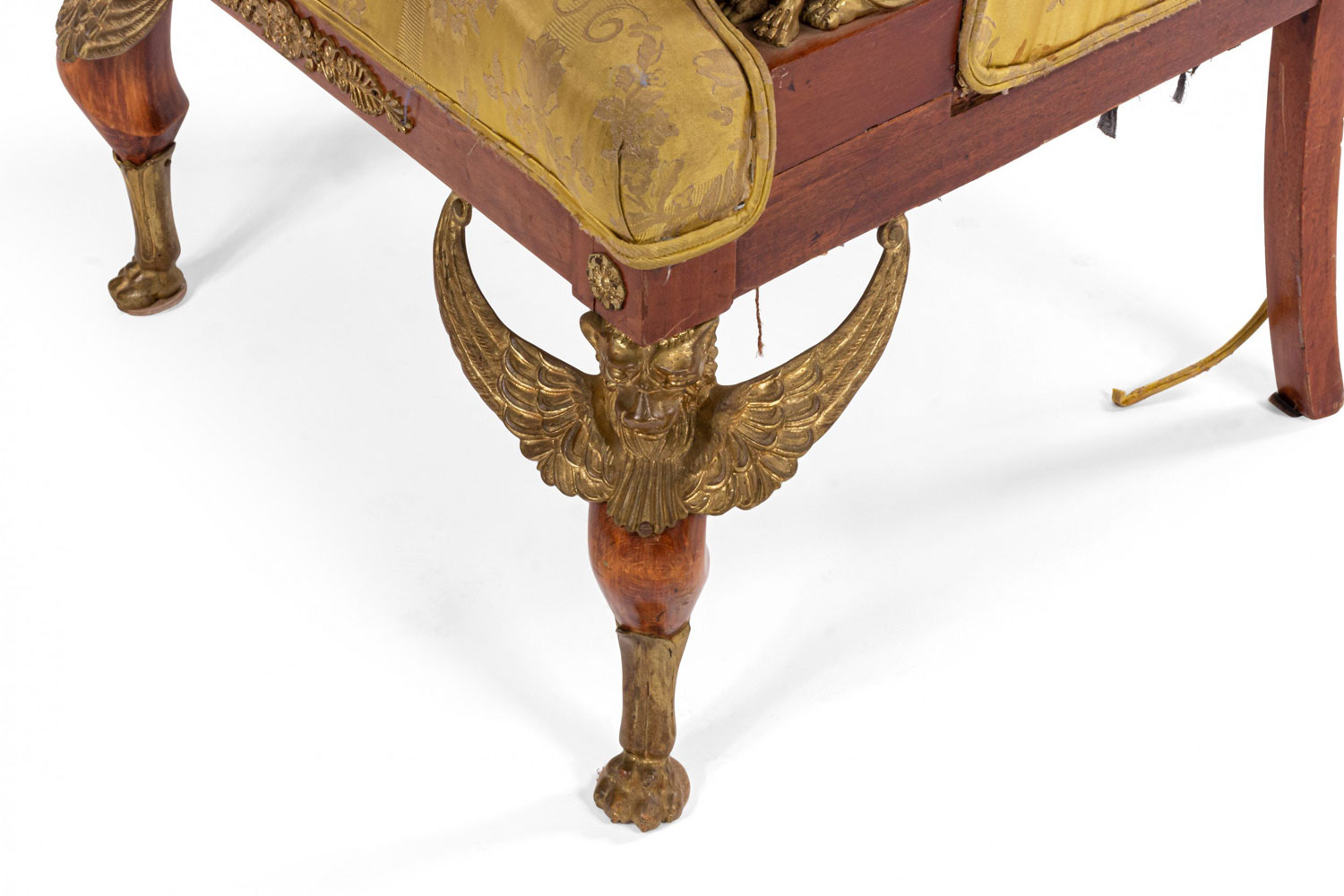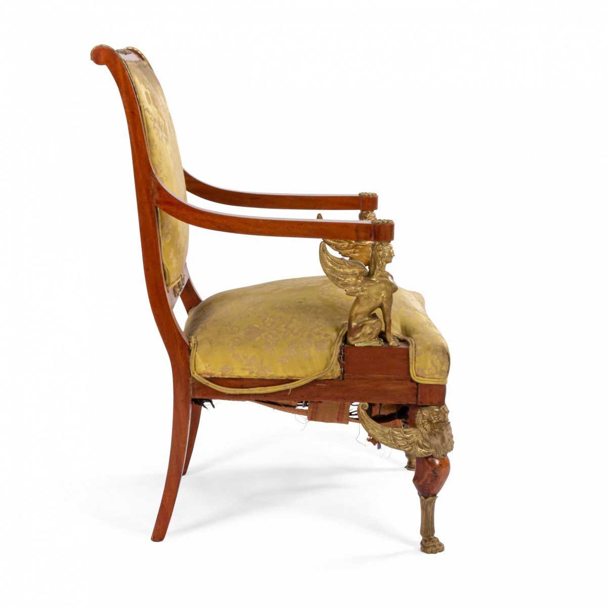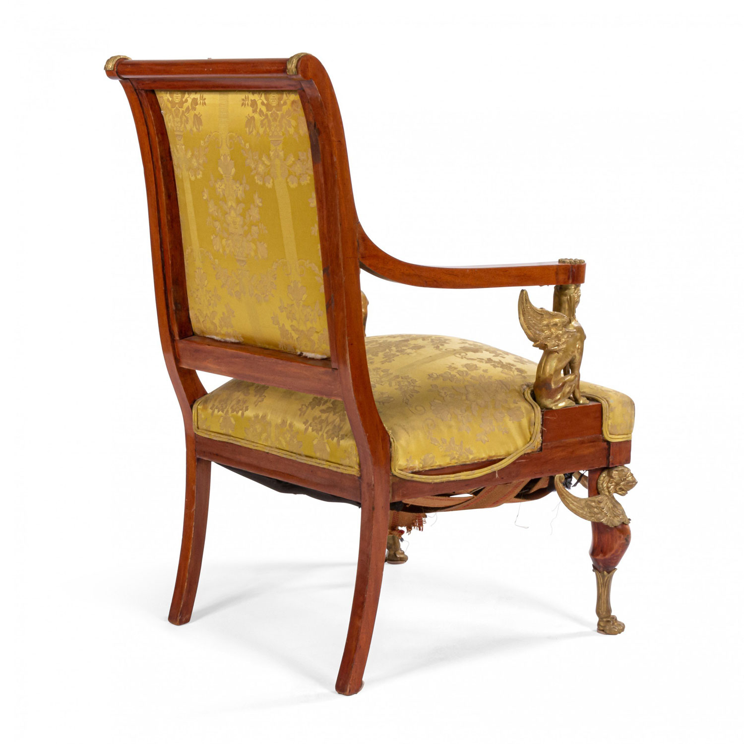 2 French Empire-style (19th Century) mahogany armchairs with bronze trim and gold damask upholstery. (PRICED EACH) (Part of living room set: 031828)
