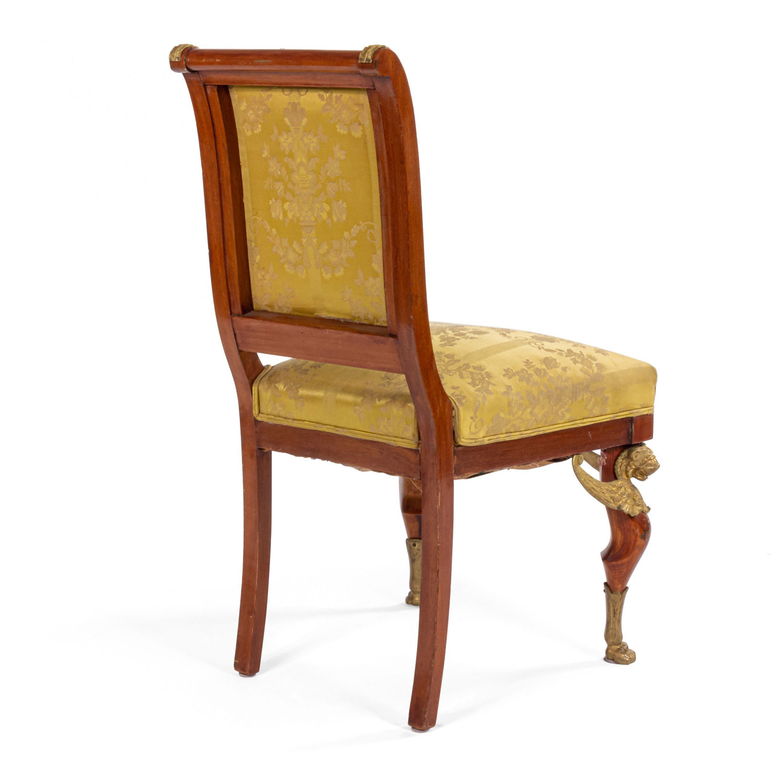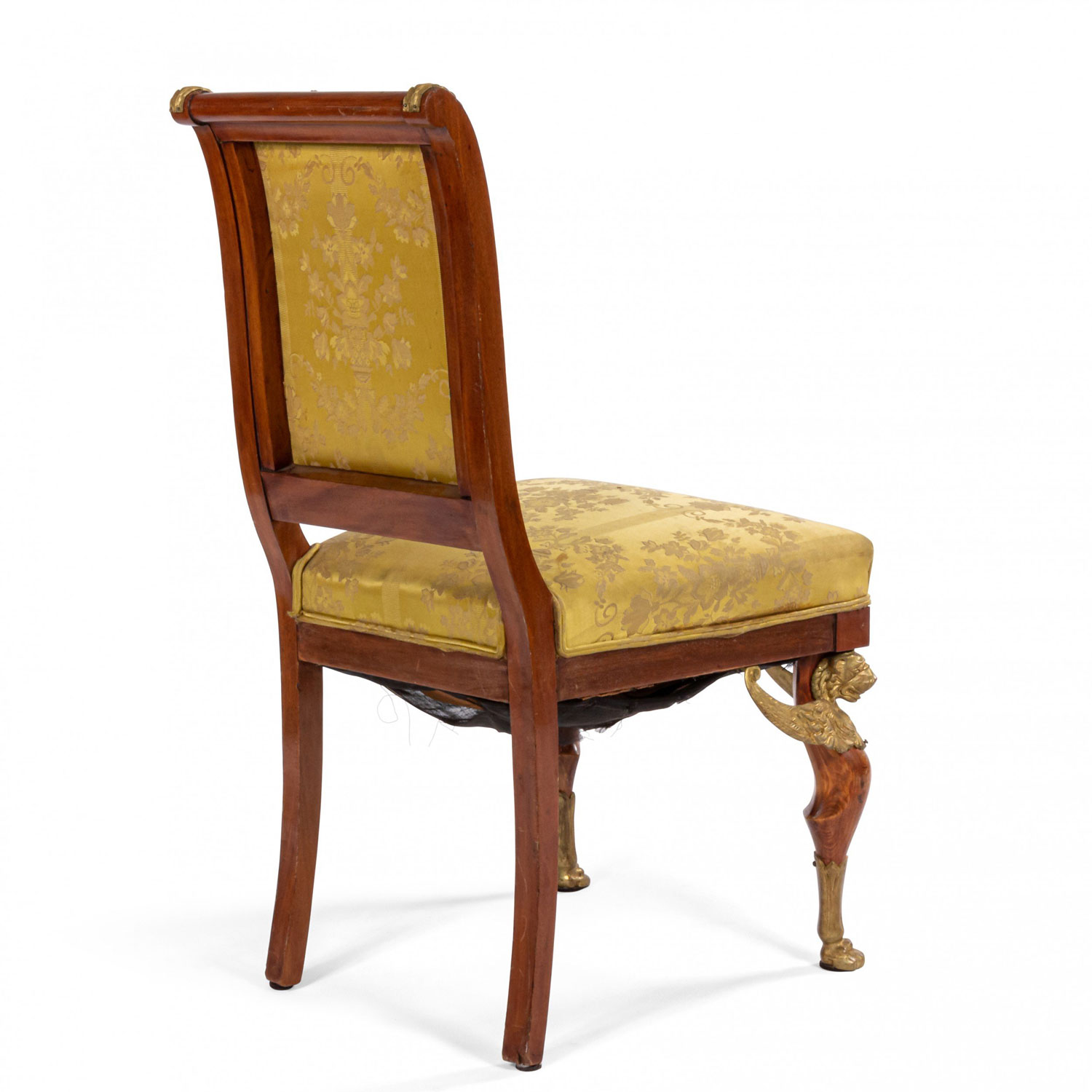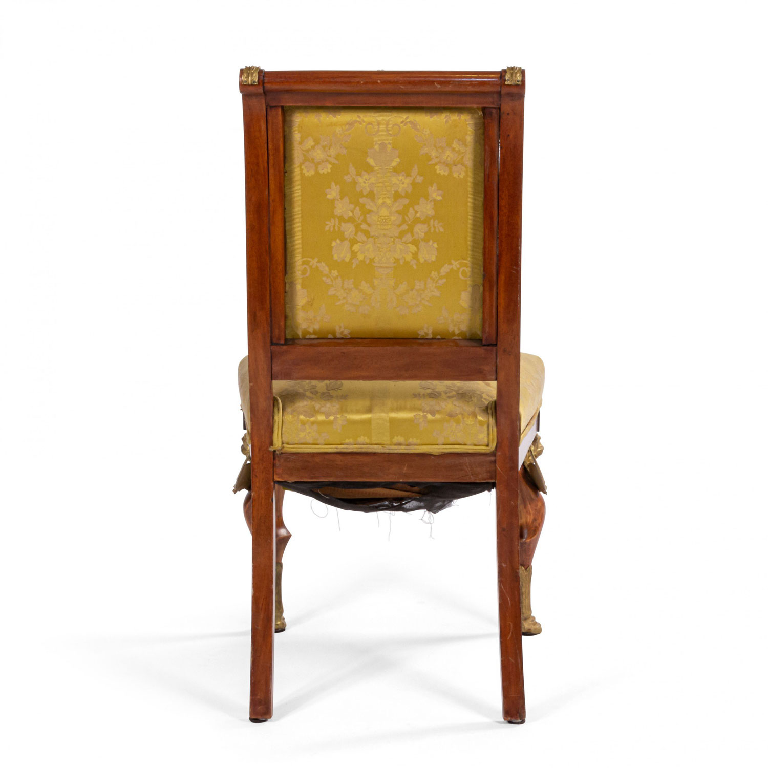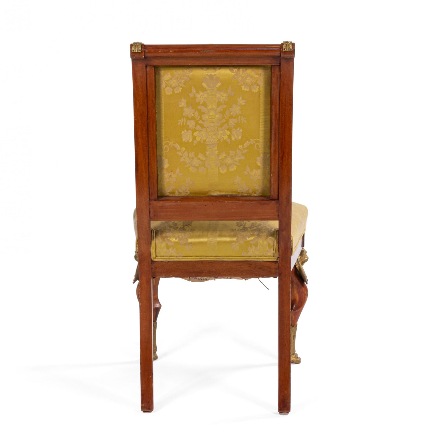 2 French Empire-style (19th Cent) mahogany side chairs with bronze trim and gold damask upholstery. (2 - PRICED EACH) (See also: matching loveseat: 031828A, 2 matching arm chairs: 031828B)