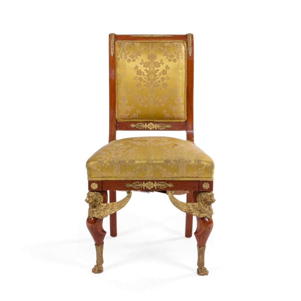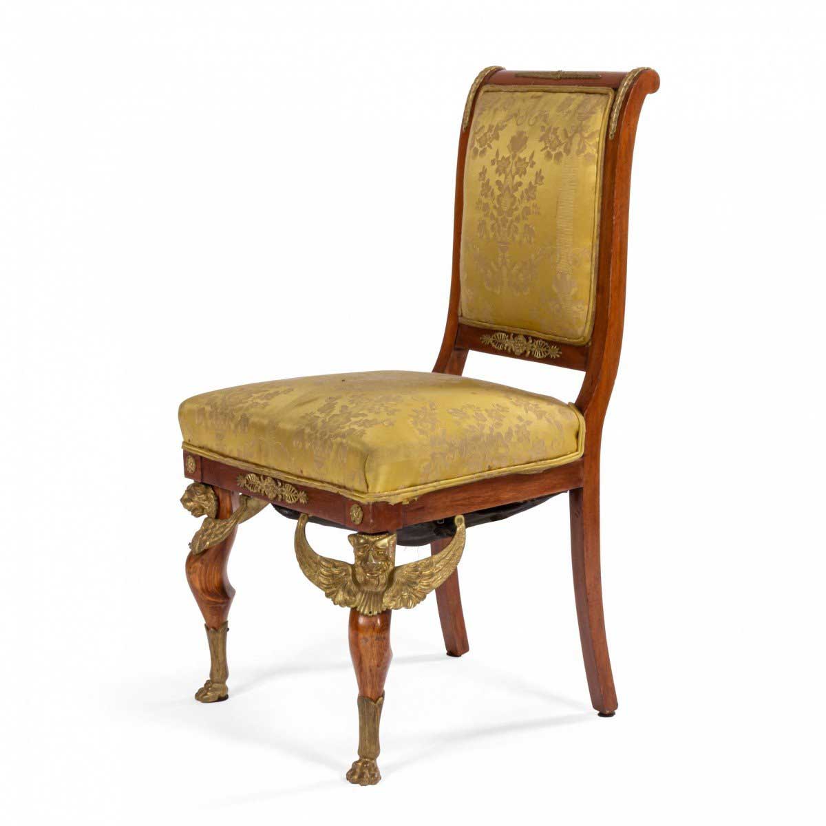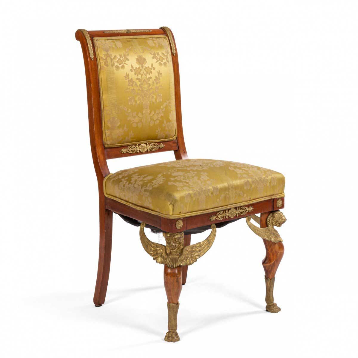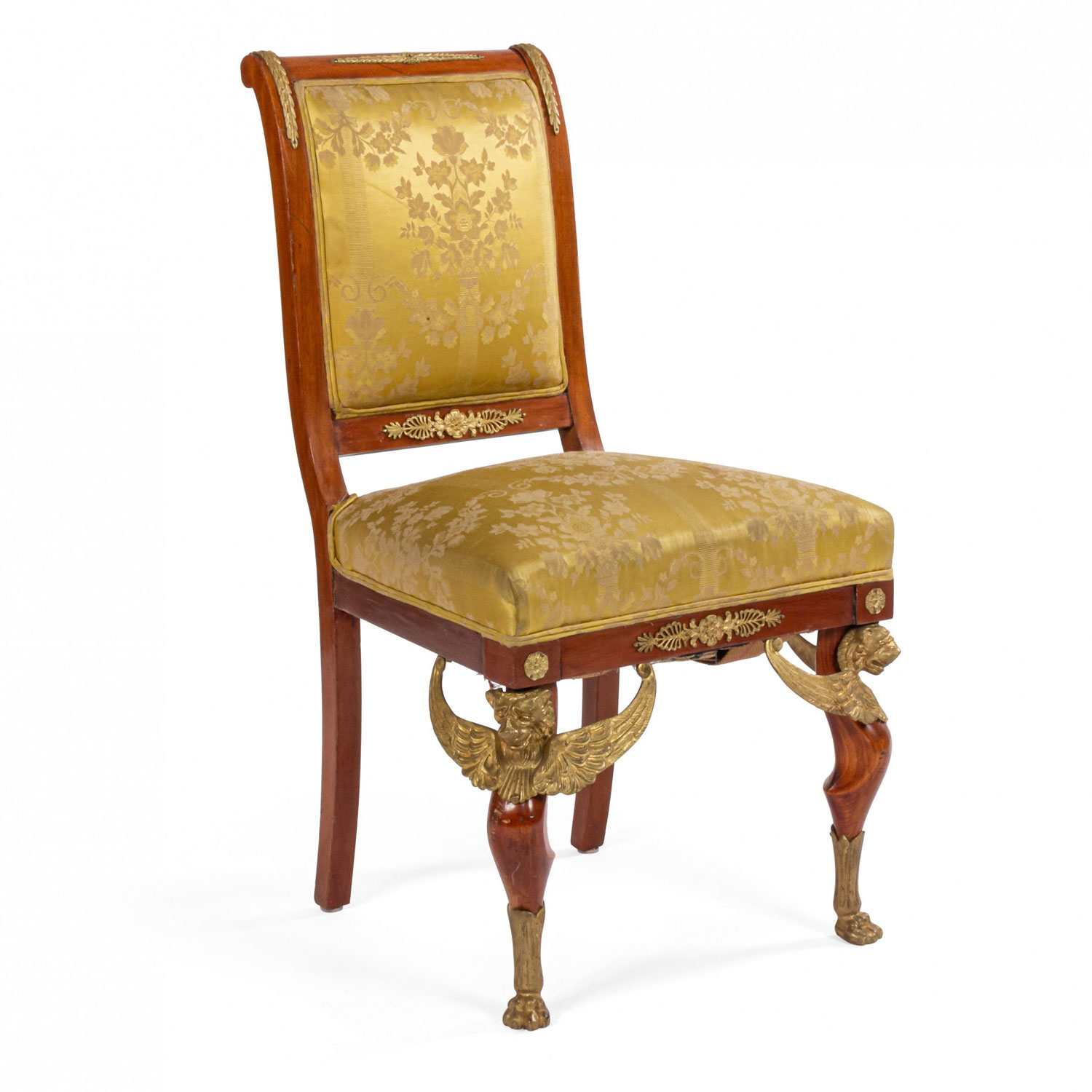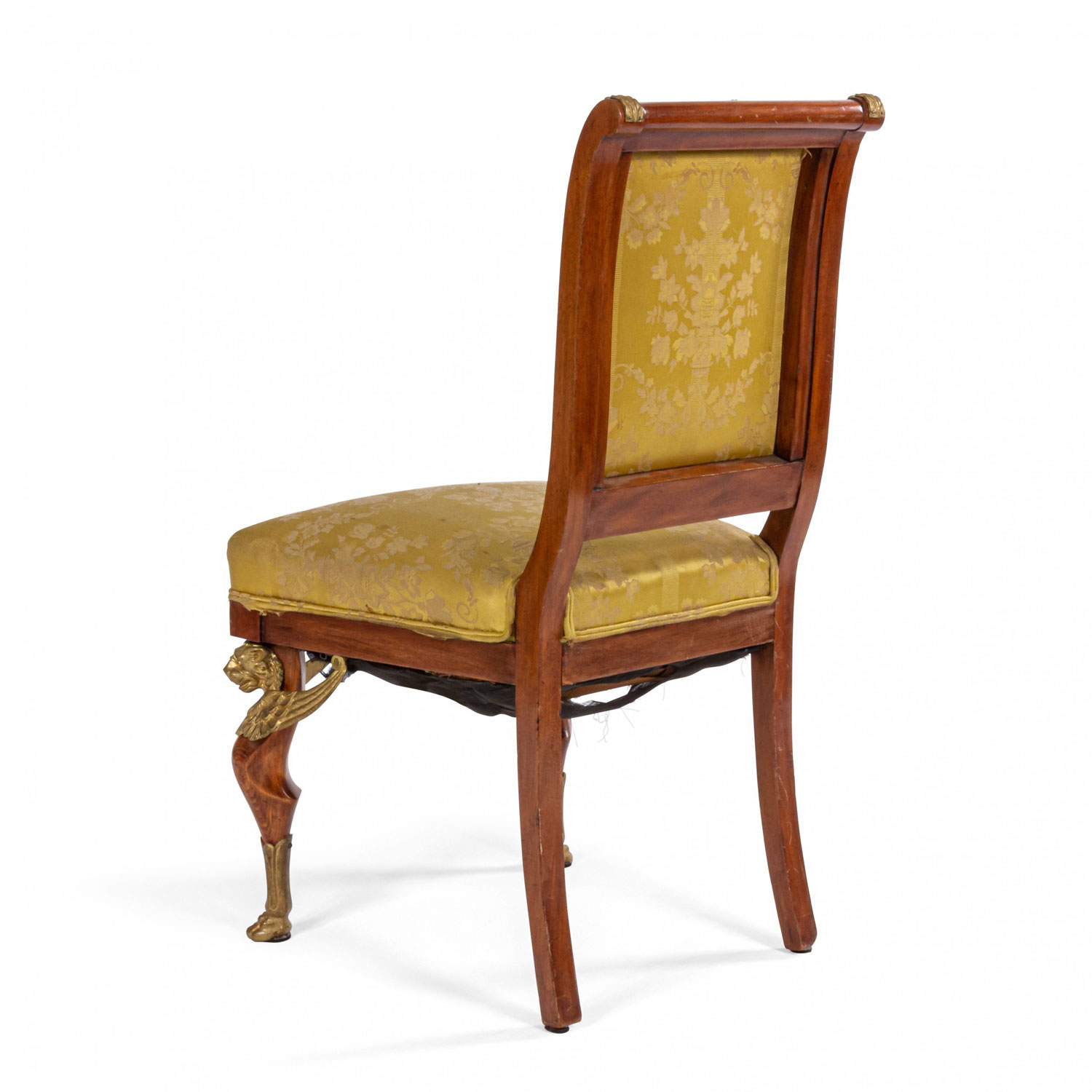 2 French Empire-style (19th Cent) mahogany side chairs with bronze trim and gold damask upholstery. (2 - PRICED EACH) (See also: matching loveseat: 031828A, 2 matching arm chairs: 031828B)