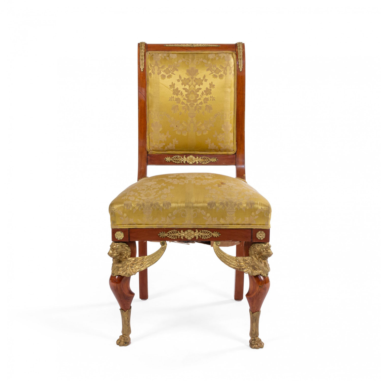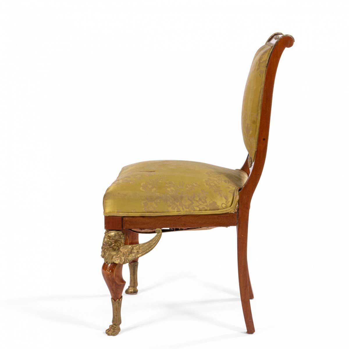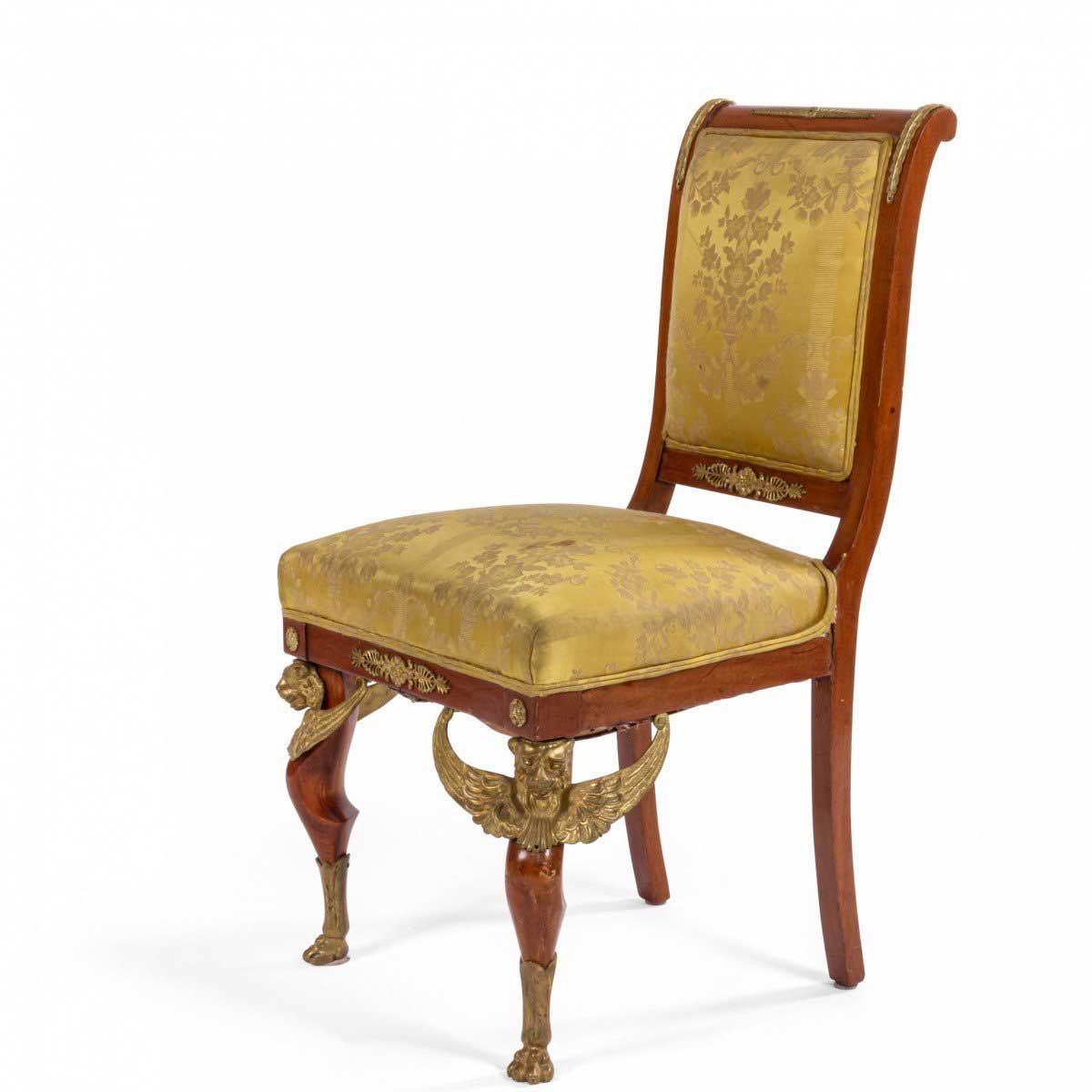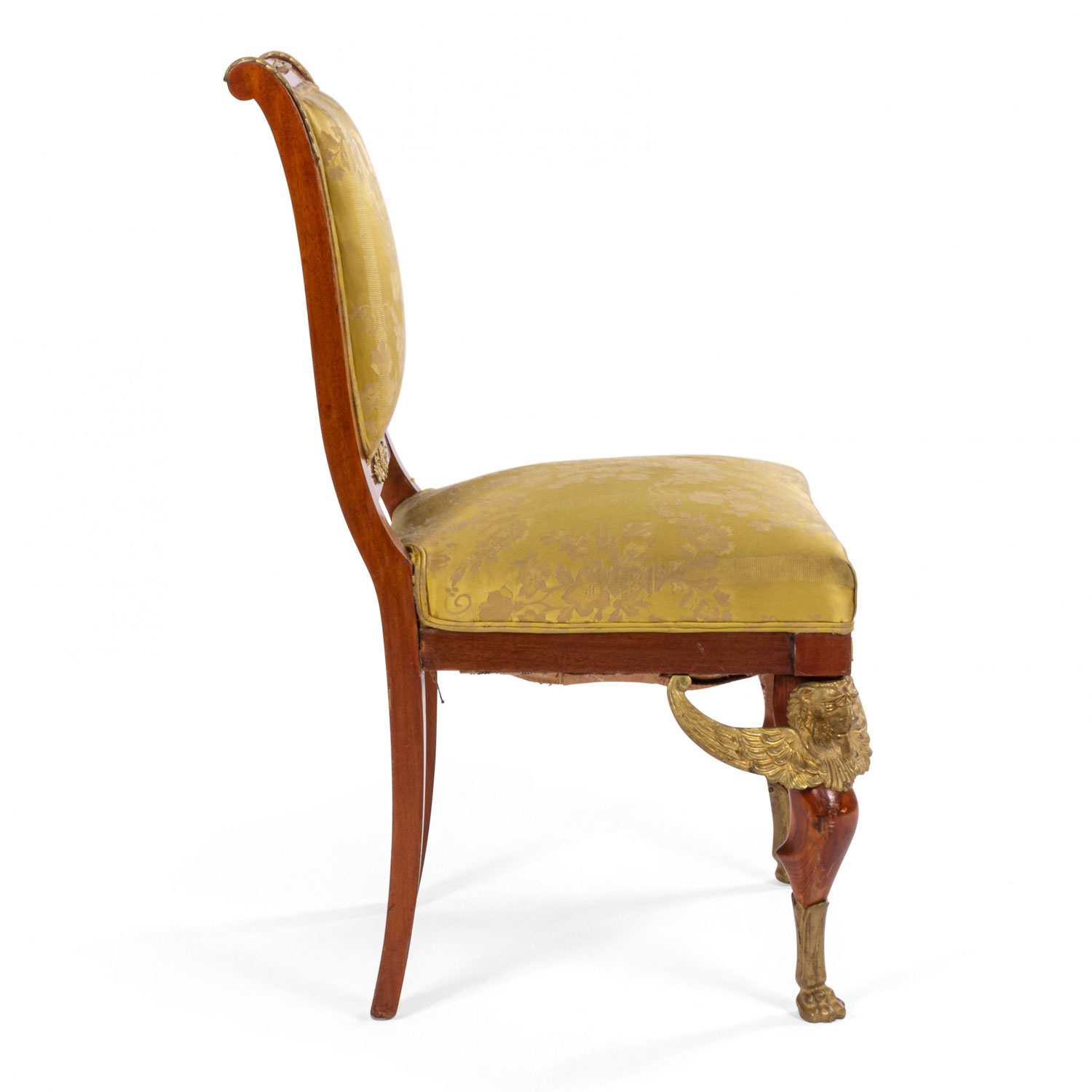 2 French Empire-style (19th Cent) mahogany side chairs with bronze trim and gold damask upholstery. (2 - PRICED EACH) (See also: matching loveseat: 031828A, 2 matching arm chairs: 031828B)
