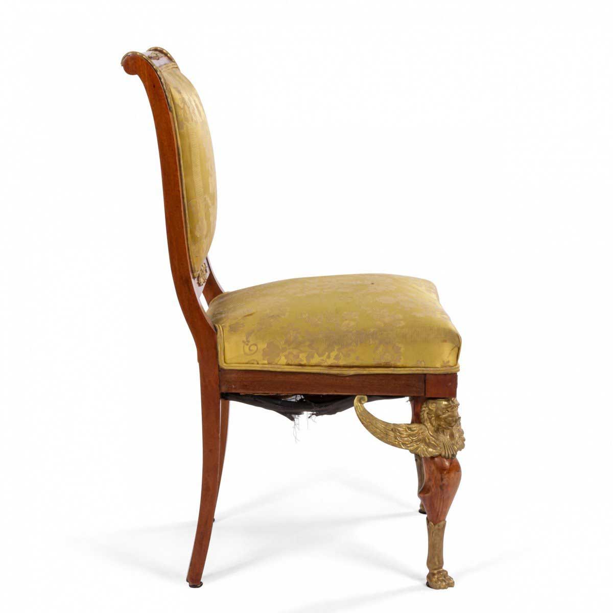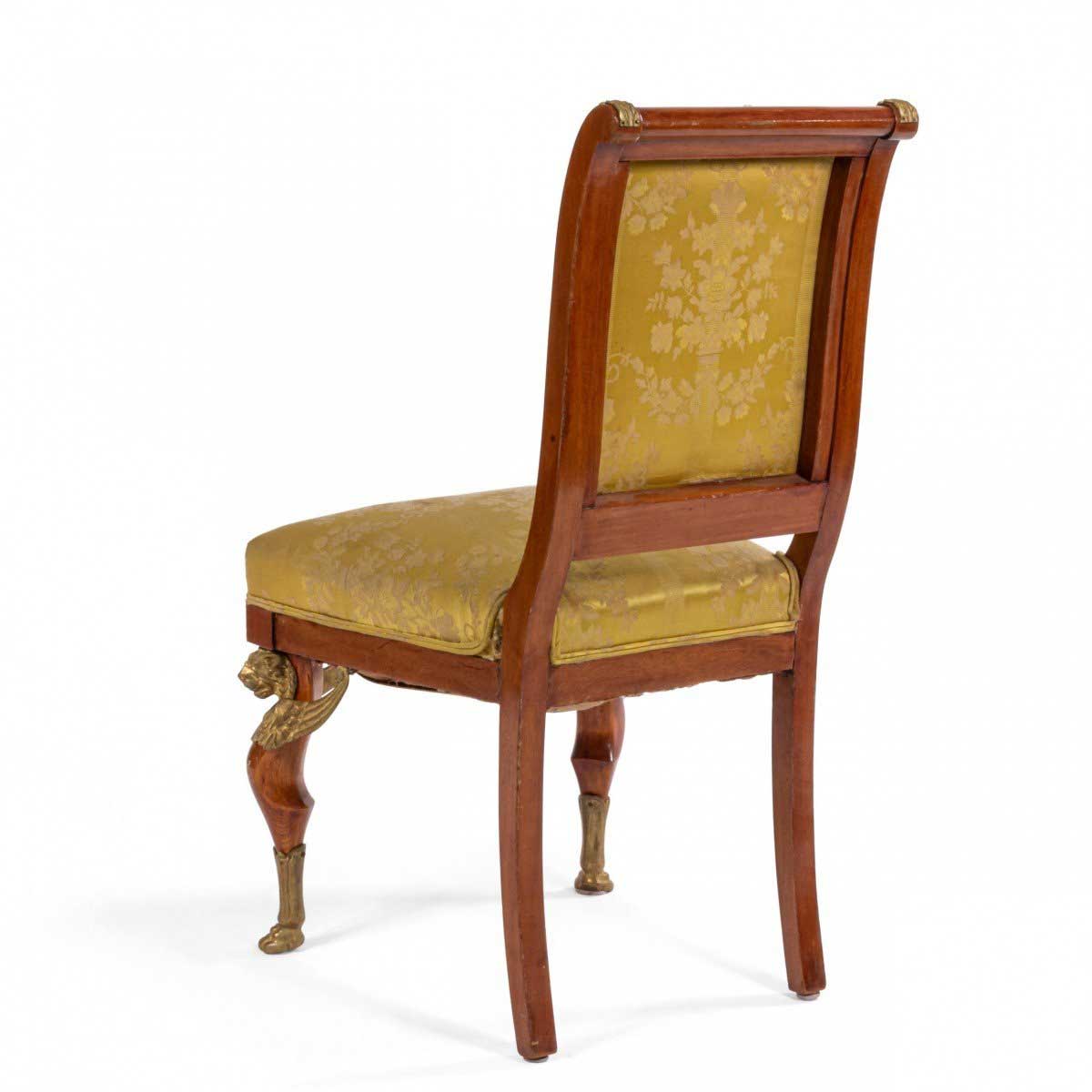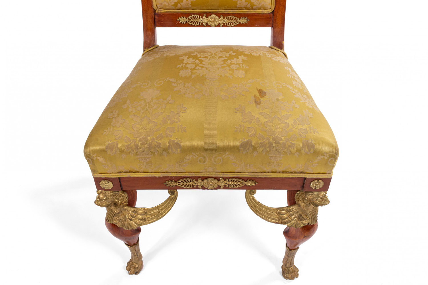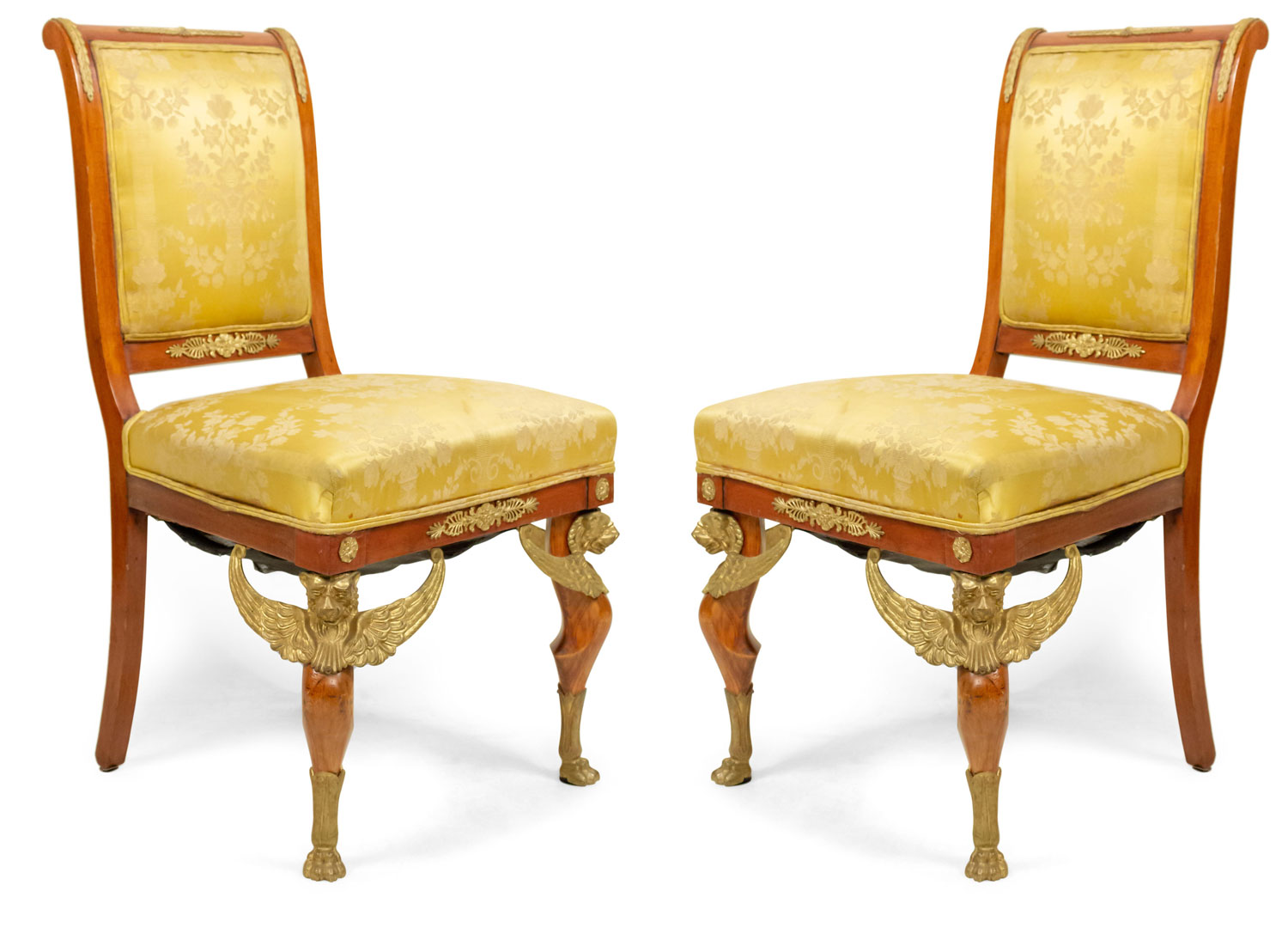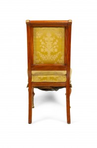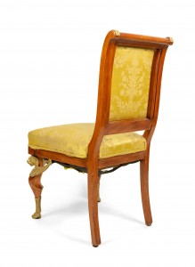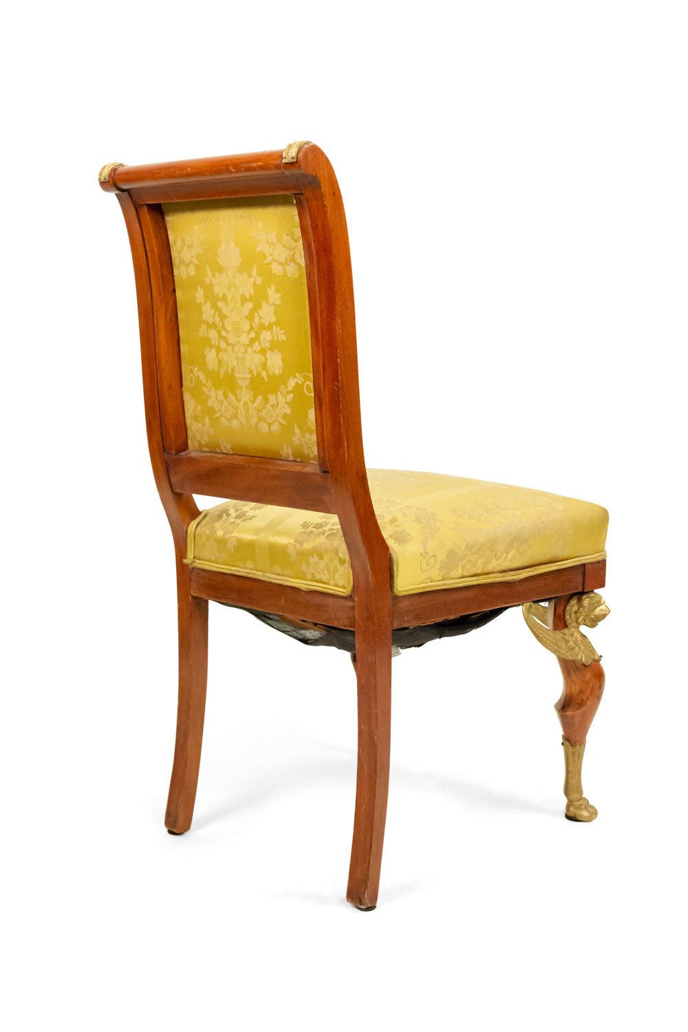 2 French Empire-style (19th Cent) mahogany side chairs with bronze trim and gold damask upholstery. (2 - PRICED EACH) (See also: matching loveseat: 031828A, 2 matching arm chairs: 031828B)