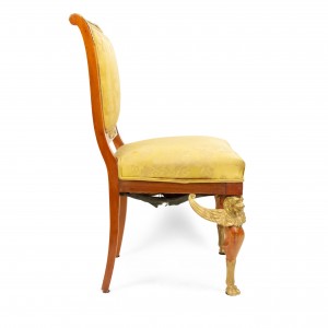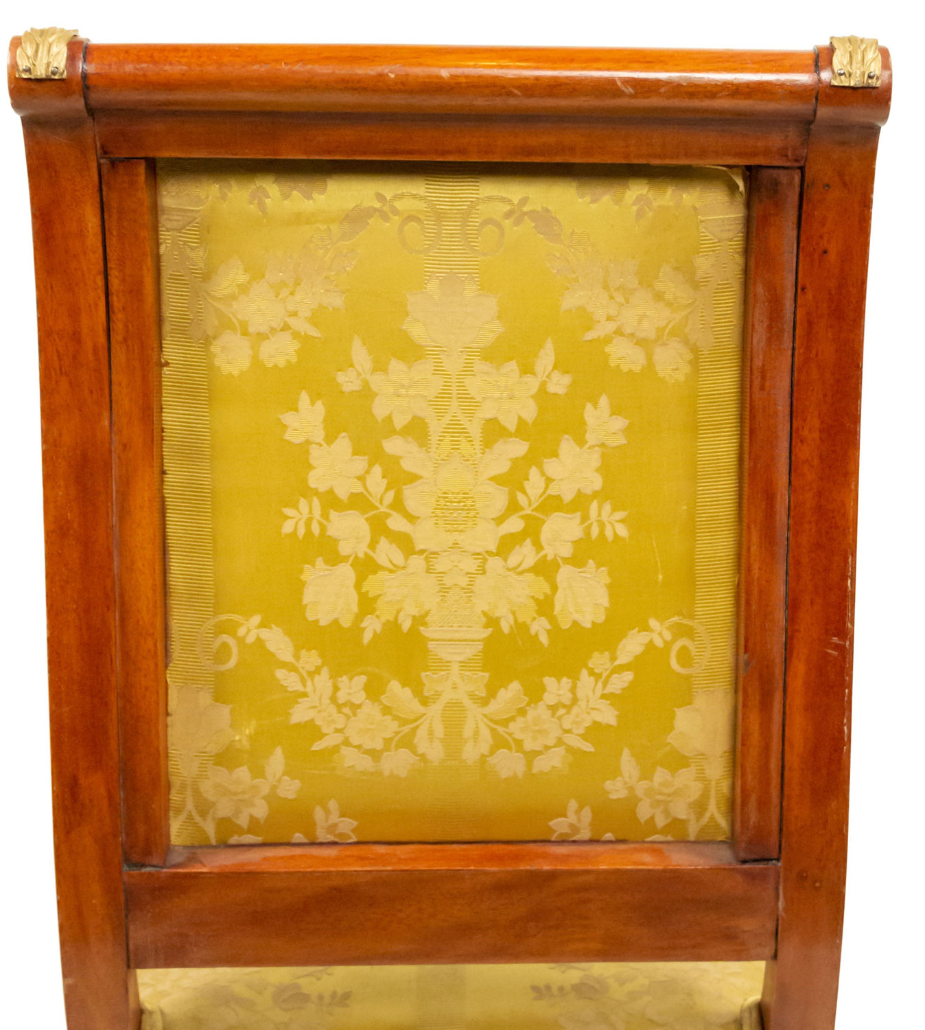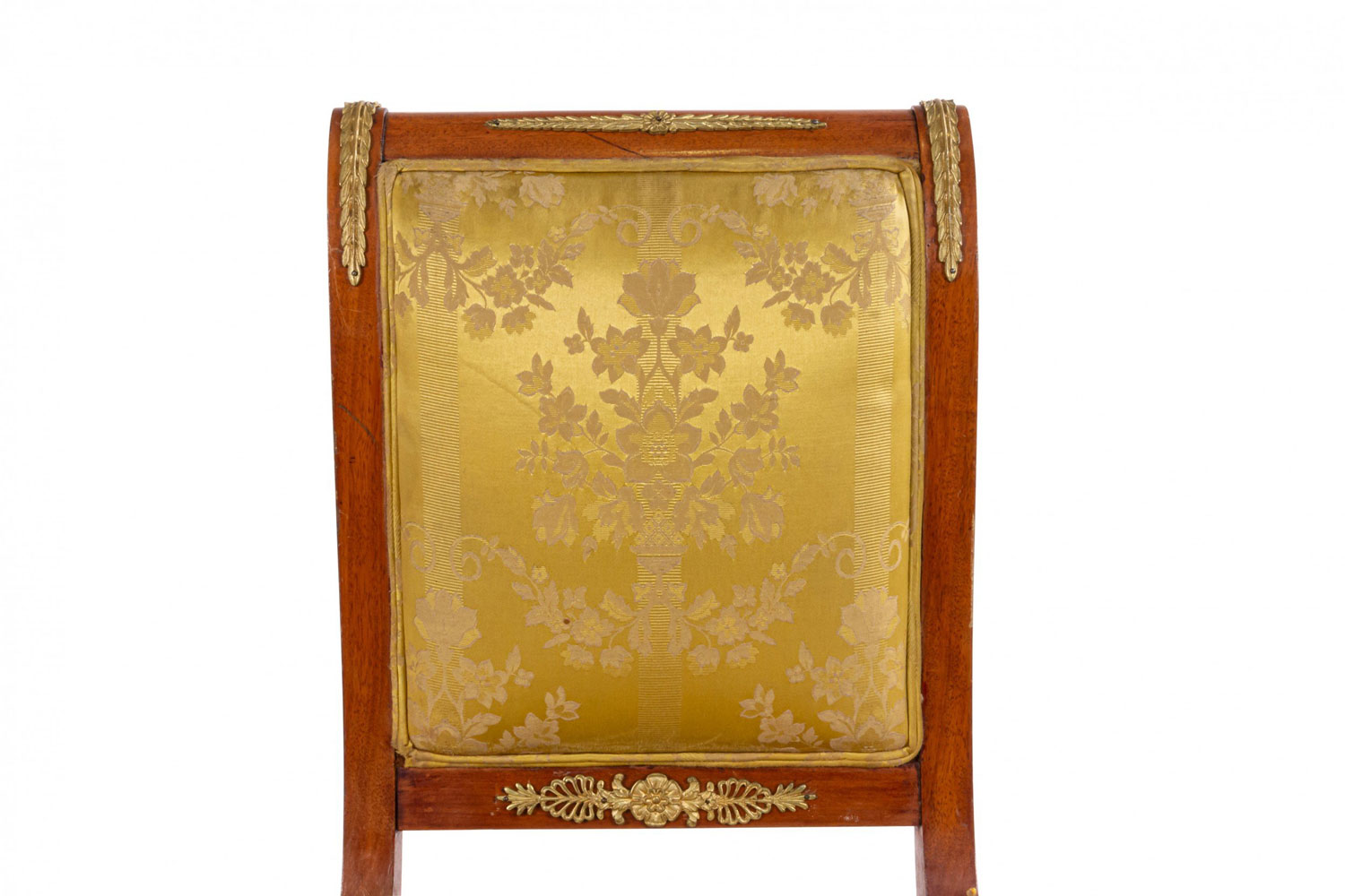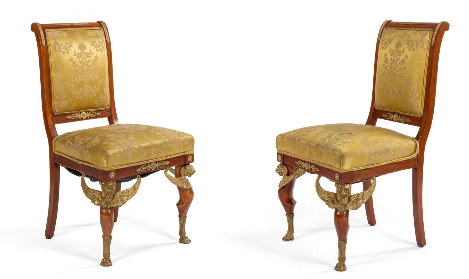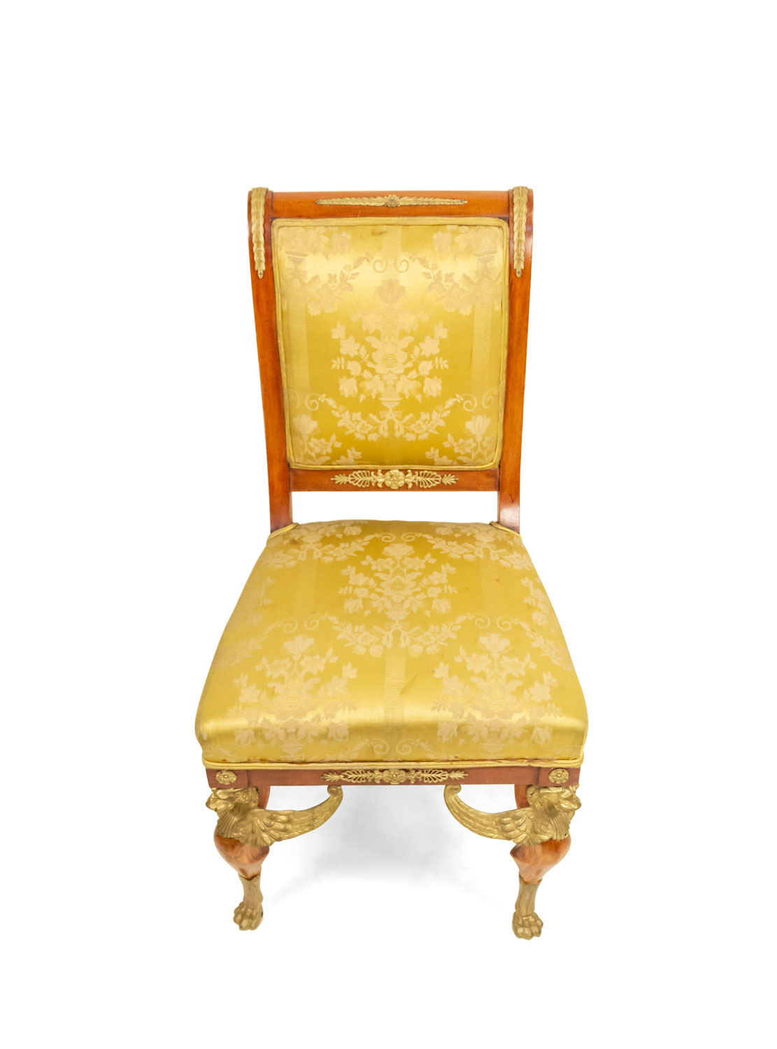 2 French Empire-style (19th Cent) mahogany side chairs with bronze trim and gold damask upholstery. (2 - PRICED EACH) (See also: matching loveseat: 031828A, 2 matching arm chairs: 031828B)