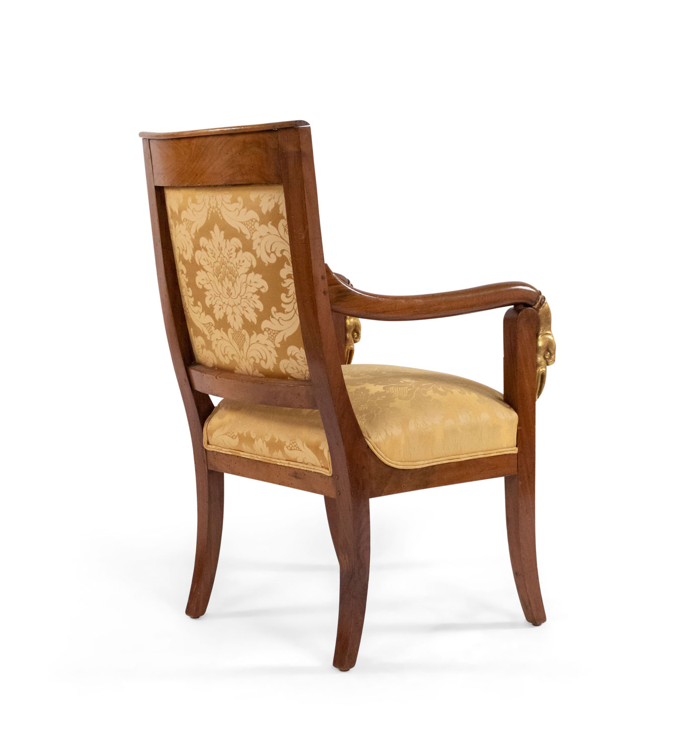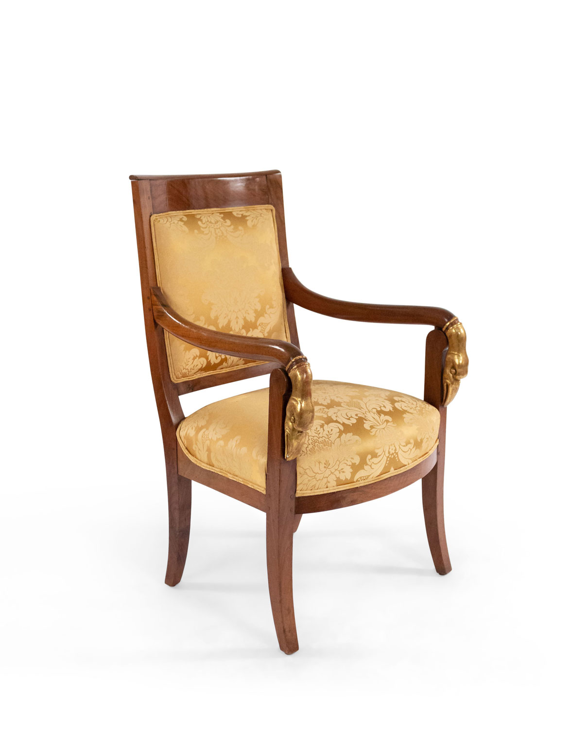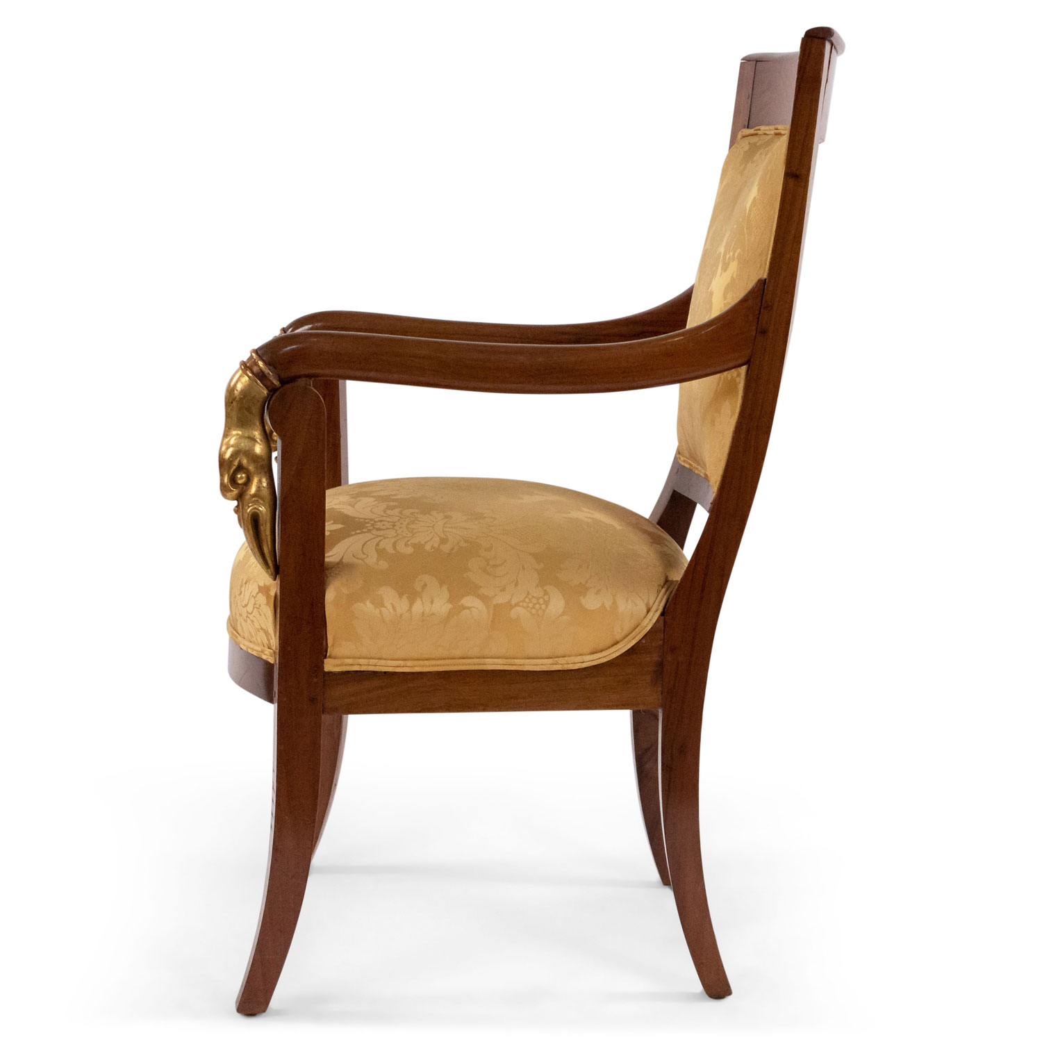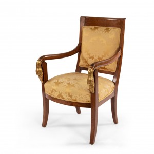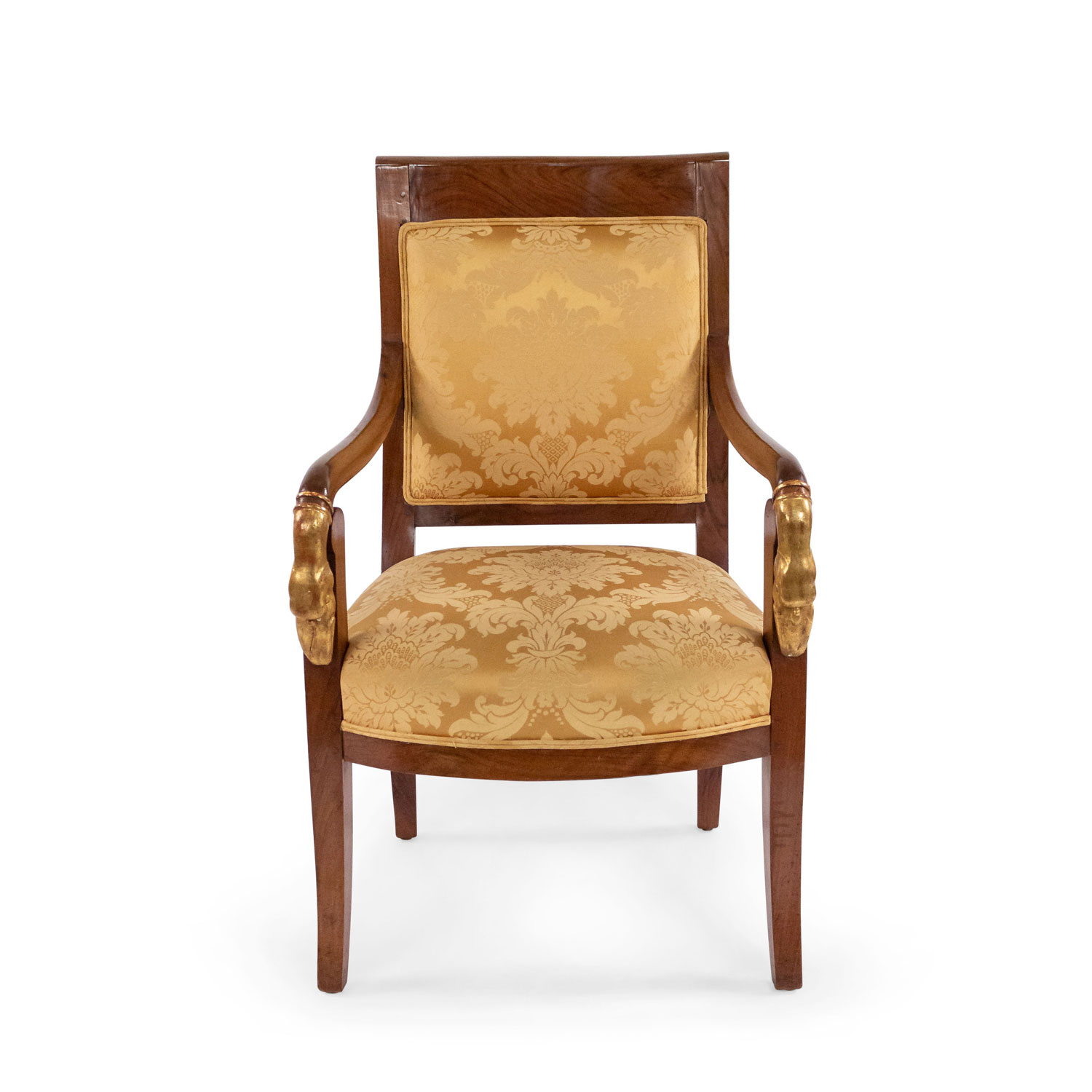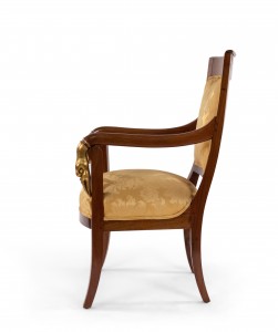 4 French Empire style (19th Cent) mahogany arm chairs with gilt swan head arms and gold upholstery (PRICED EACH)(See also: matching settee: 054123A, matching bergeres: 054123B)