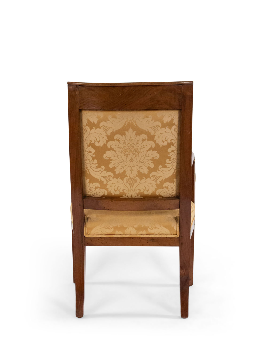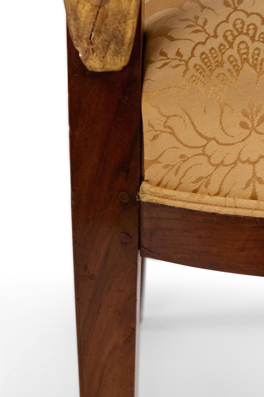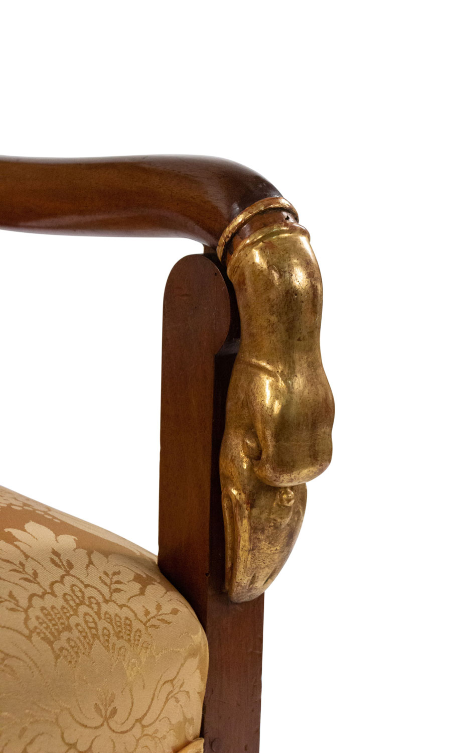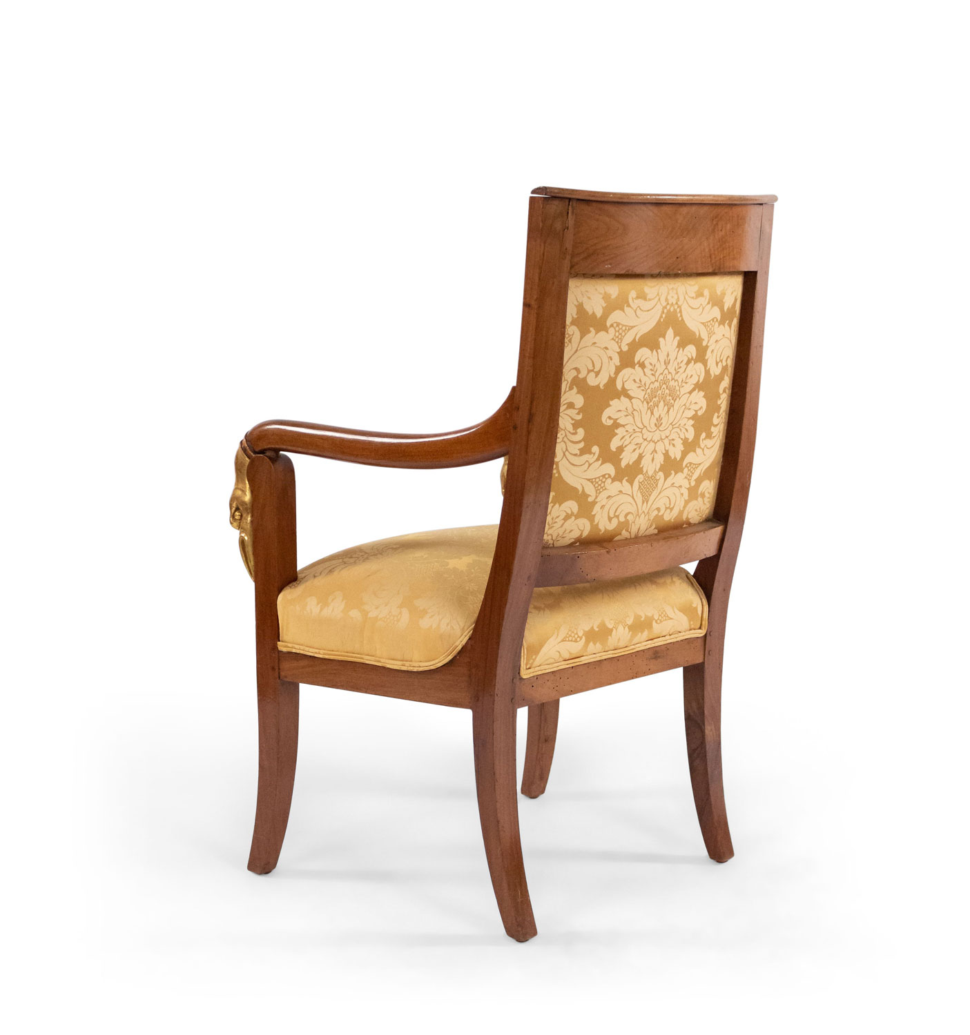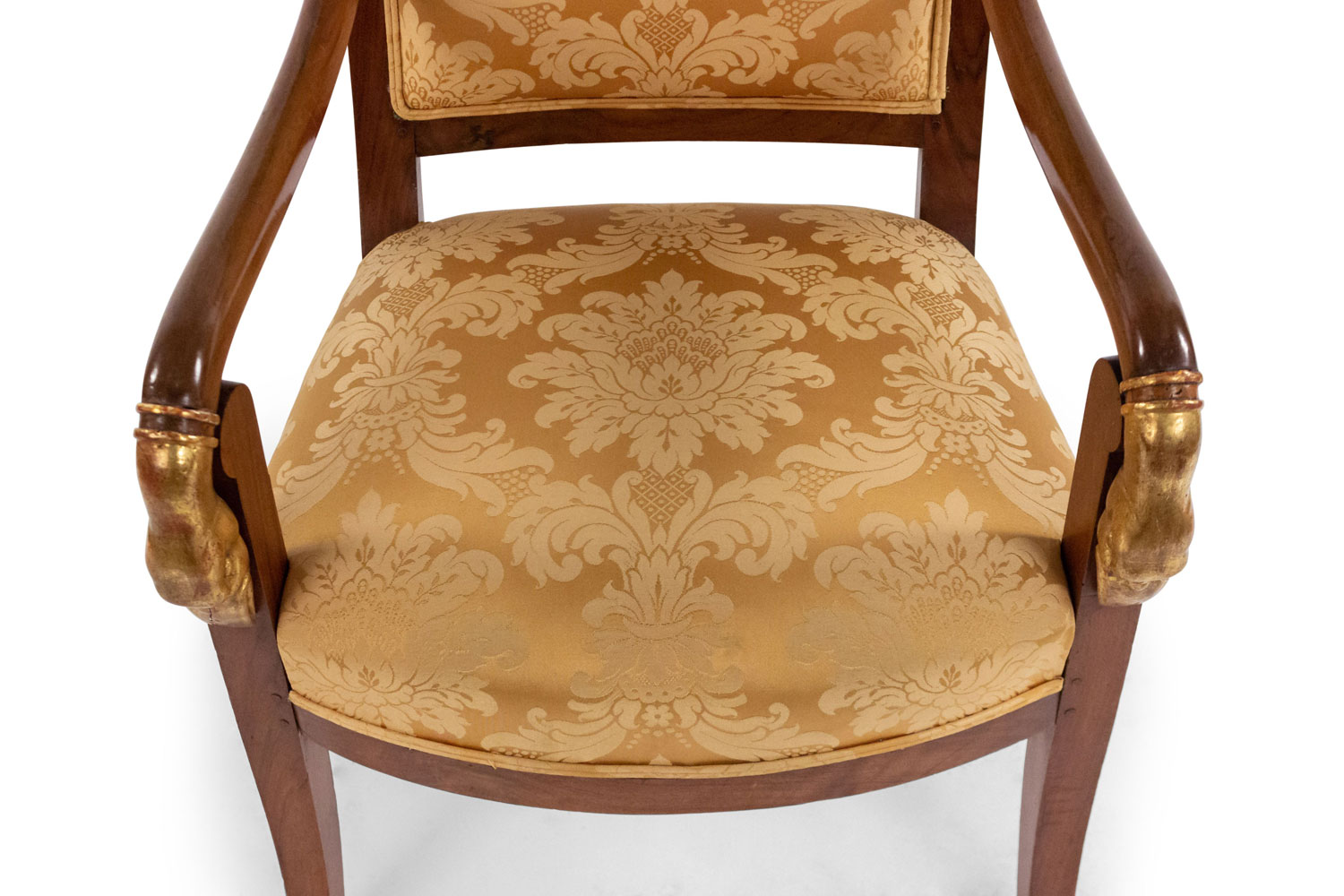 4 French Empire style (19th Cent) mahogany arm chairs with gilt swan head arms and gold upholstery (PRICED EACH)(See also: matching settee: 054123A, matching bergeres: 054123B)