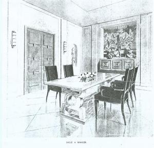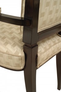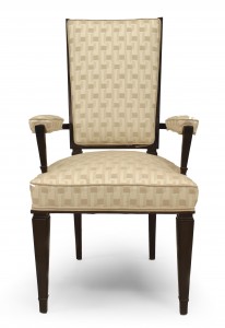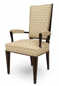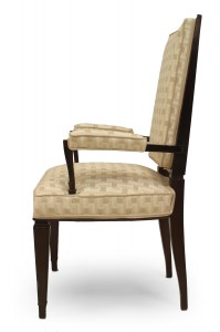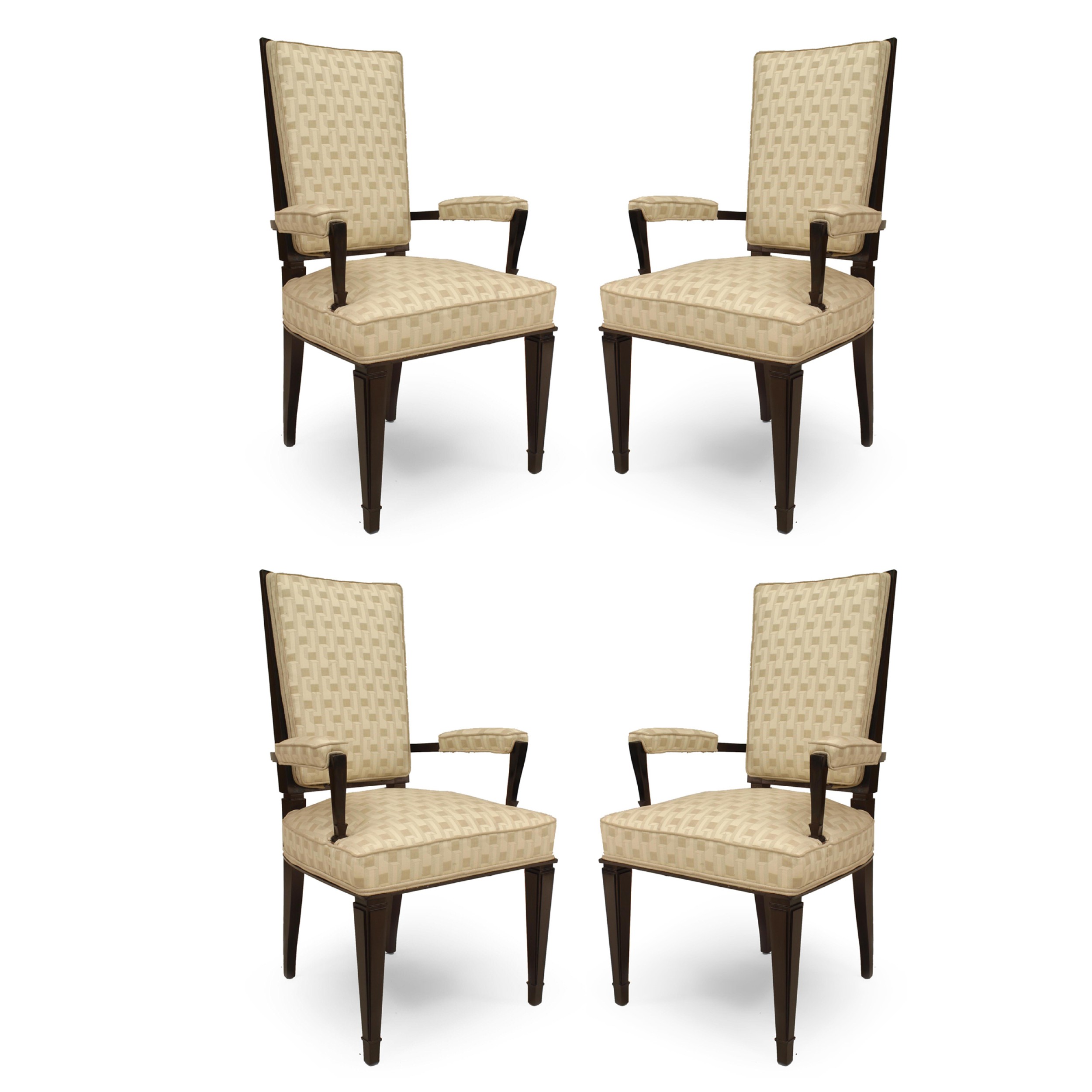 4 French 1940s ebonized high back open arm chairs with geometric design upholstery (PRICED EACH)