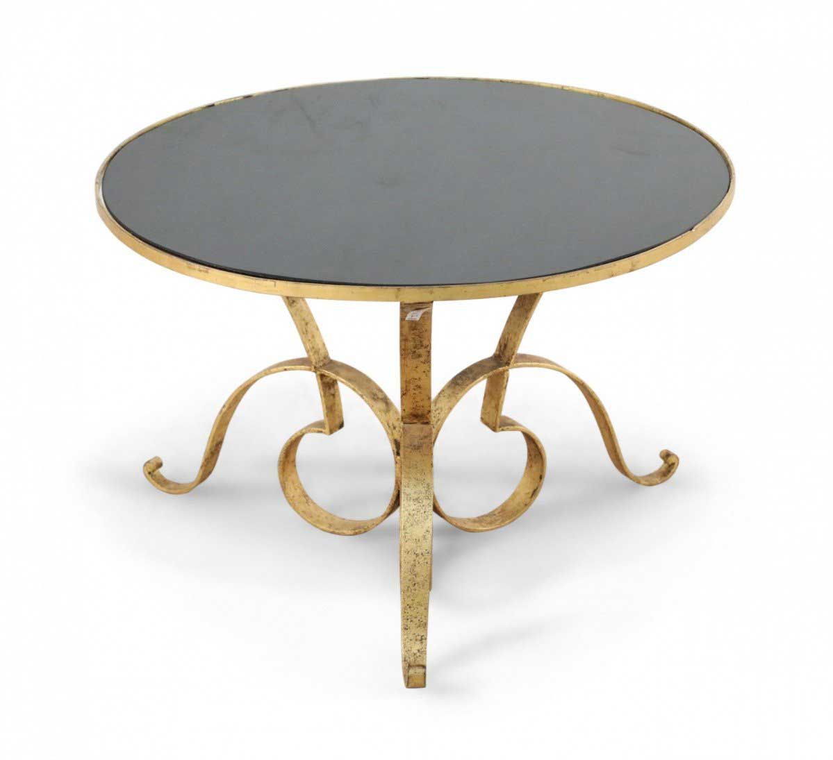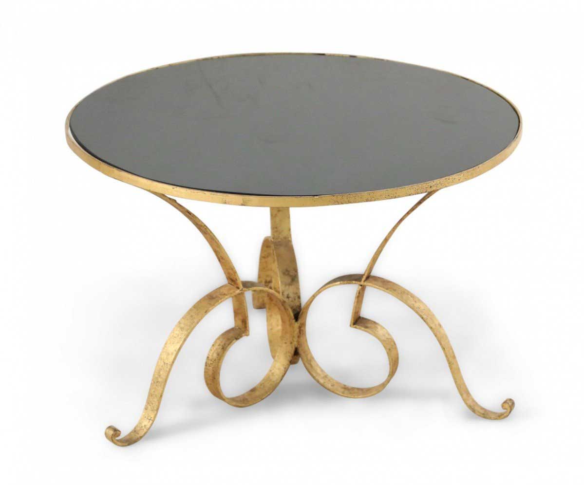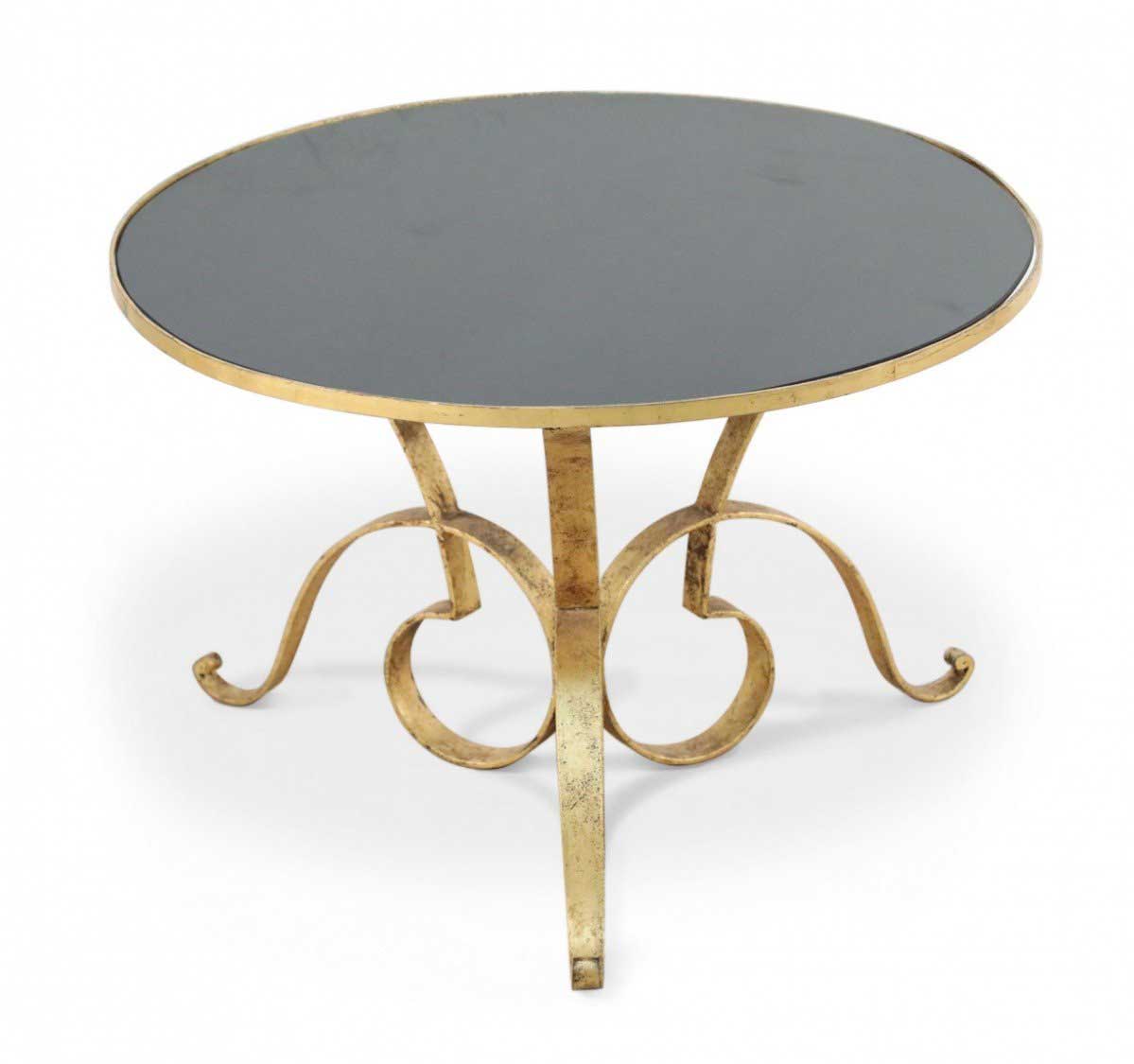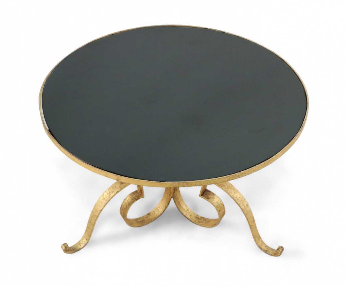 French 1940's gilded hand-hammered iron coffee table with triple scroll design base supporting a circular black opaque glass top.