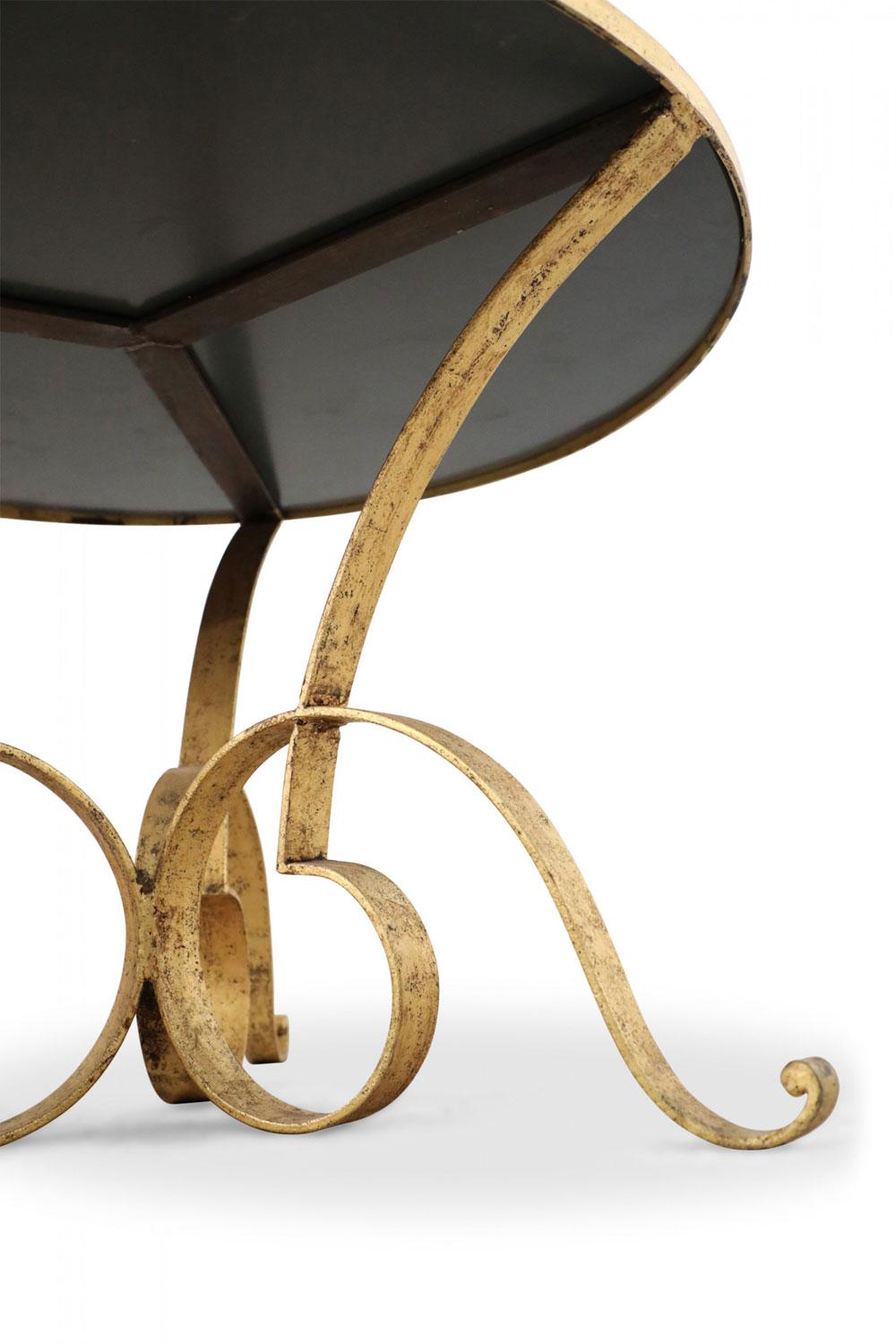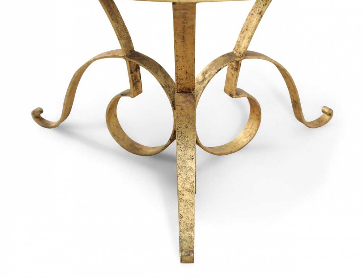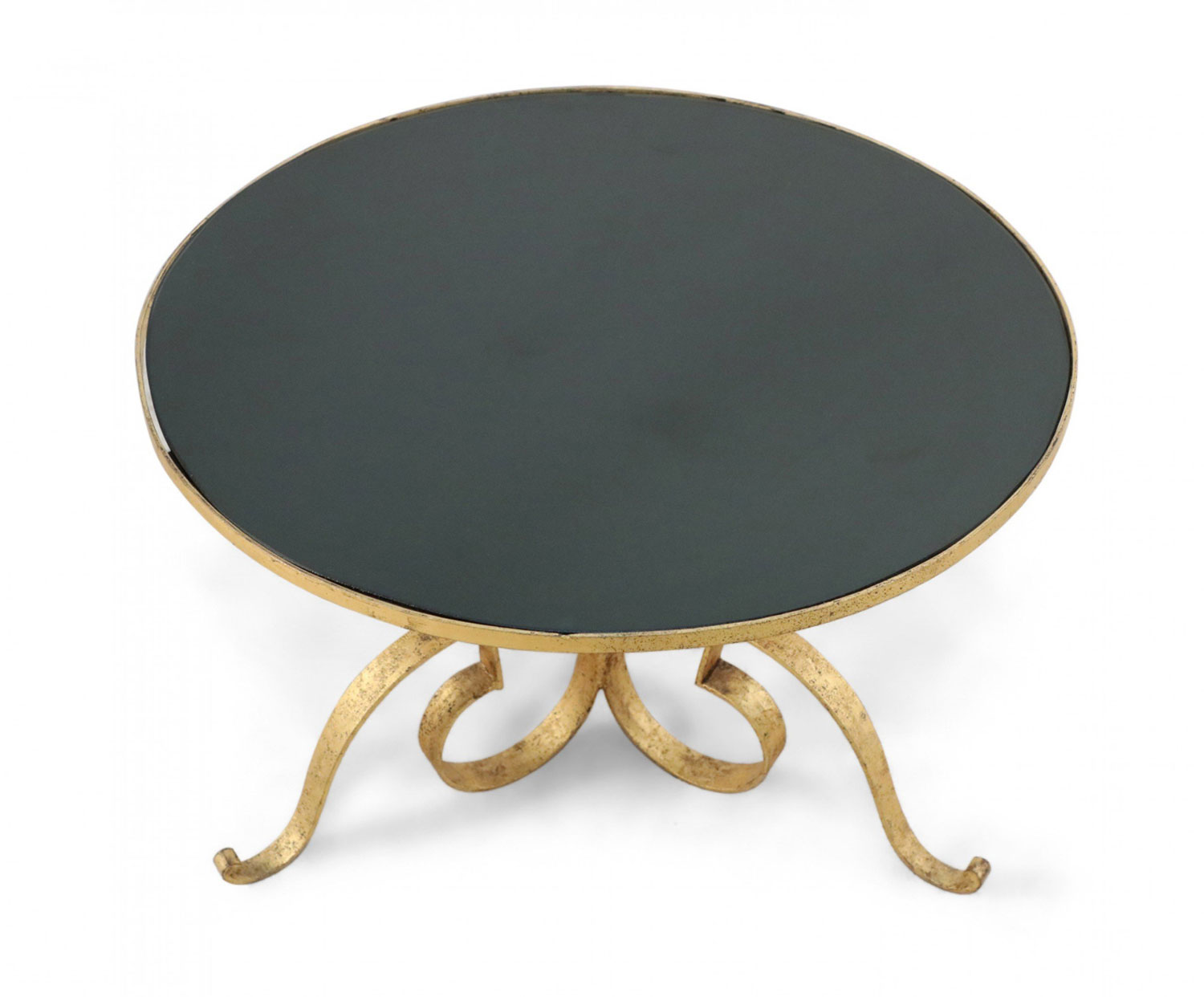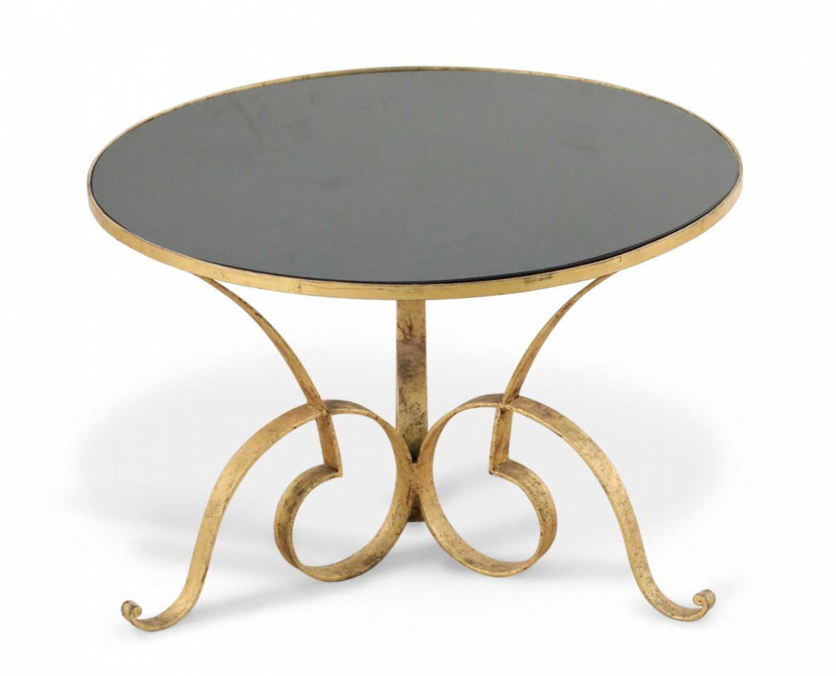 French 1940's gilded hand-hammered iron coffee table with triple scroll design base supporting a circular black opaque glass top.