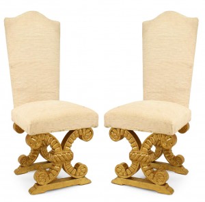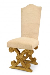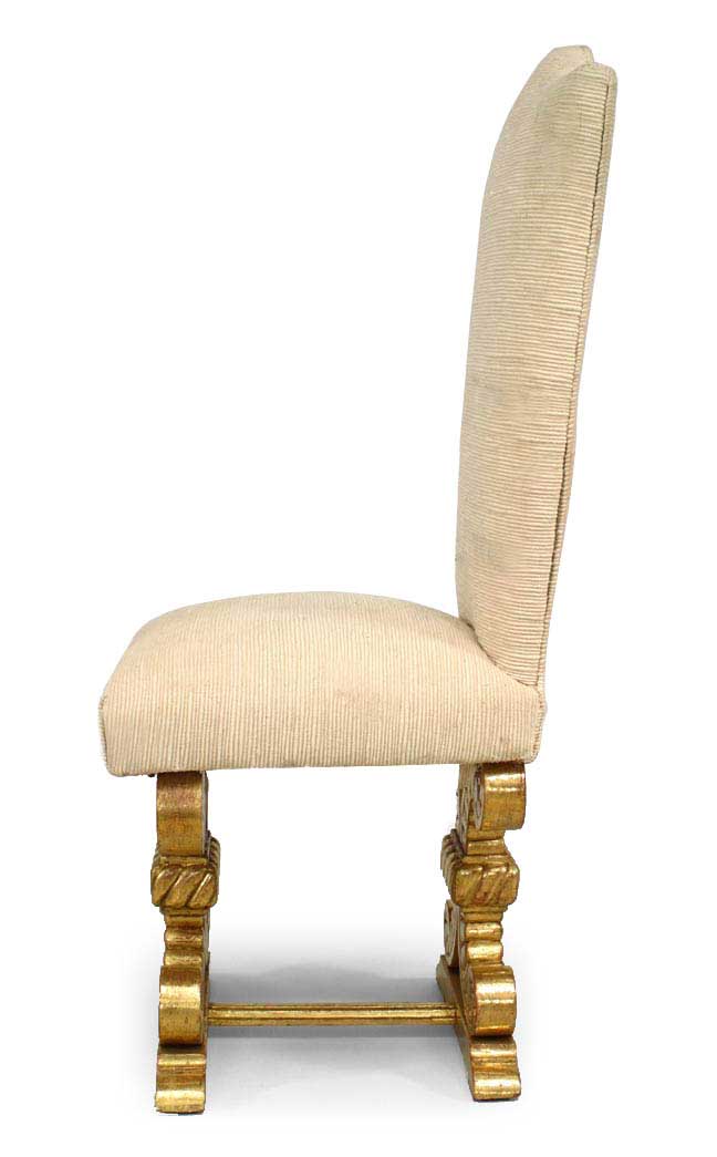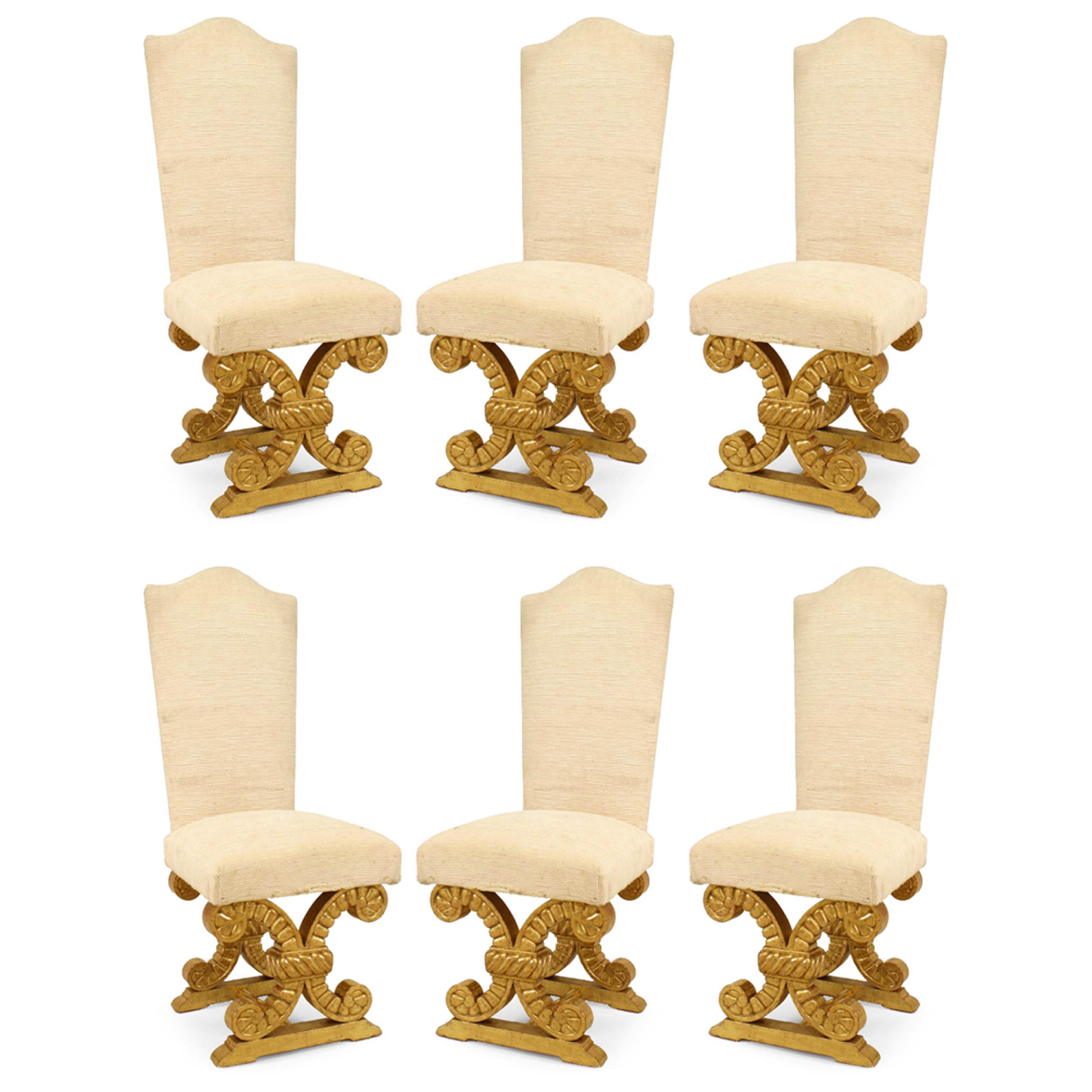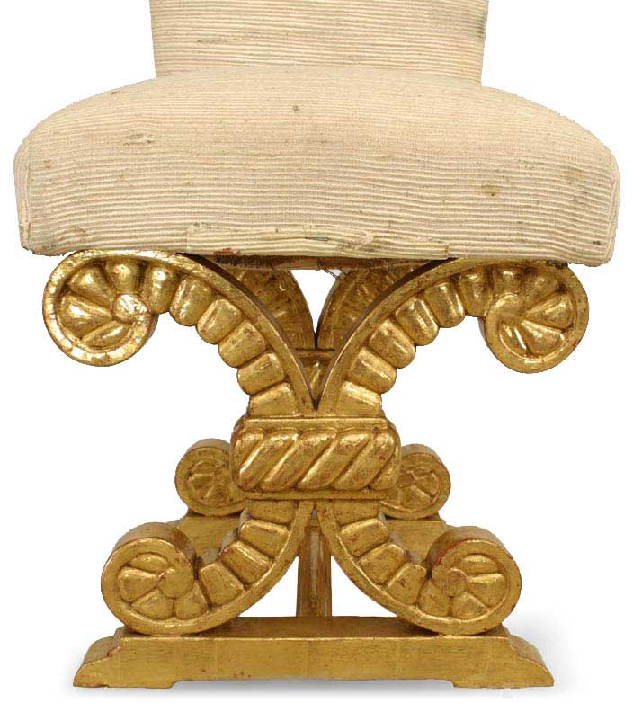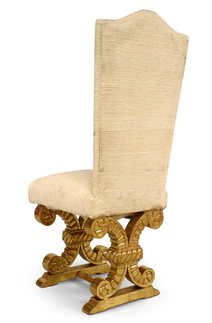 8 French 1940s side chairs with arched upholstered back & seat on gilt carved crossed plume form legs joined by a stretcher. (PRICED EACH)