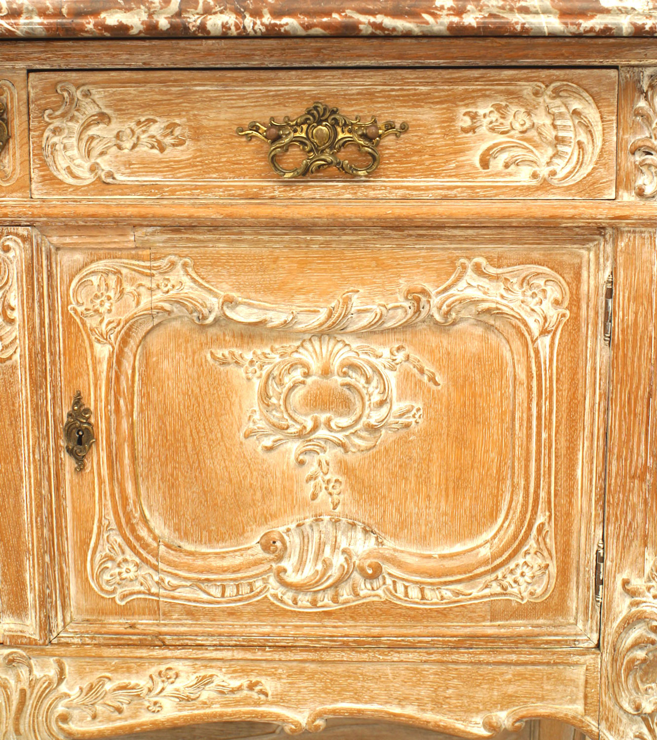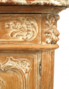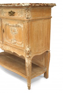 2 French Louis XV style (19th Century) bleached carved 2 door sideboard cabinets with shelf and marble top. (PRICED EACH)