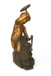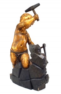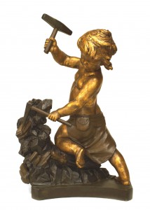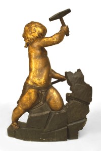 French Louis XV style (19th Cent) painted and gold trimmed figure of cupid with hammer and chisel