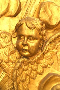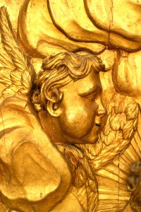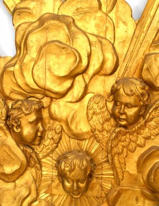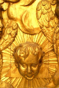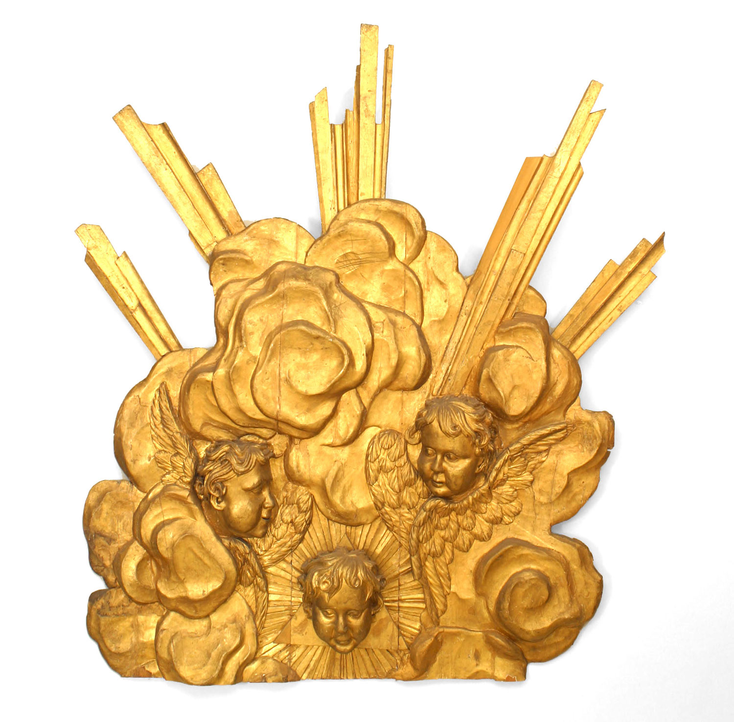 French Louis XV style (18/19th Century) large gilt wall plaque with cupid heads and sunburst center.