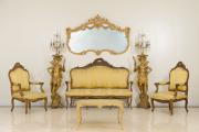 French Louis XV-style (19/20th Cent) walnut high-back settee with gold damask upholstery (See also: 2 matching armchairs: 031016B, 2 matching side chairs: 031016C)