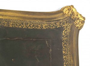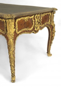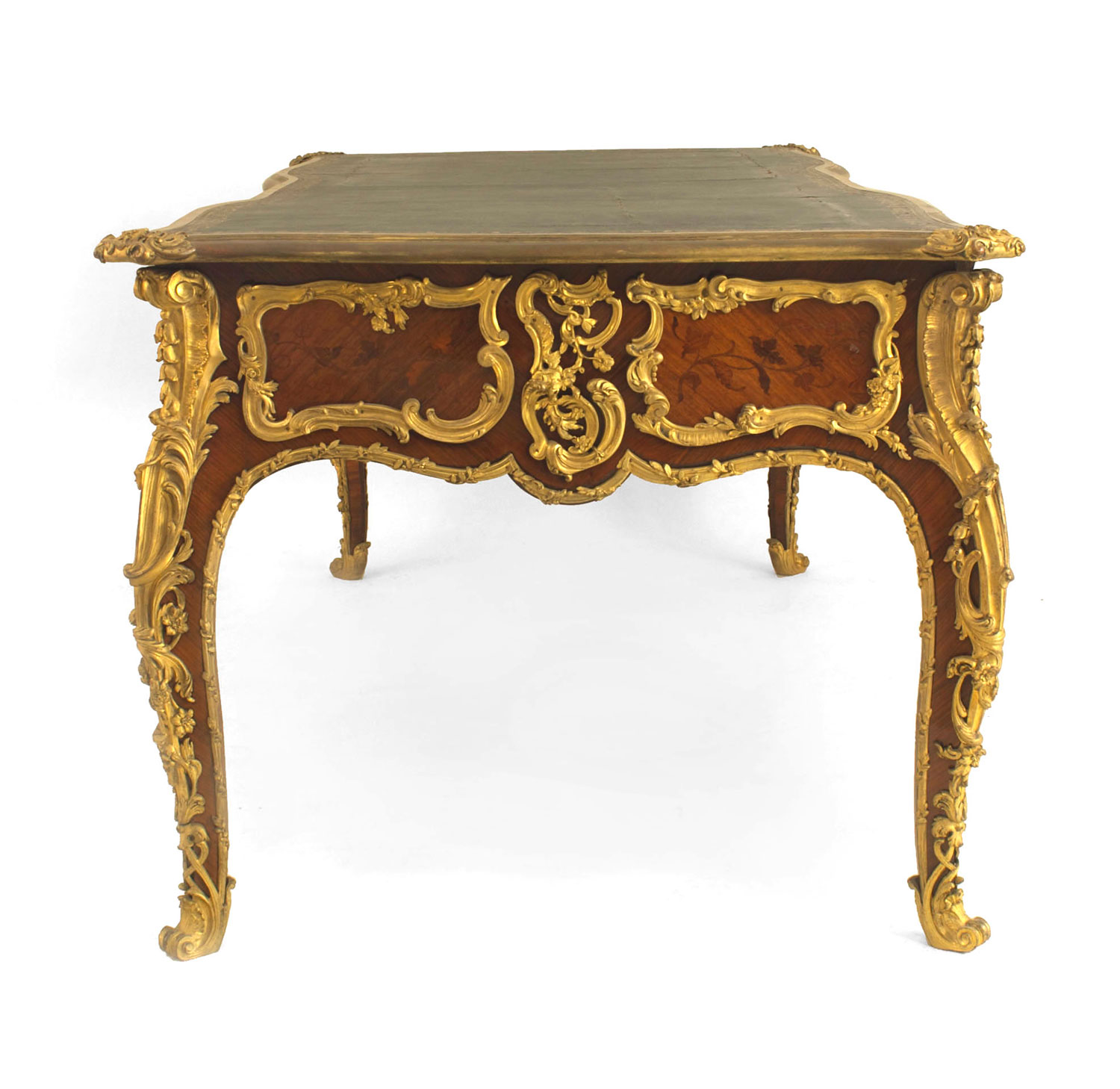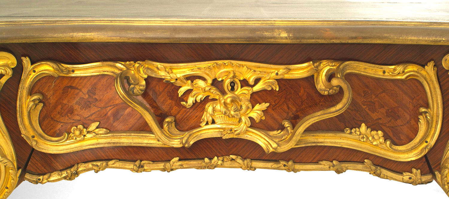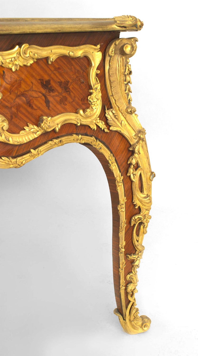 French Louis XV style (19th Century) ornate kingwood and bronze trimmed desk with inlaid drawers and dark green leather top with gold trim.