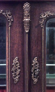 French Louis XV-style (19th Century) vitrine in the form of a miniature secretary with roll top and clear glass panels.