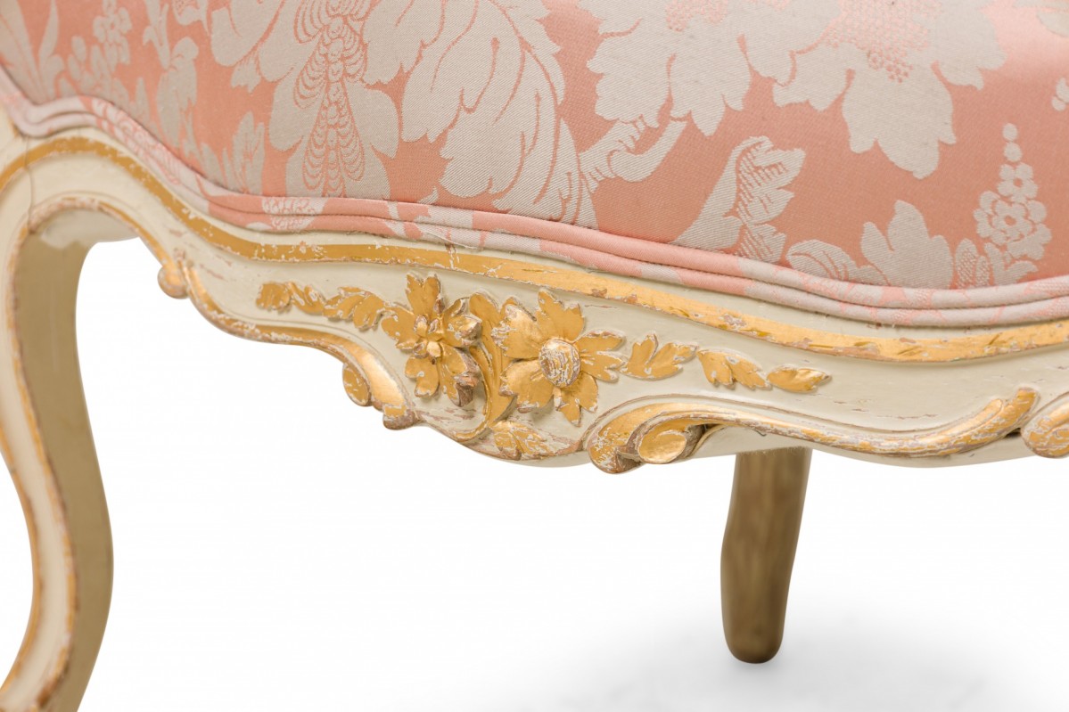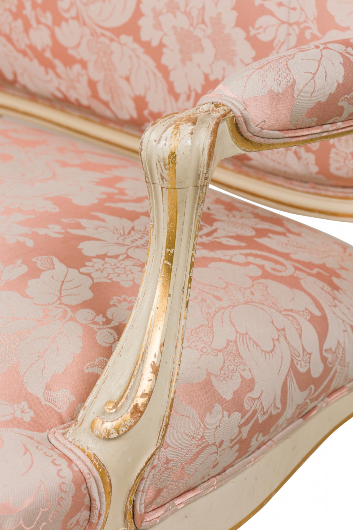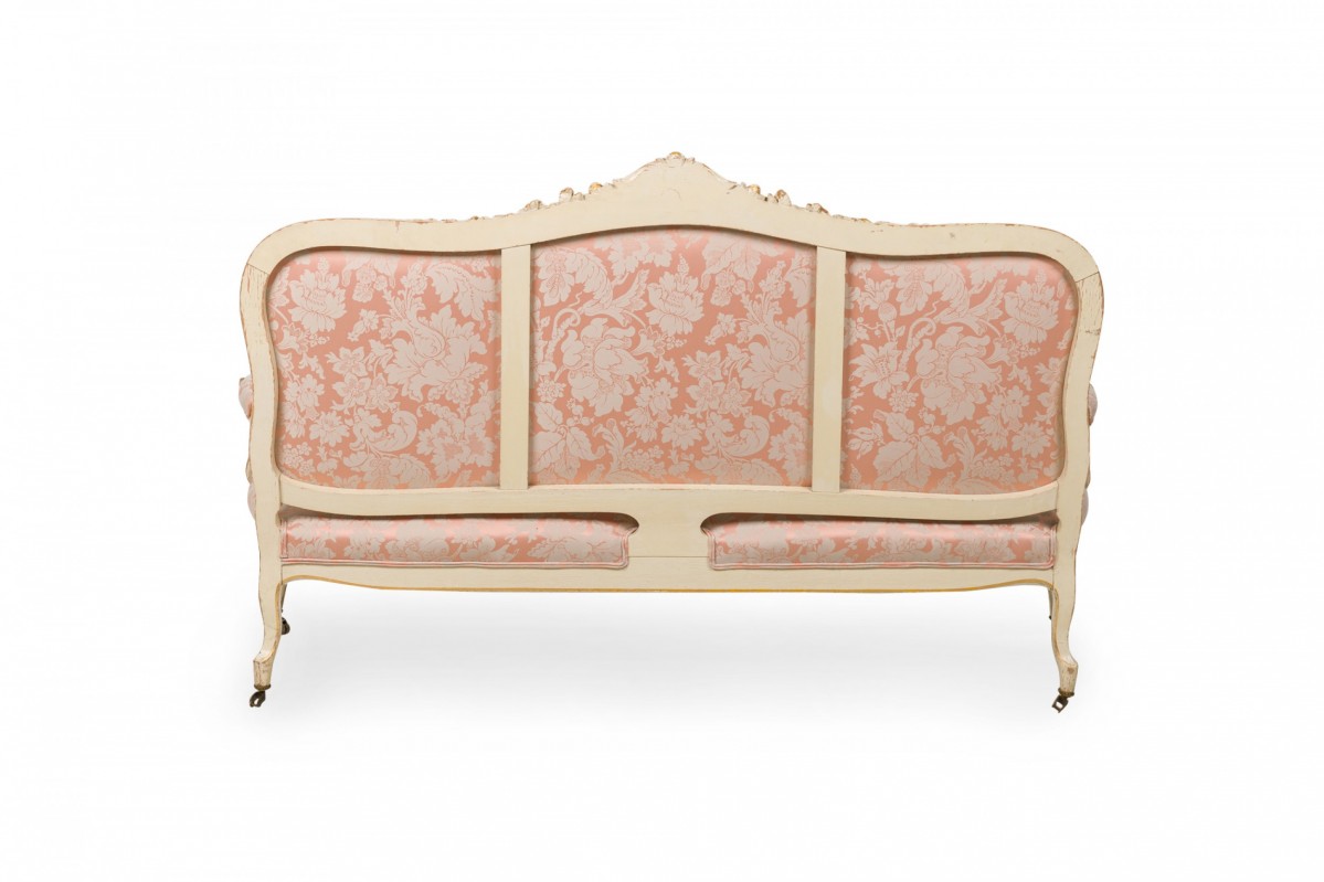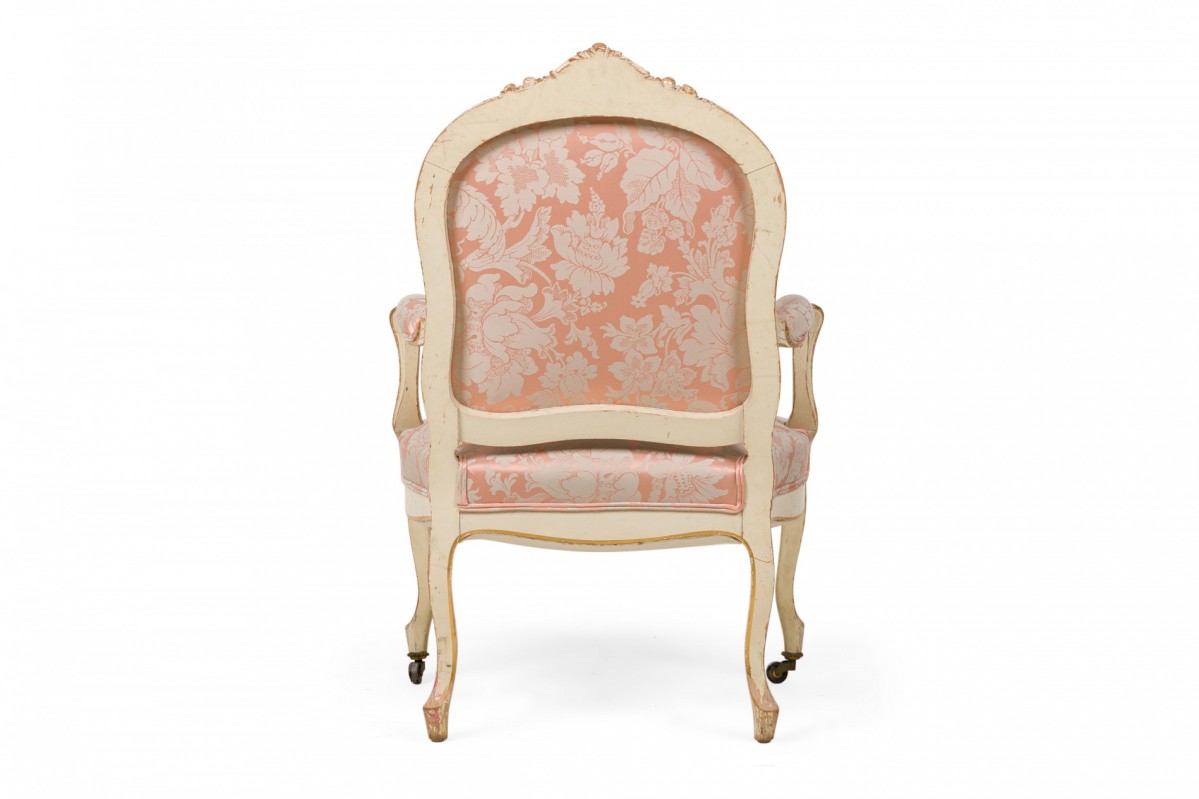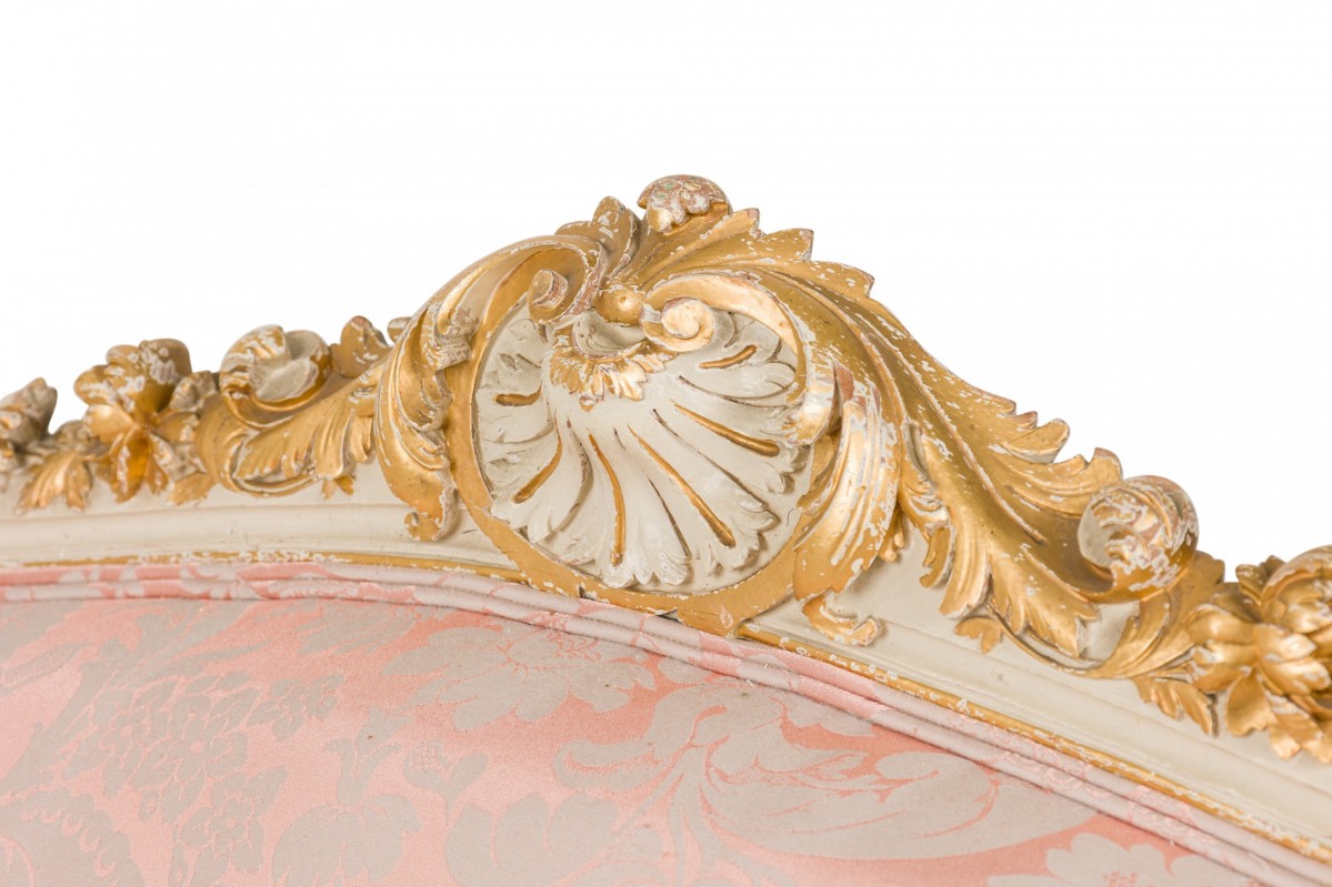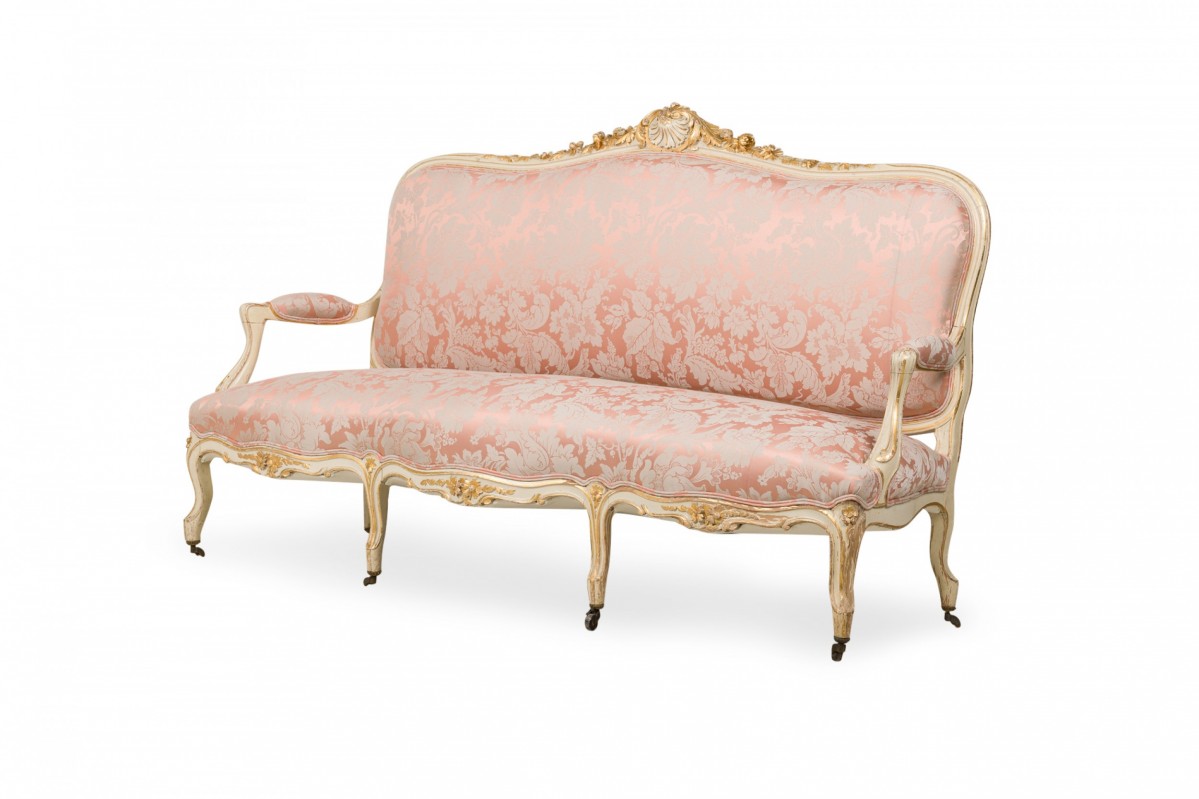 5 piece French Louis XV style (19th Cent) white and gilt painted living room set with carved back crests and complimentary upholstery (Available individually: Sofa: PPF295, 4 armchairs: PPF297)