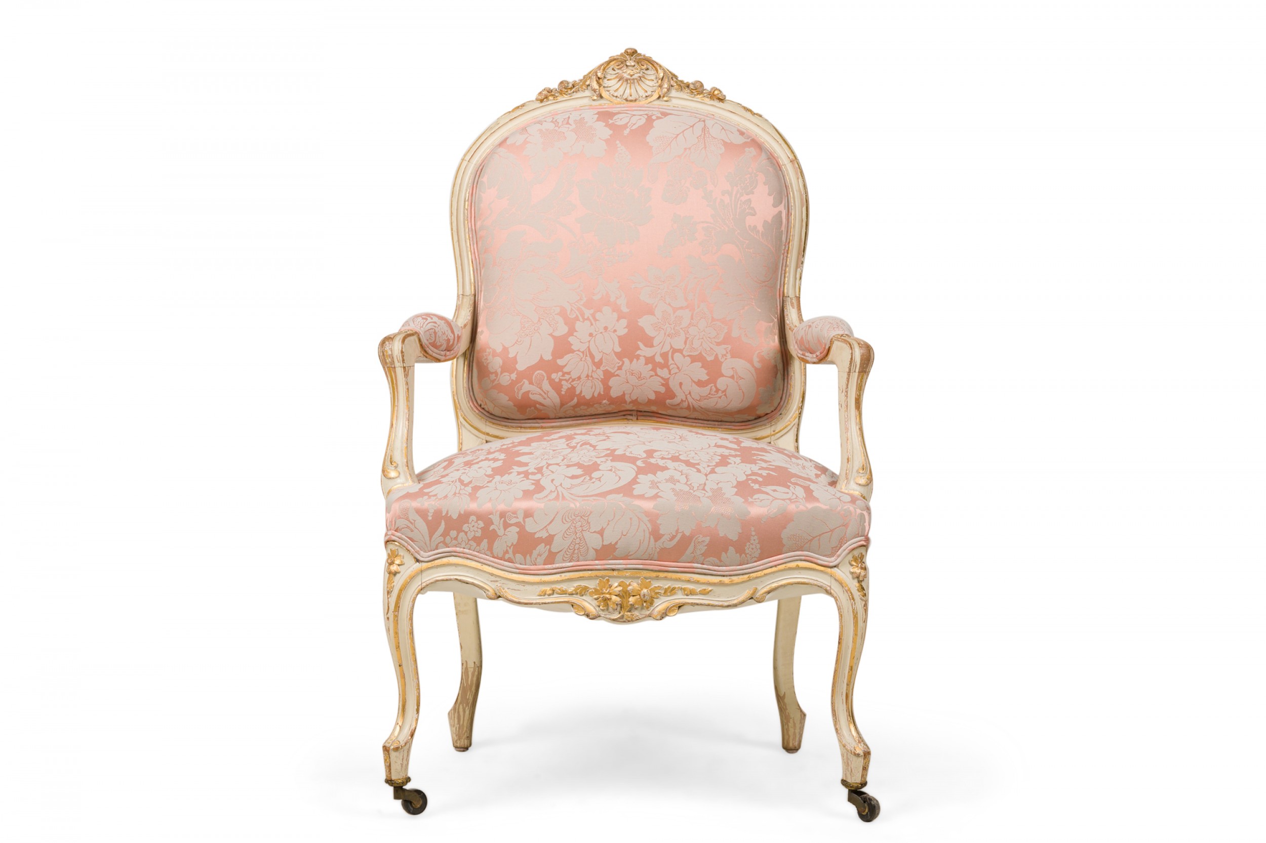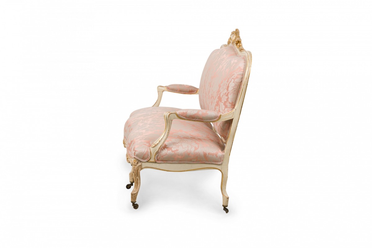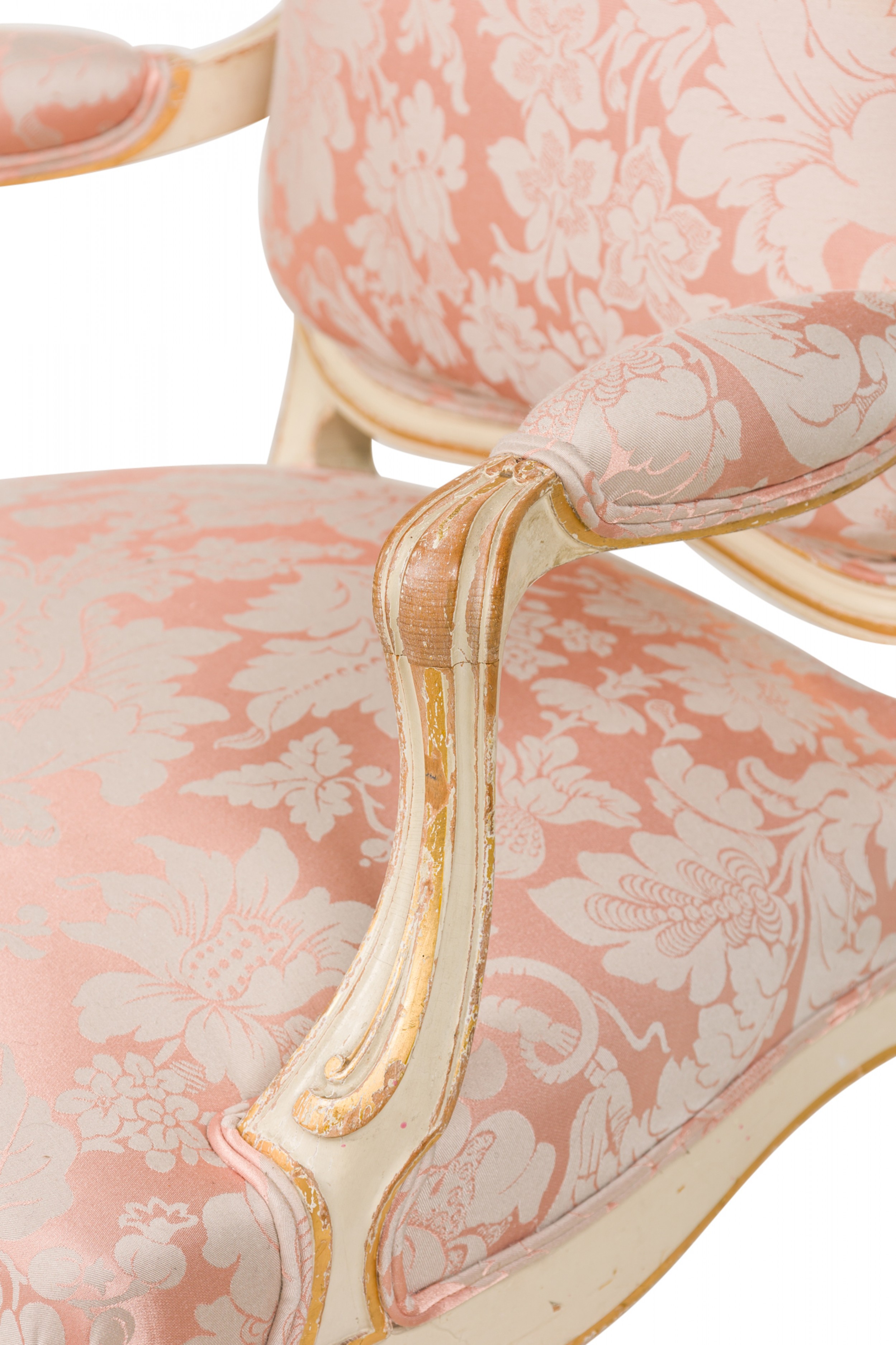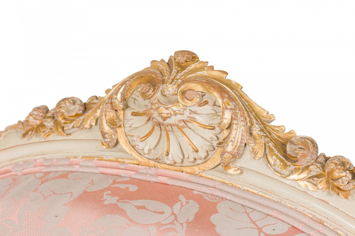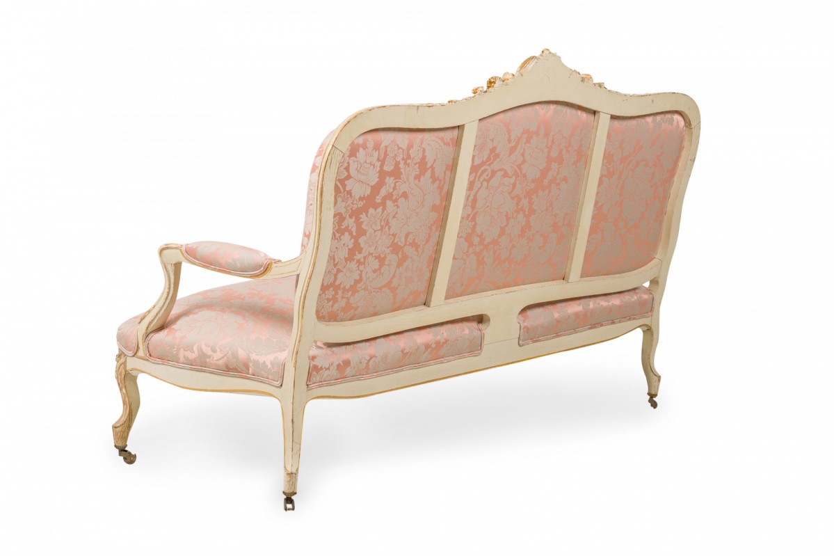 5 piece French Louis XV style (19th Cent) white and gilt painted living room set with carved back crests and complimentary upholstery (Available individually: Sofa: PPF295, 4 armchairs: PPF297)