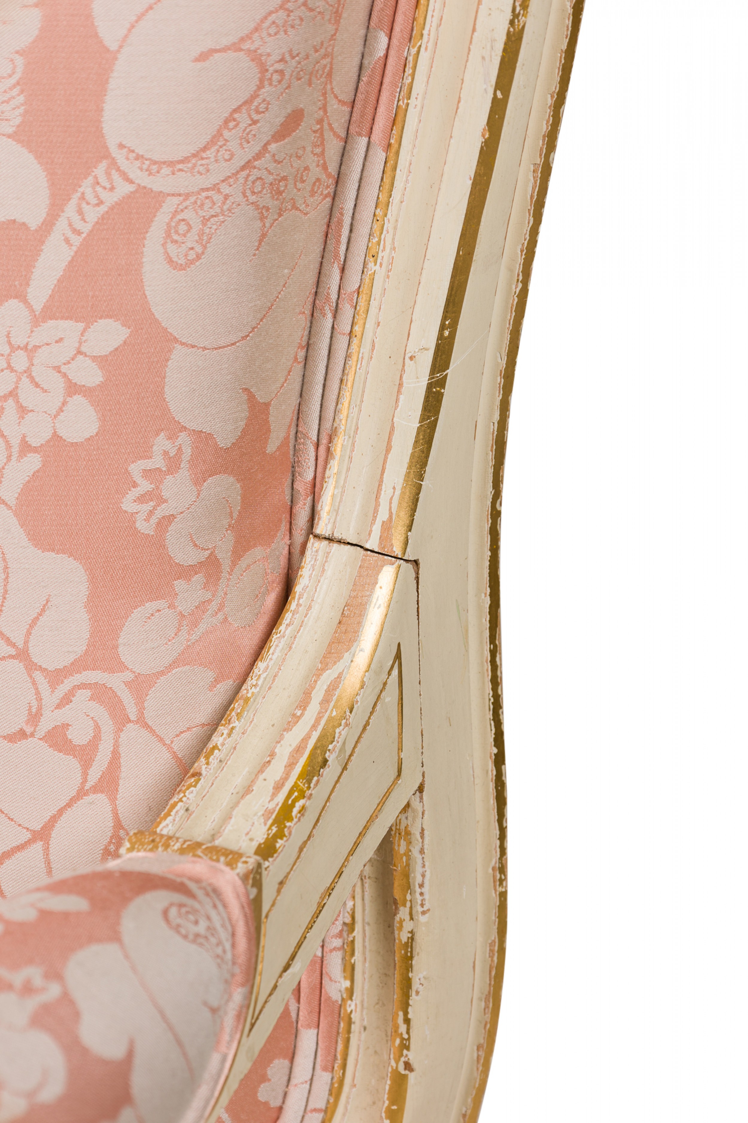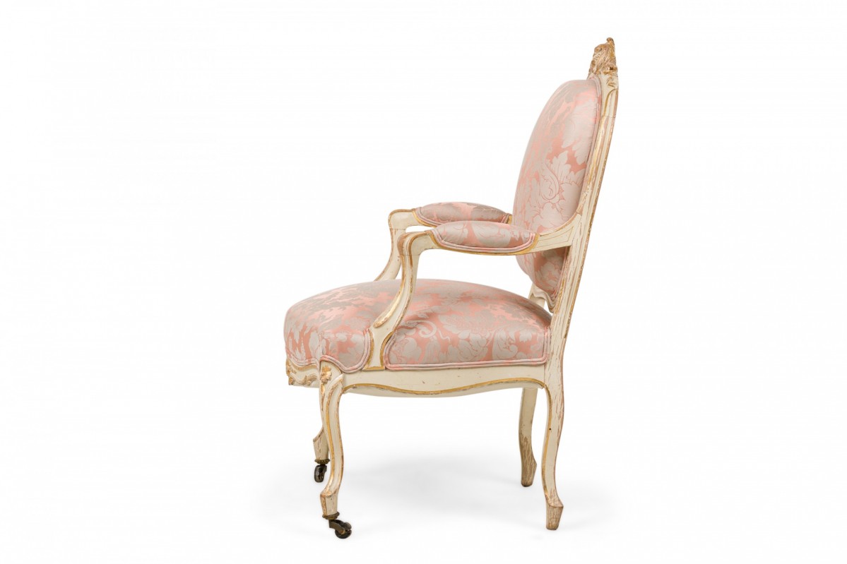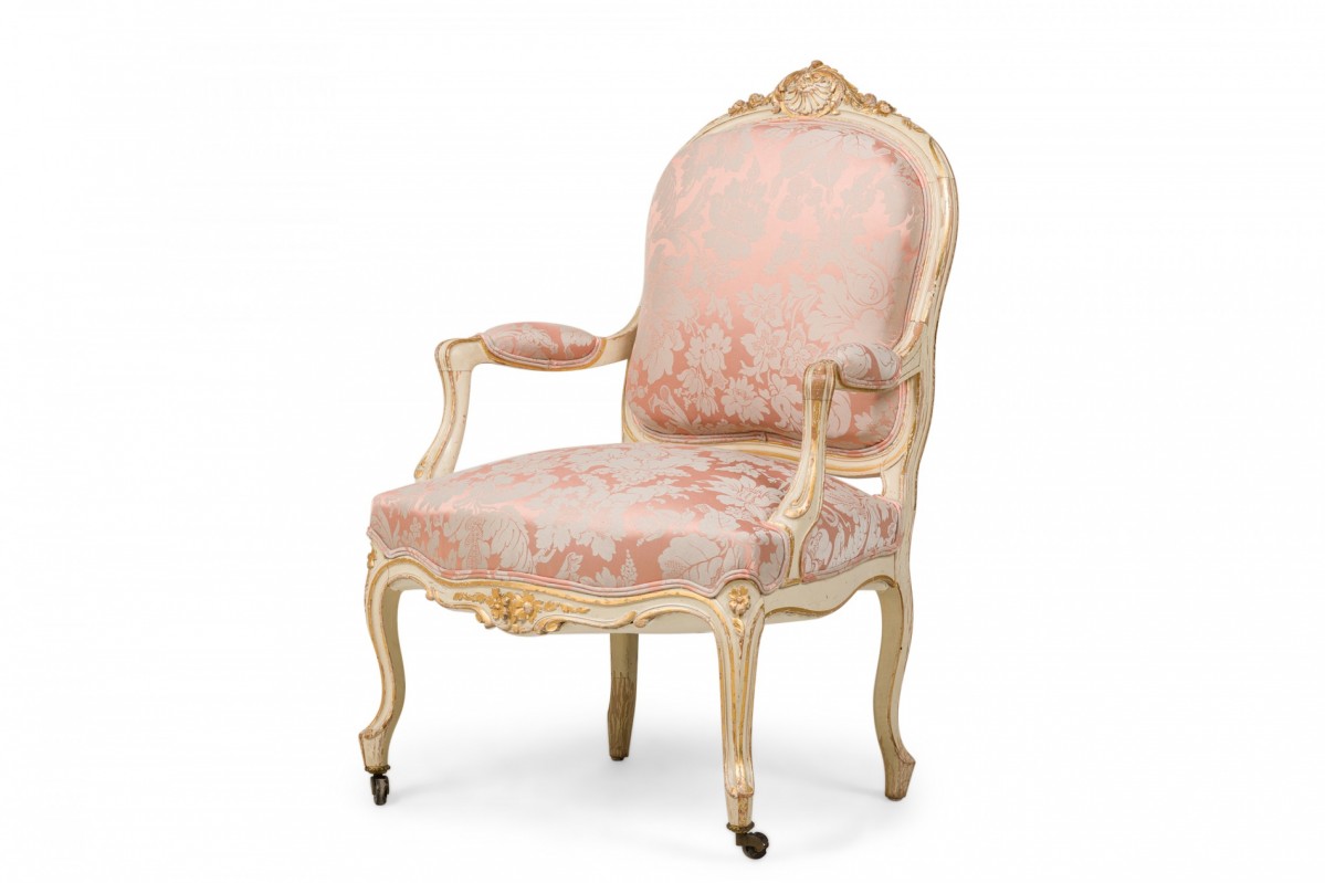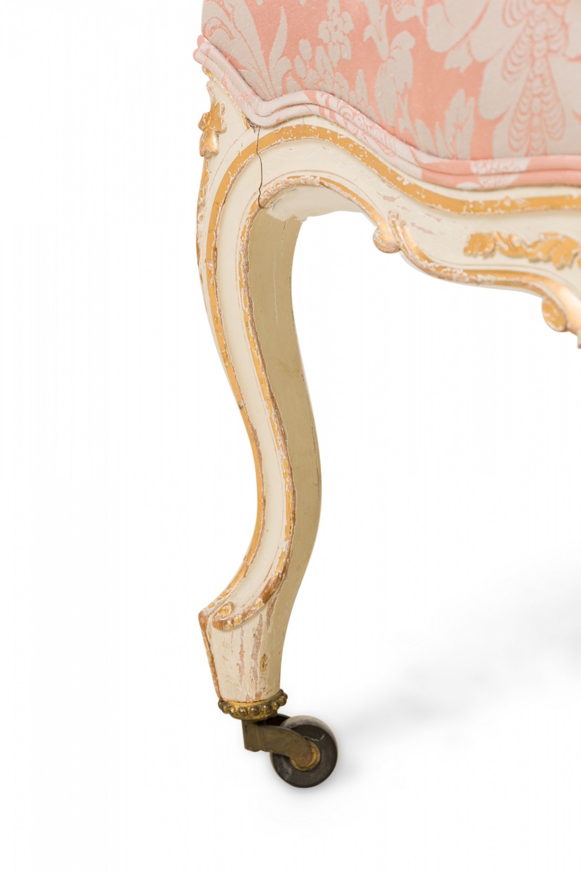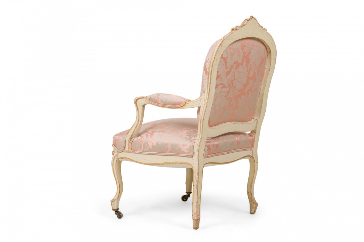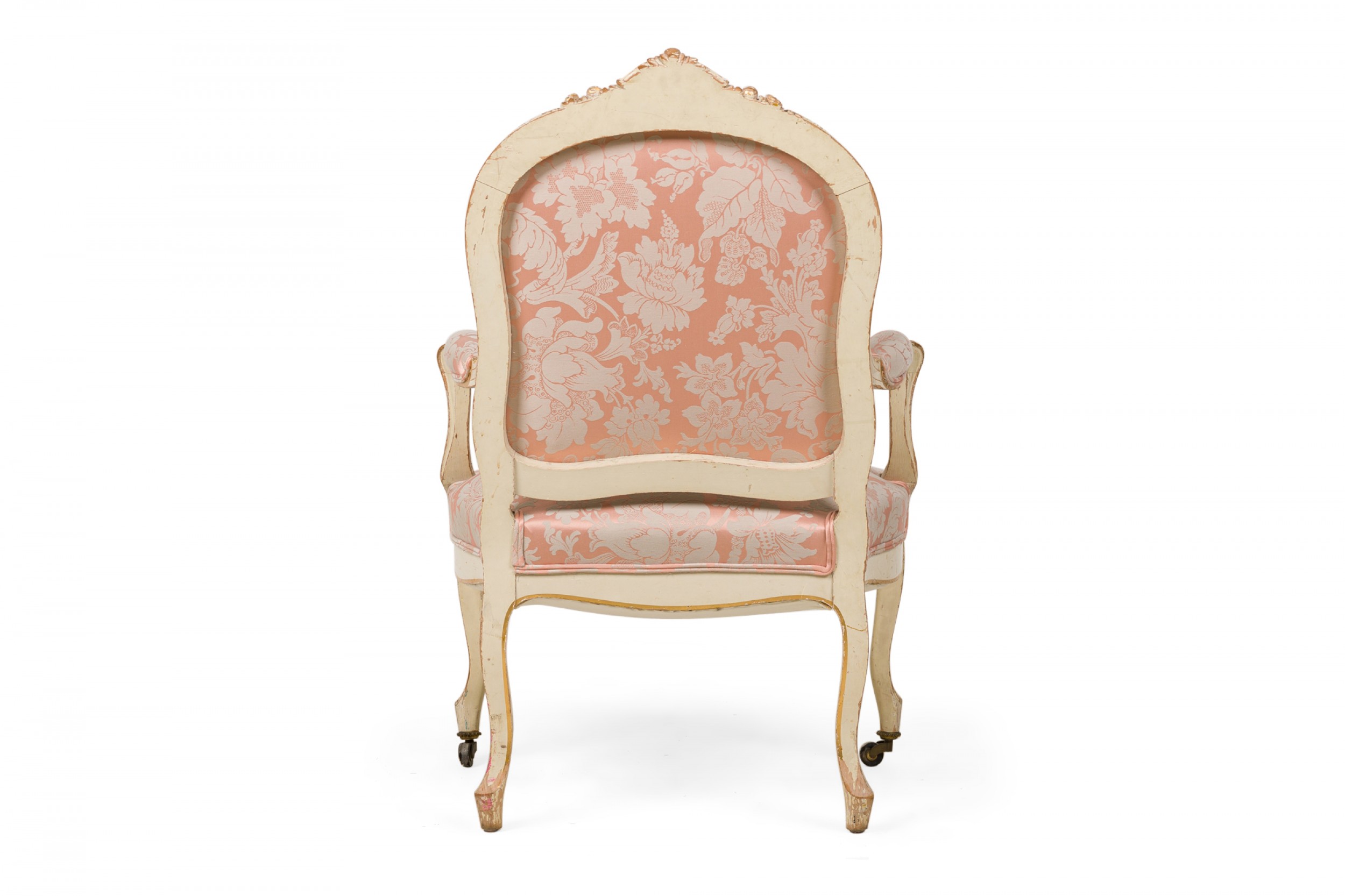 5 piece French Louis XV style (19th Cent) white and gilt painted living room set with carved back crests and complimentary upholstery (Available individually: Sofa: PPF295, 4 armchairs: PPF297)