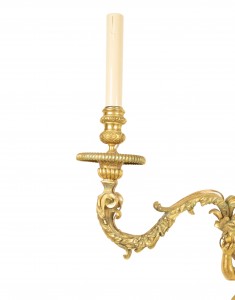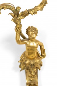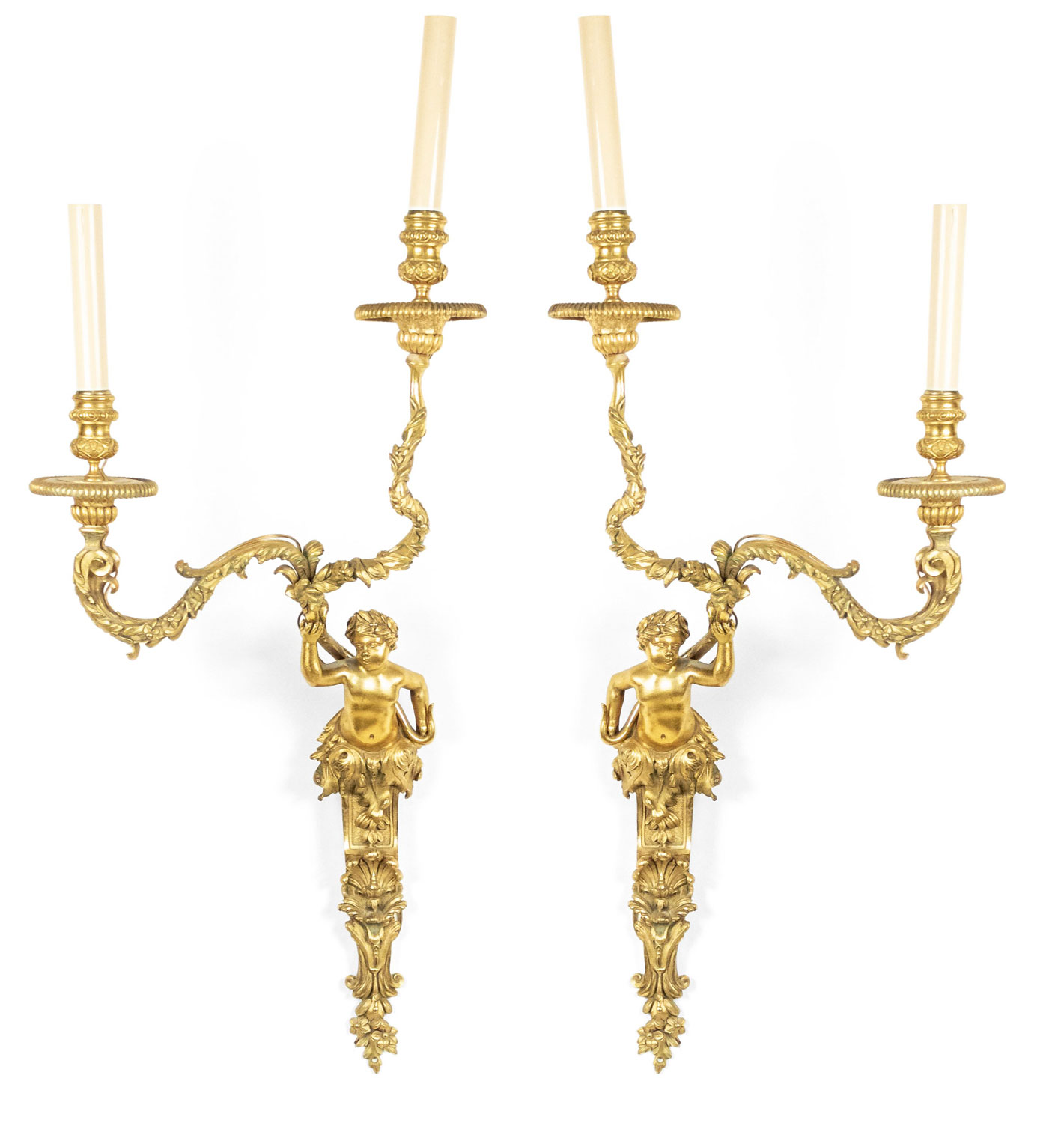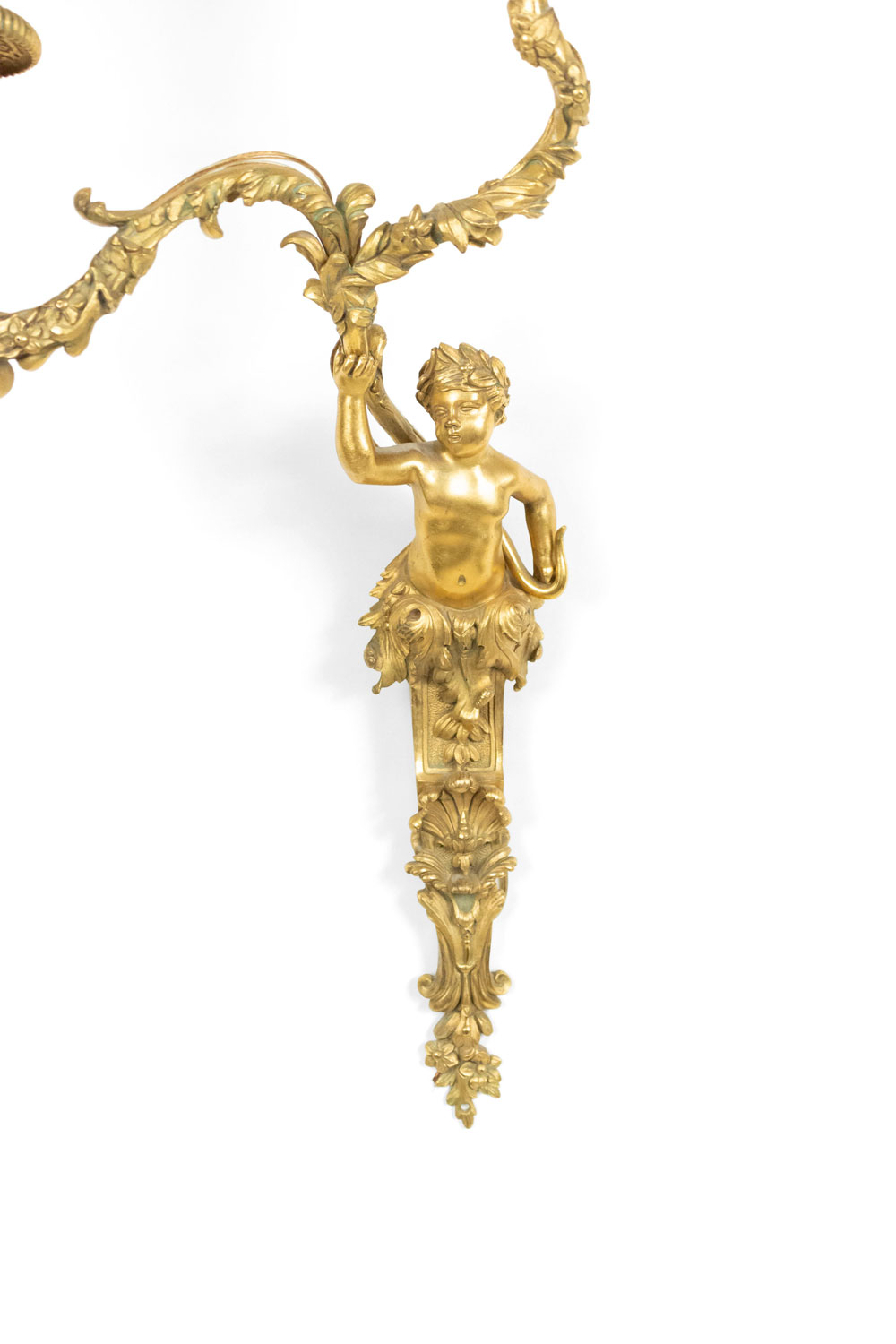 2 French Louis XV-style (20th Century) bronze dore wall sconces with two foliage-decorated arms supported by a cherub figure (PRICED EACH)
