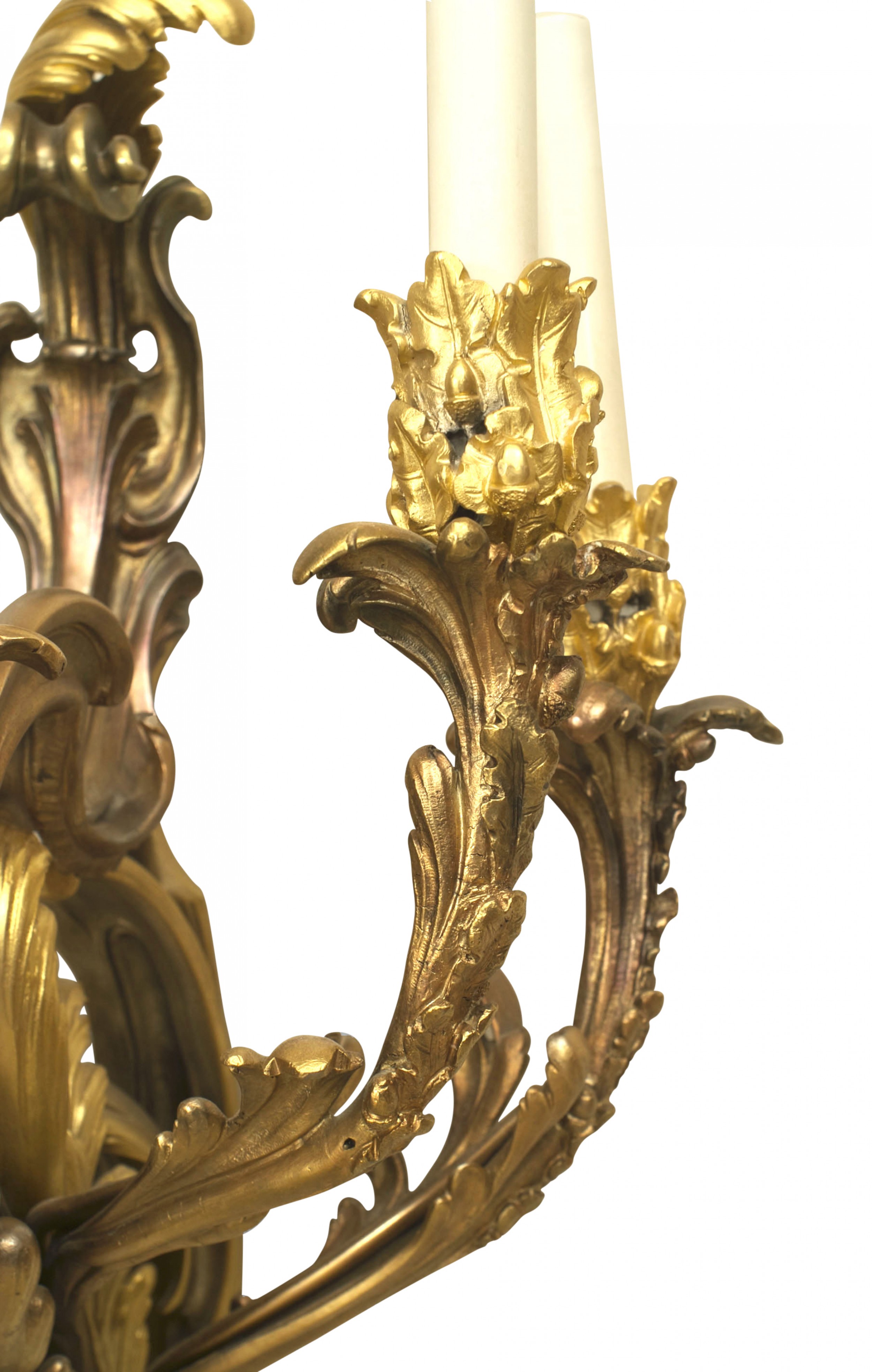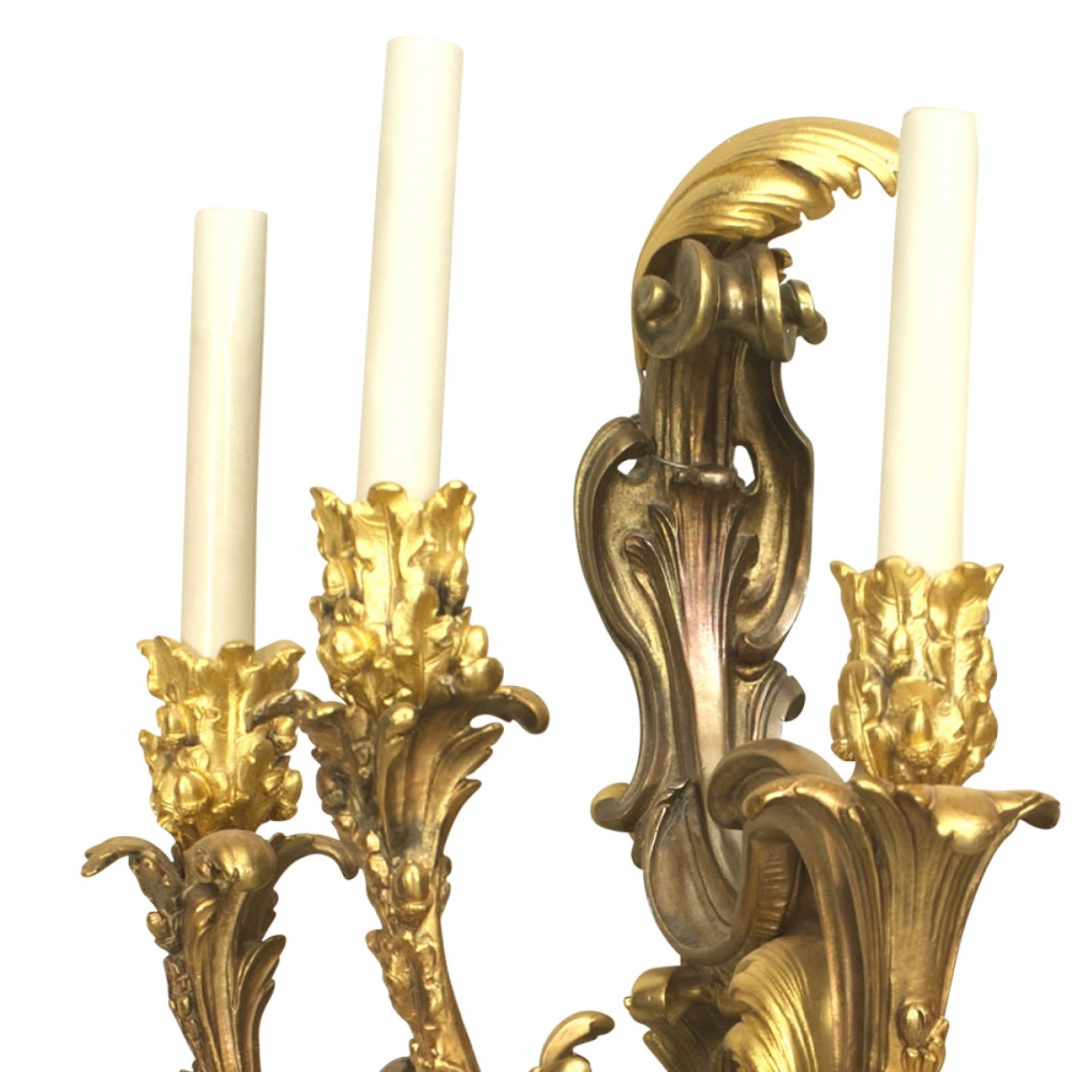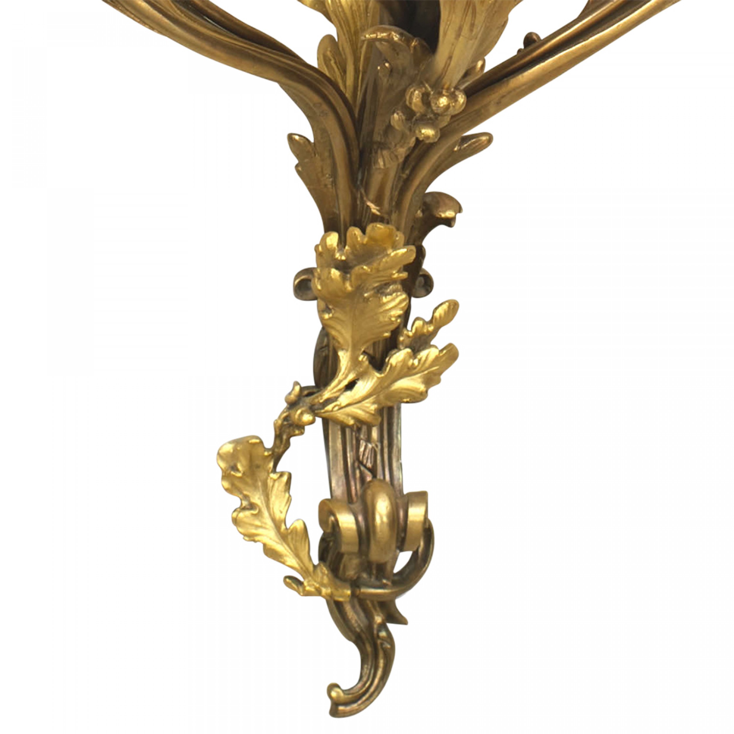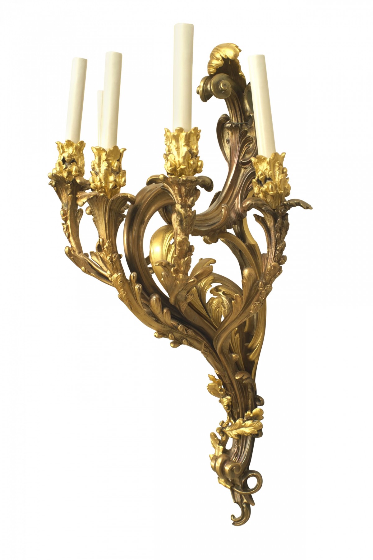 French Louis XV style (19/20th Century) gilt bronze wall sconce with five arms emanating from a scroll back with floral decoration.