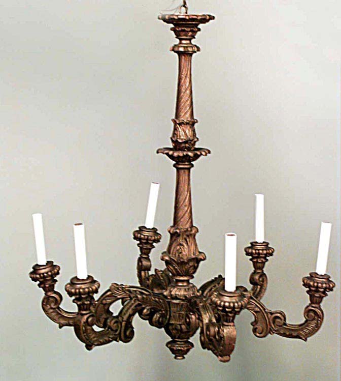 French Louis XV-style (20th Century) gold painted wood 6 scroll arm chandelier.