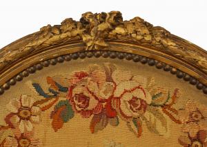 French Louis XVI-style (19th Cent) gilt oval back Aubusson upholstered loveseat (See also: 4 matching armchairs: 036907B)