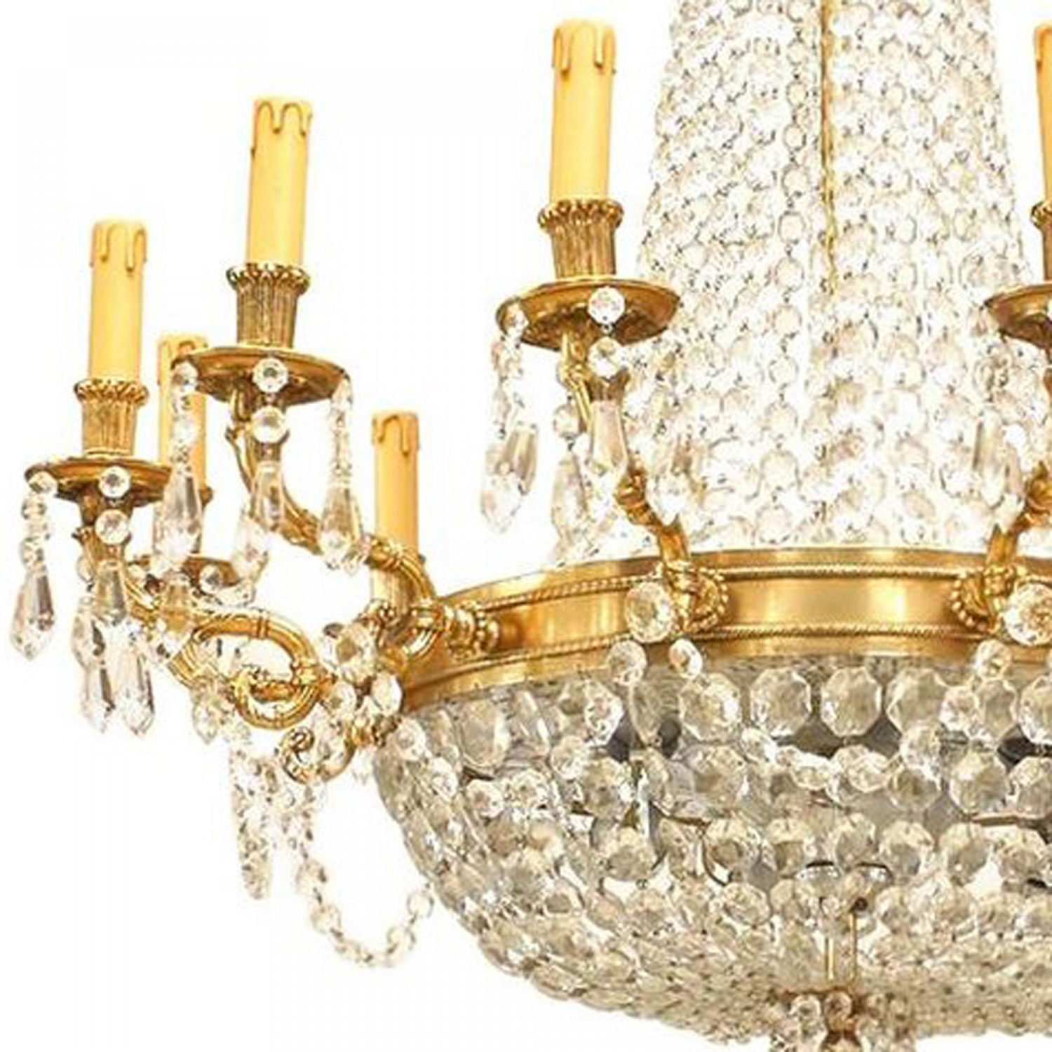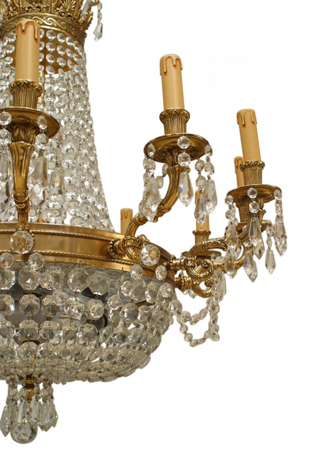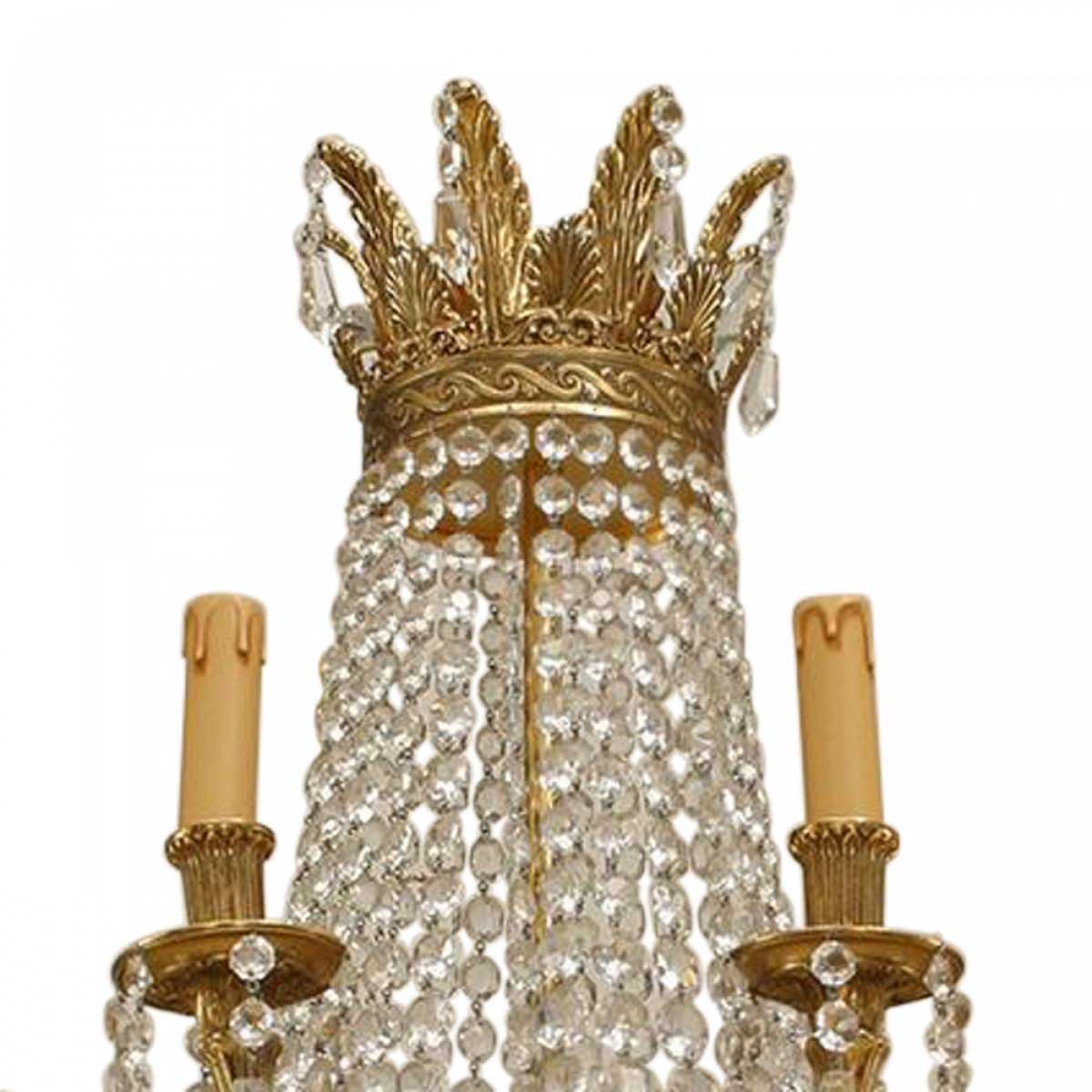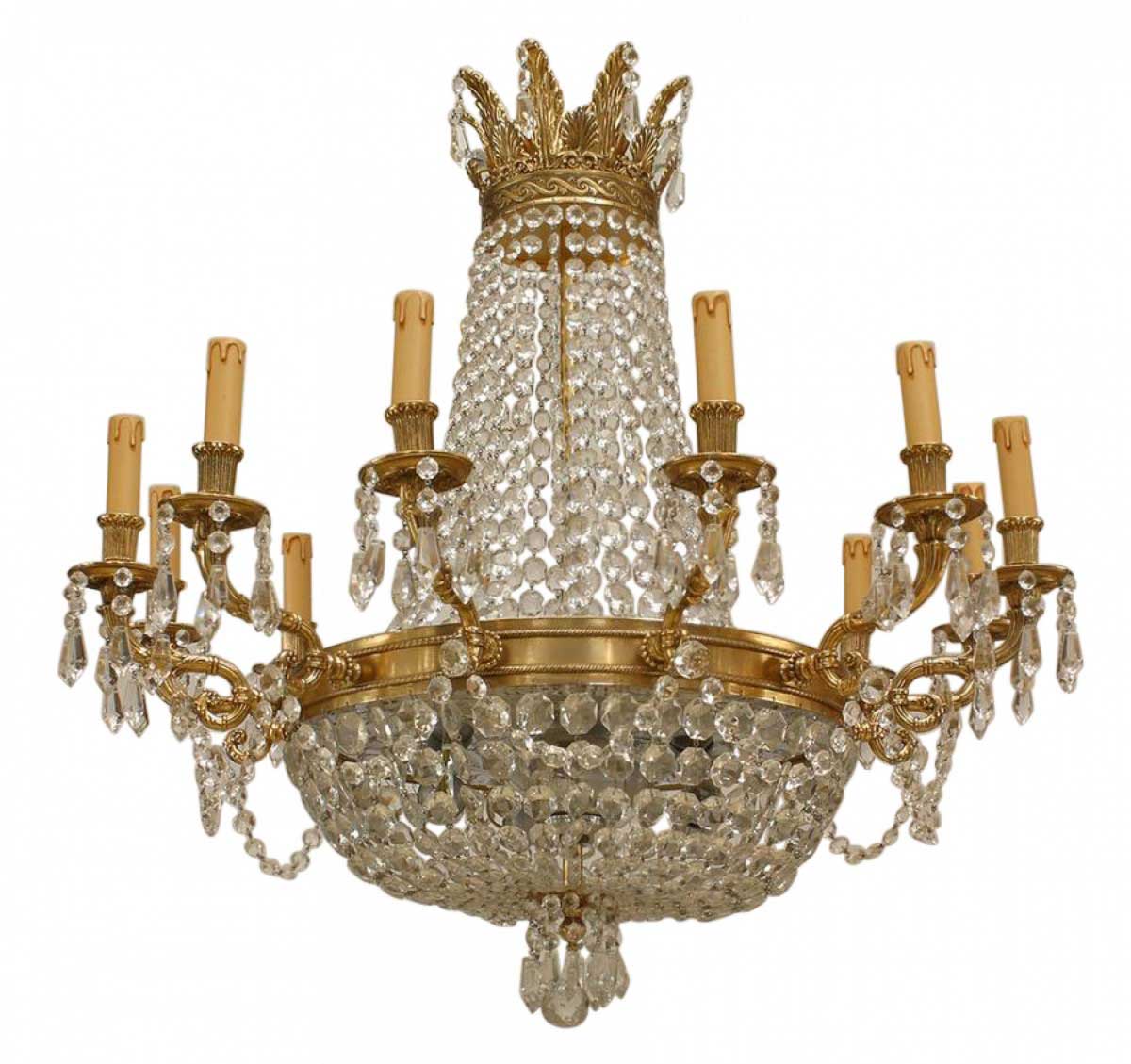French Louis XVI-Style chandelier with 12 arms supported by a bronze ring with multiple beaded crystal strands converging on a bottom finial and extending to top.