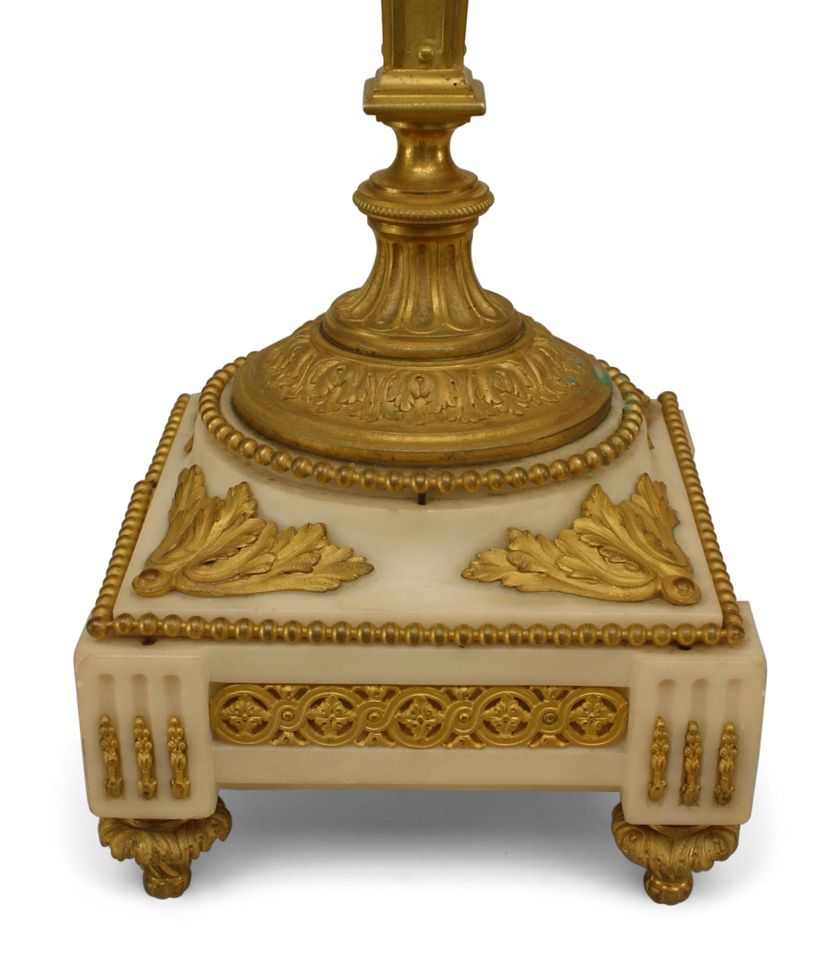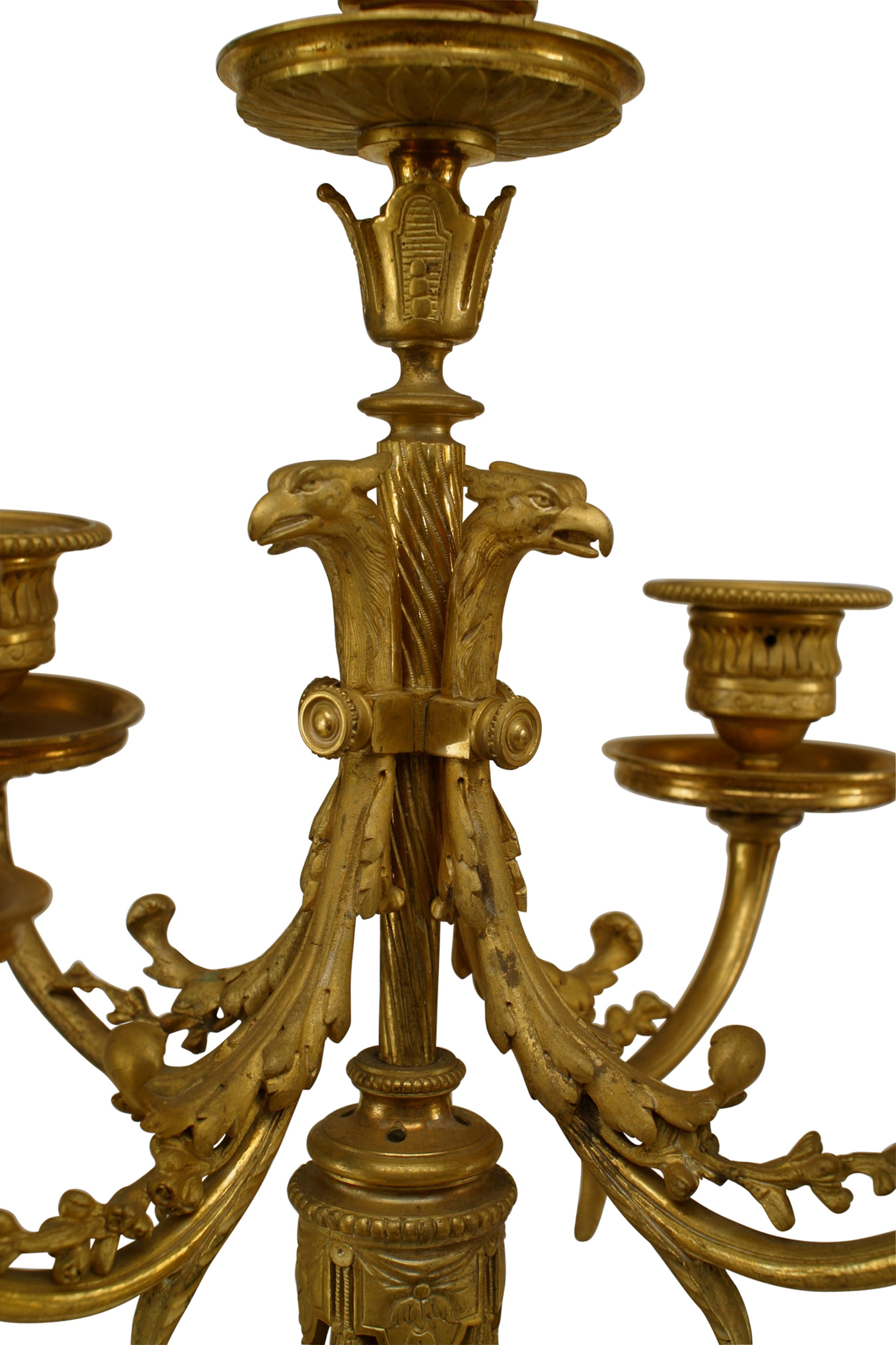 PAIR of French Louis XVI-style (19/20th Century) bronze dore eagle head 5 arm candelabra on square white marble base with bronze trim.