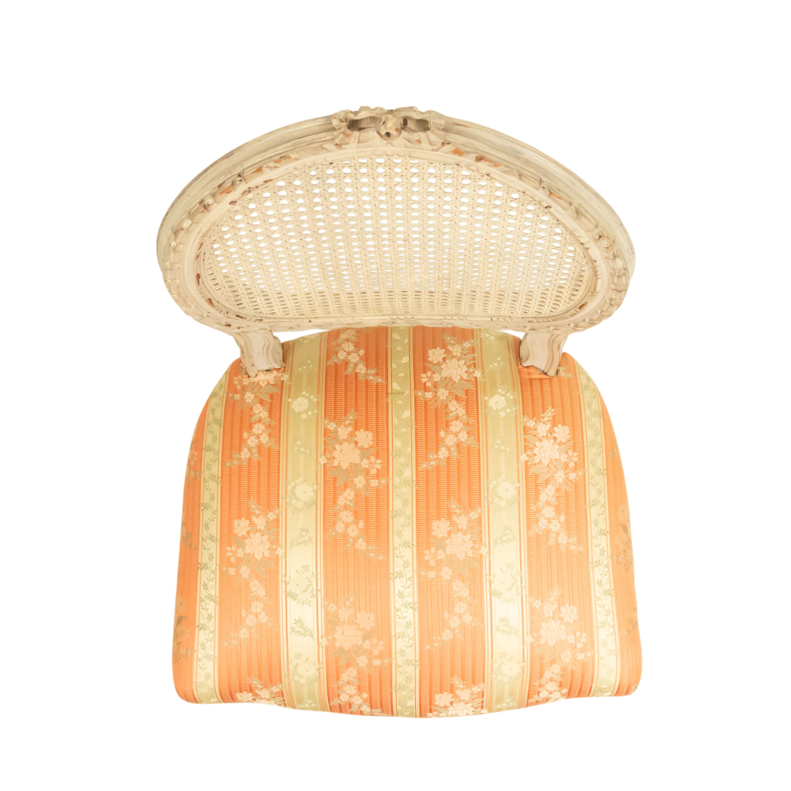 4 French Louis XVI style (20th Cent) cream painted side chairs with a carved bow knot top and an oval cane back and pink & cream floral damask seat. (PRICED EACH)