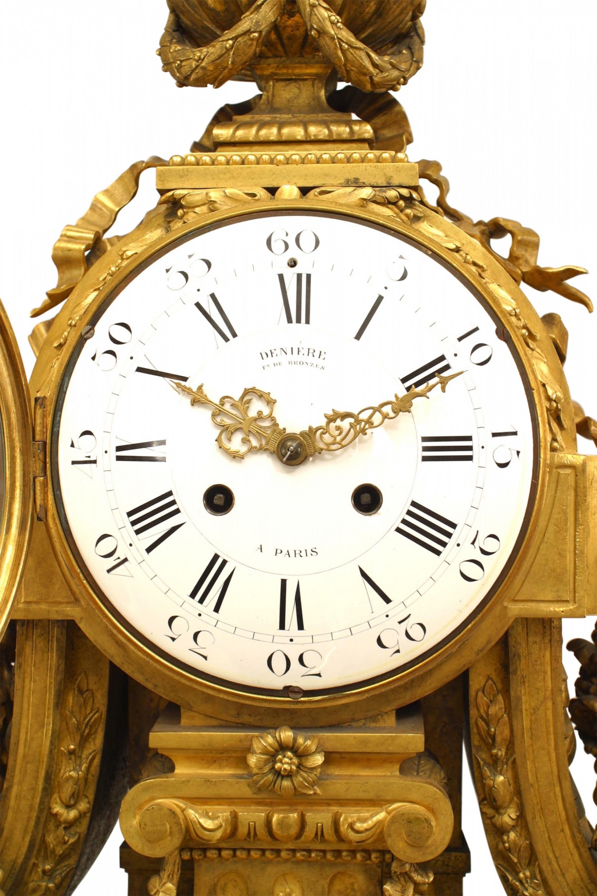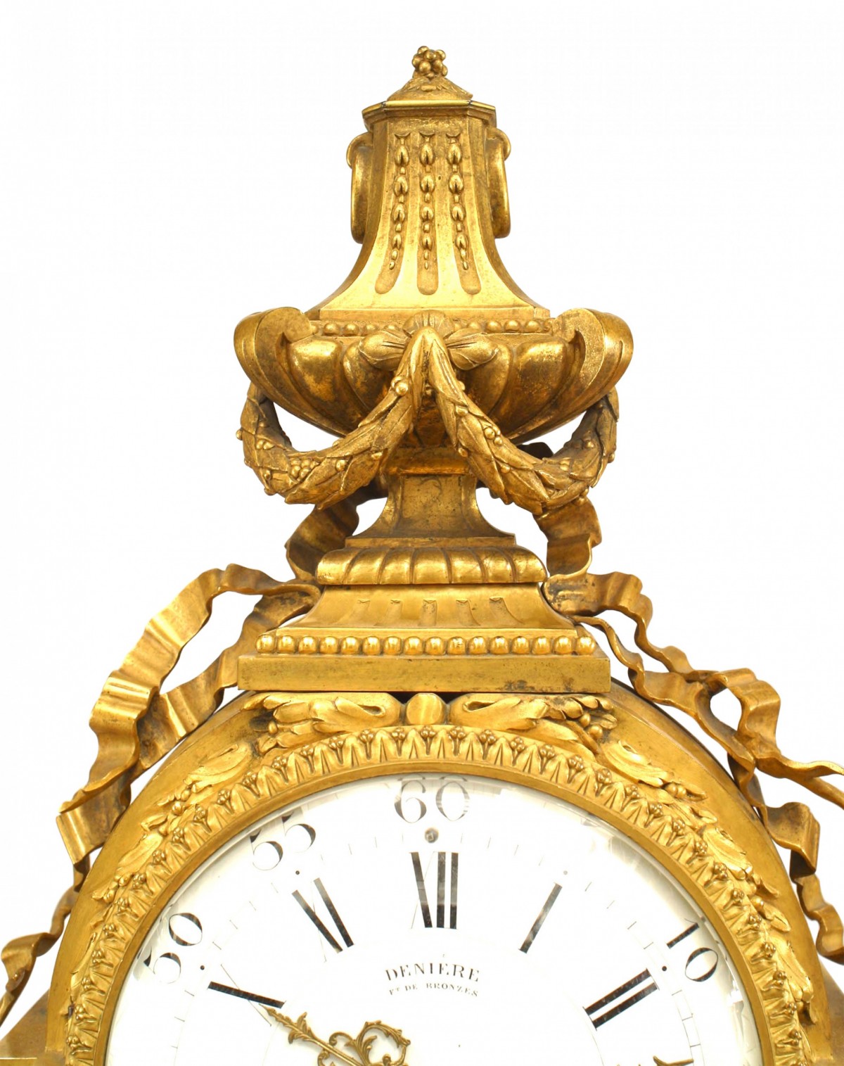 French Louis XVI-style (19th Century) gilt bronze mantle clock with a center fluted column supporting the clock face draped with a garland and an urn finial top (signed: DENIERE, PARIS) (Not working)